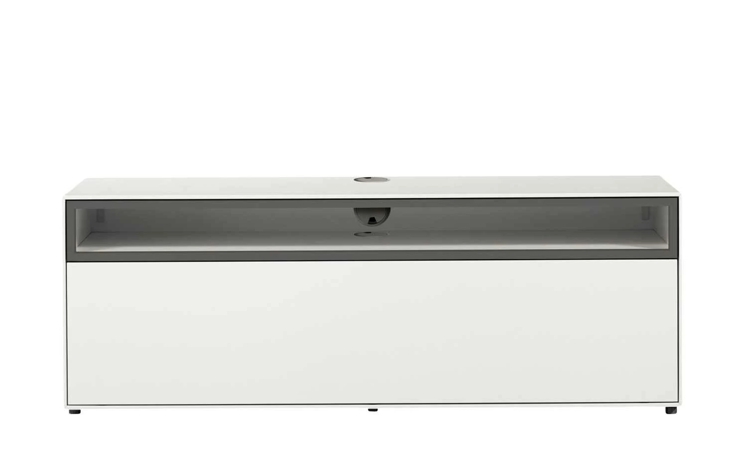 Das TV-Lowboard now! easy by hülsta ist genau richtig, um Ihrem Fernseher ein passendes Plätzchen zu geben. Außerdem hat es genau die richtige Höhe, um von der Couch aus bequem einen Film zu schauen. Im offenen Fach unter der Oberplatte finden Blu-Ray-Player oder Festplattenrecorder ihren Platz. Die Rückwand des Faches und die Oberplatte haben eine Öffnung für die Kabelführung. So vermeiden Sie unschönen Kabelsalat. Des Weiteren hat now! easy ein großes Fach mit Klappe. Das Lowboard ist reinweiß lackiert und hat eine kontrastreiche Absetzung in Grau.