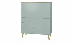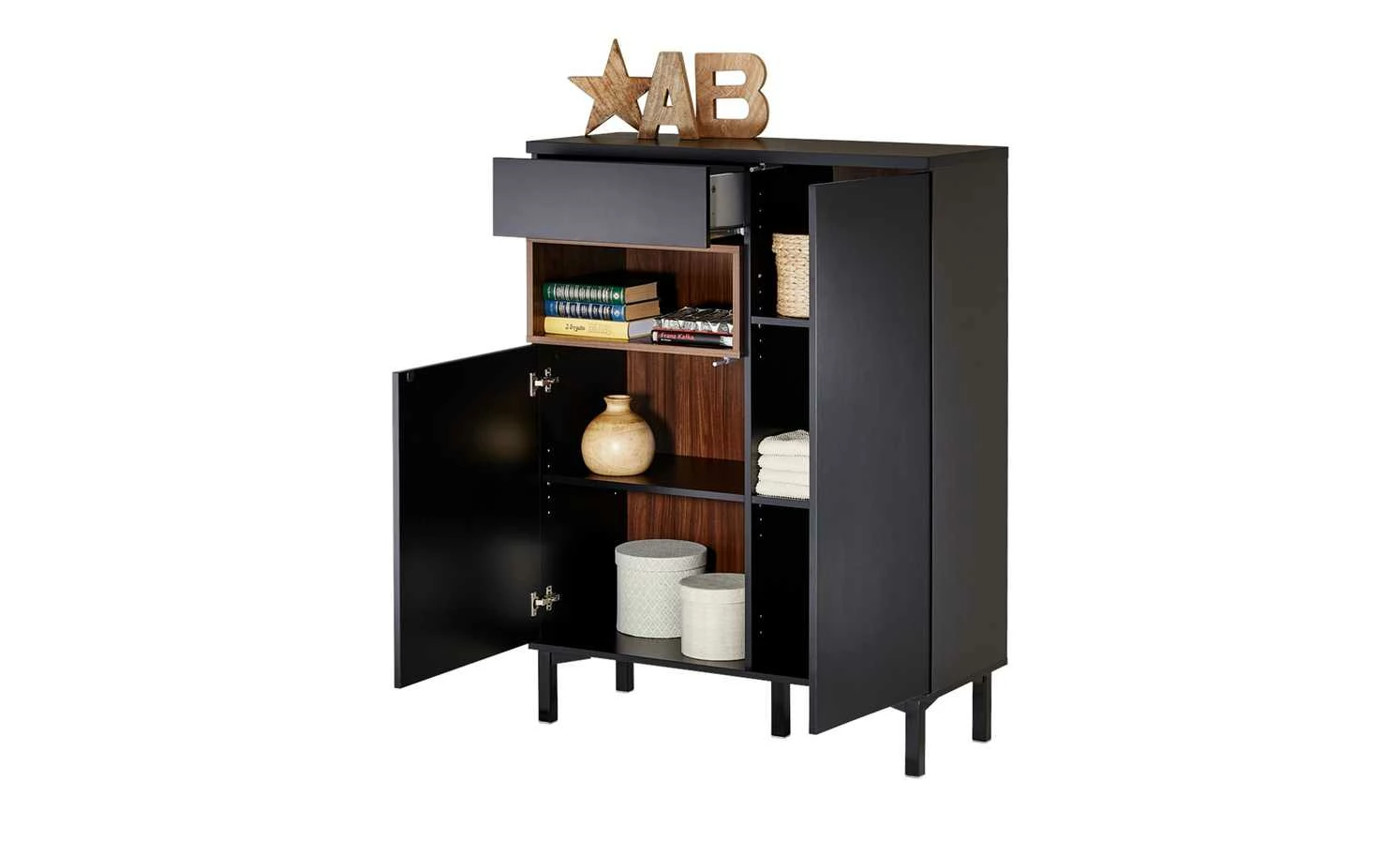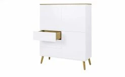 Gradliniges, cleanes Design und eine edle Farbgebung machen das Highboard Case aus. Das offene Fach auf der linken Seite ist farblich abgesetzt in einer Walnuss-Nachbildung. Oberhalb des offenen Faches bietet Ihnen eine Schublade Platz für Kleinigkeiten. Links stehen des Weiteren zwei Fächer mit Tür zu Ihrer Verfügung. Rechts hat Case eine große Tür, die sich über die gesamte Höhe des Highboards erstreckt. Hinter ihr sind drei Fächer. Türen und Schub öffnen Sie mithilfe der Push-to-Open-Funktion. So konnte auf Griffe verzichtet werden.