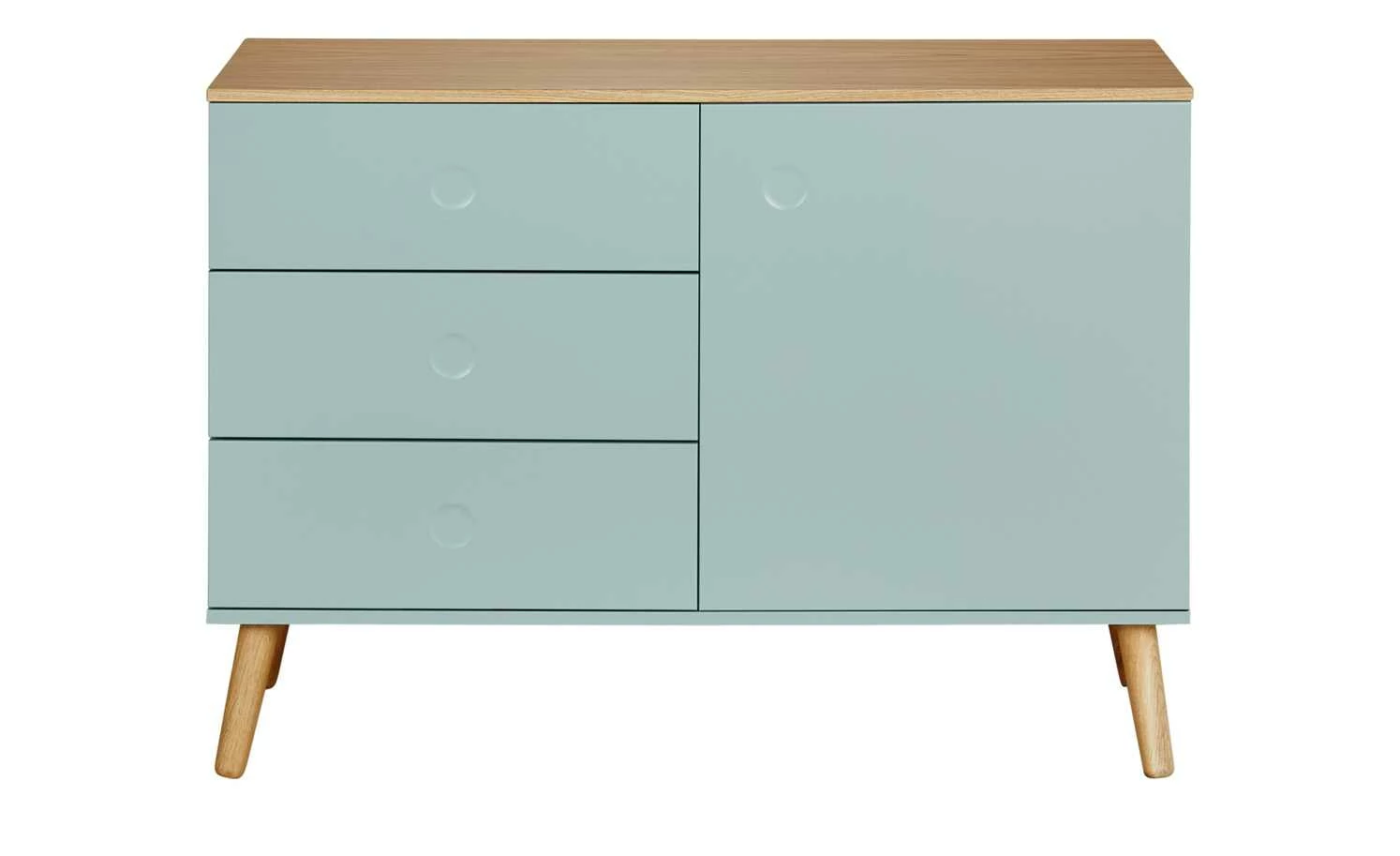 Retrostil und skandinavisches Design vereinen sich im Sideboard Scan. Der zarte Pastellton in Salbeigrün und die abgespreizten Retrofüße erinnern an den Stil der 50er-Jahre. Die Beine sind aus massiver Eiche und die Abdeckplatte ist mit dem gleichen Holz furniert worden. So setzen sich beide schön von der farbig lackierten Oberfläche ab. Auf Griffe wurde bewusst verzichtet. An der Stelle, an der die Griffe sein könnten, wurde die Oberfläche leicht eingedellt. Hier brauchen Sie einfach nur leicht zu drücken, schon gehen Schubfächer und die Tür auf. Möglich macht das die sogenannte Push-to-Open-Funktion. Scan bietet Platz in zwei Fächern mit Tür und drei Schubladen.