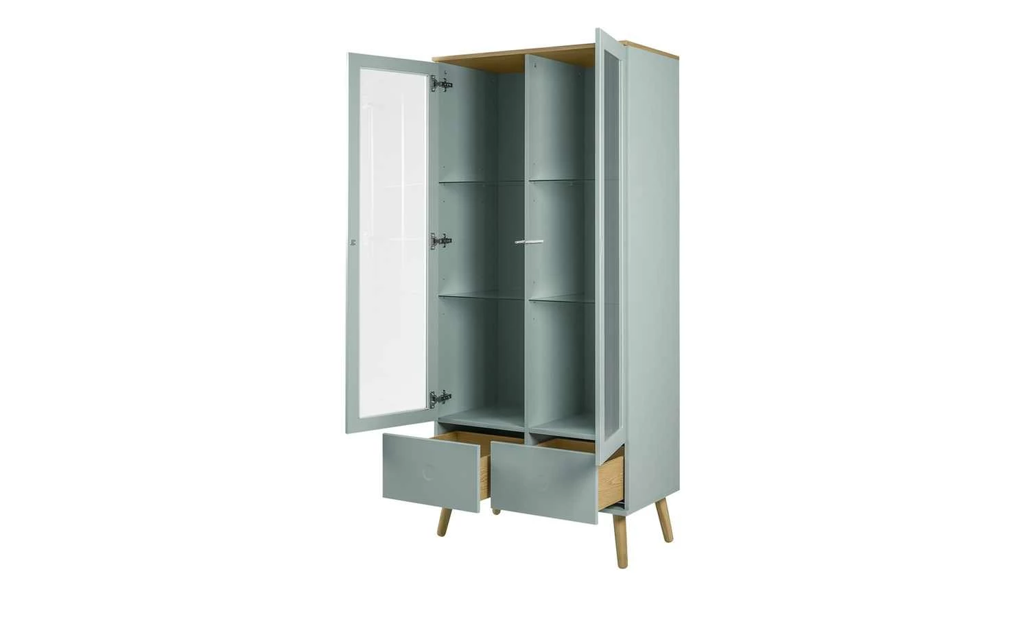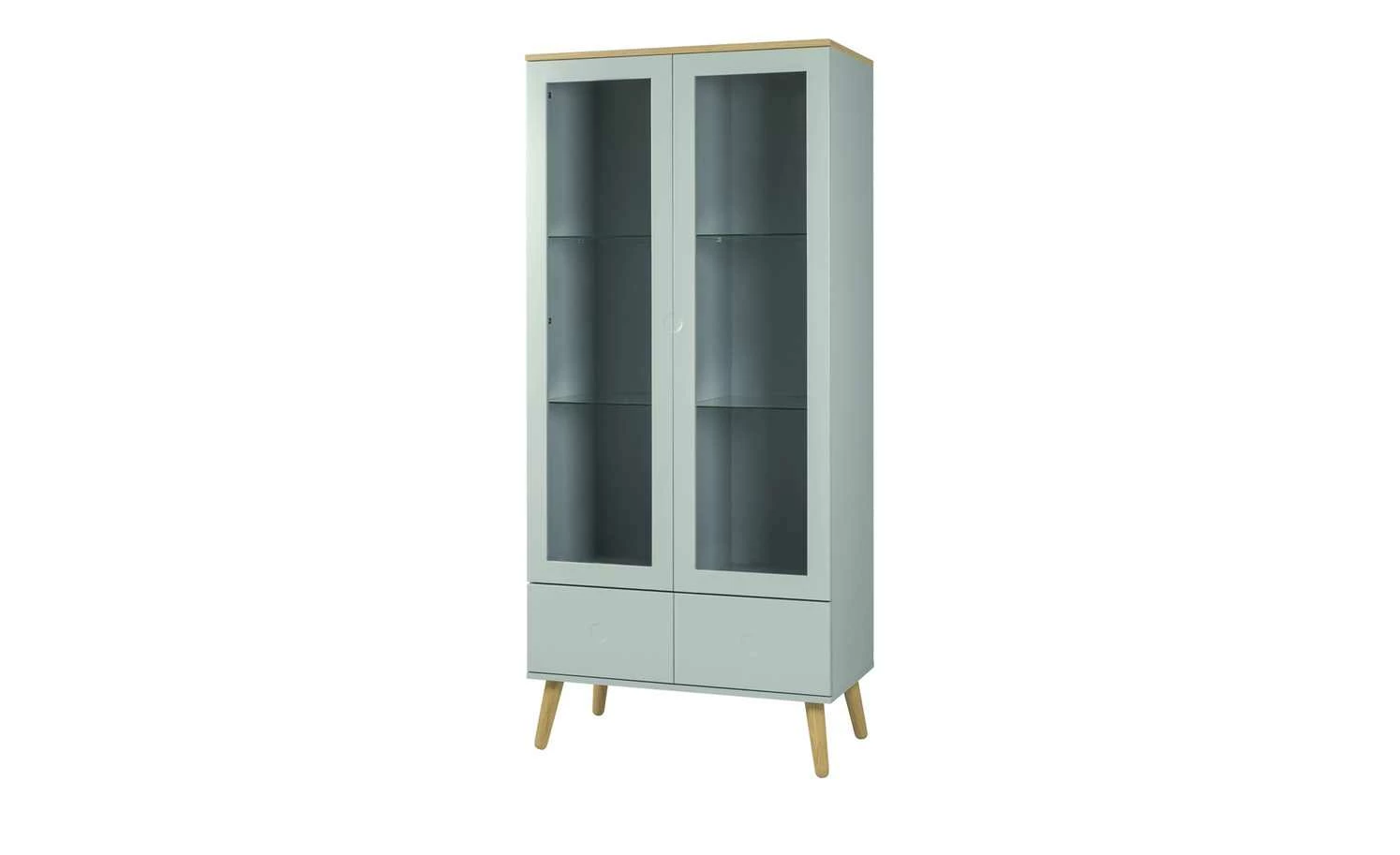 Die Standvitrine Scan hat einen angesagten skandinavischen Look. Damit passt sie wunderbar zu den anderen Modellen der Serie Scan. Der salbeigrüne Farbton wird durch Akzente in Eiche Natur abgesetzt. Die stabilen schlanken Füße sind aus massiver Eiche. Die Abdeckplatte ist mit Eichenholz furniert. Beide Vitrinentüren sind mit Klarglas abgesetzt. So erhalten Sie einen freien Blick in die sechs Vitrinenfächer und deren Inhalt. Zusätzlich verfügt Scan über zwei Schubkästen. Dank der sogenannten Push-to-Open-Funktion konnte auf störende Griffe verzichtet werden.