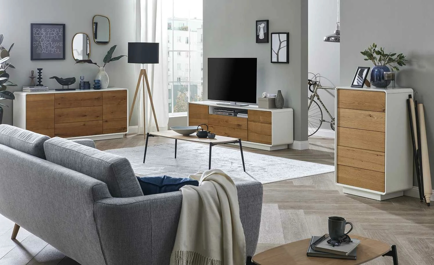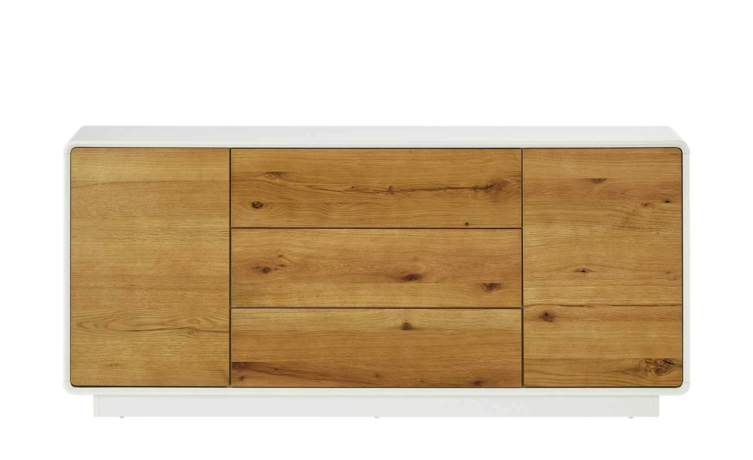 Das Sideboard Bruneck setzt auf Kontraste. Es hat eine natürlich-charmante Front, die mit Asteiche furniert ist. Das Holz verfügt über eine stark ausgeprägte Maserung mit diversen Farbnuancen und Asteinschlüssen. Damit das Naturmaterial besonders schön zur Geltung kommt, wurde auf Griffe verzichtet. Türen und Schubladen sind mit einer Push-to-Open-Funktion ausgestattet, bei der Sie auf die Front der beiden Türen und drei Schübe drücken, um sie zu öffnen. Für den Korpus ist ein schlichtes Weiß mit mattem Finish verwendet worden.