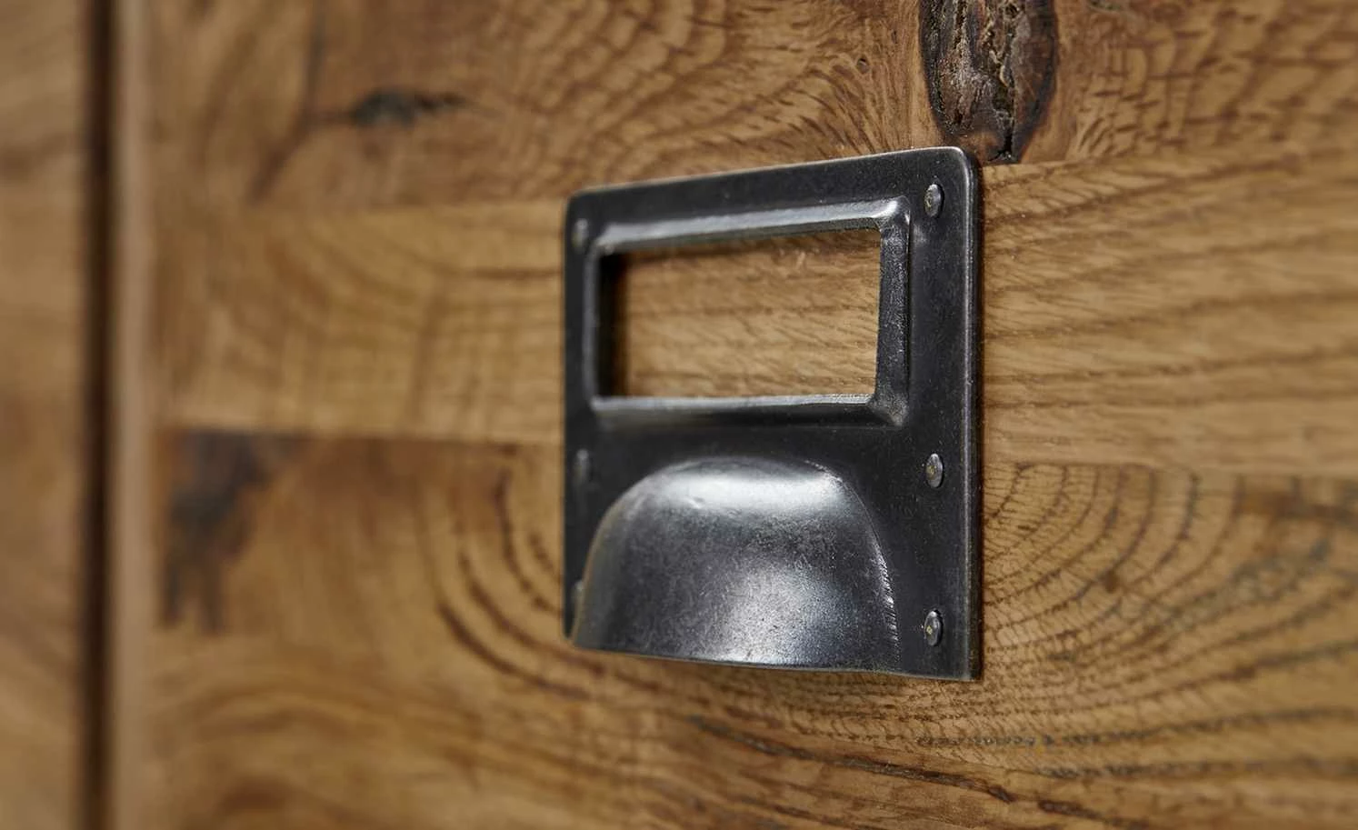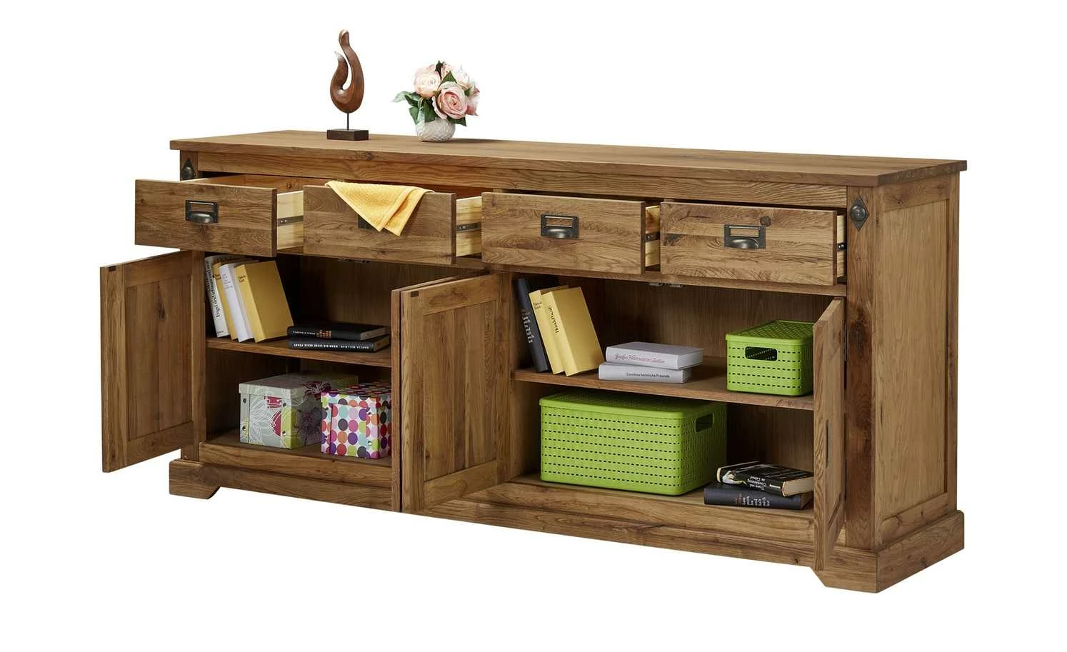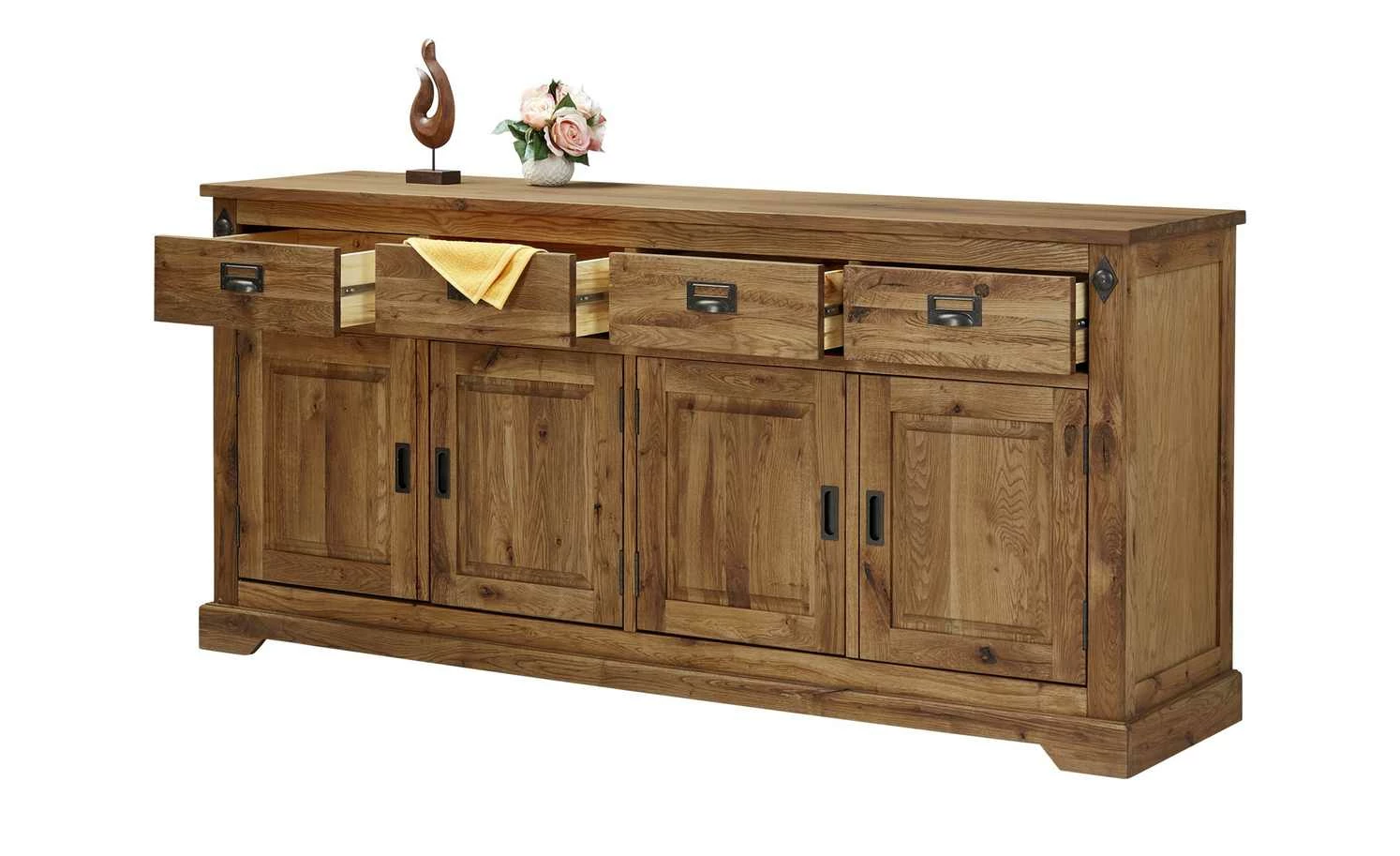 Lassen Sie sich vom rustikalen Look des Sideboards Freddy überzeugen! Rahmen, Abdeckplatte und Front bestehen aus massiver Eiche. Der Korpus und die Einlegeböden sind mit dem gleichen Eichenholz furniert. Um die Oberfläche zu schützen, wurde diese geölt. Gleichzeit ist so ein ansprechender Antik-Look entstanden, der Freddy eine extravagante Note gibt und die natürliche Holzbeschaffenheit unterstützt. Besondere Highlights sind auch die Eisenbeschläge und Apothekergriffe aus Eisen. Vier Schubfächer und vier Fächer sorgen für ausreichend Stauraum.