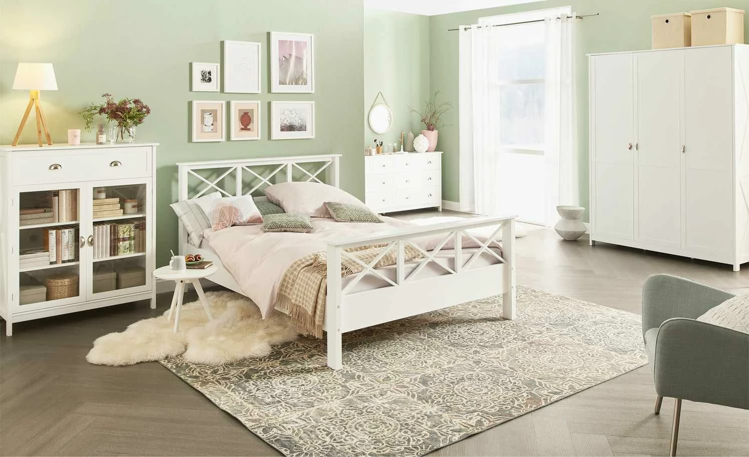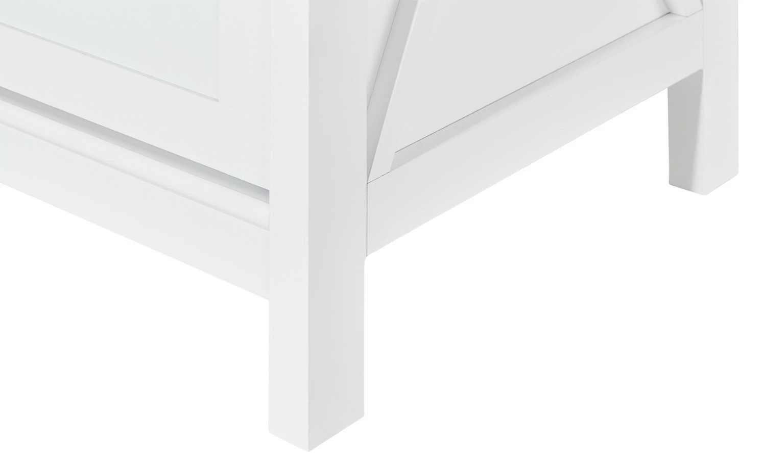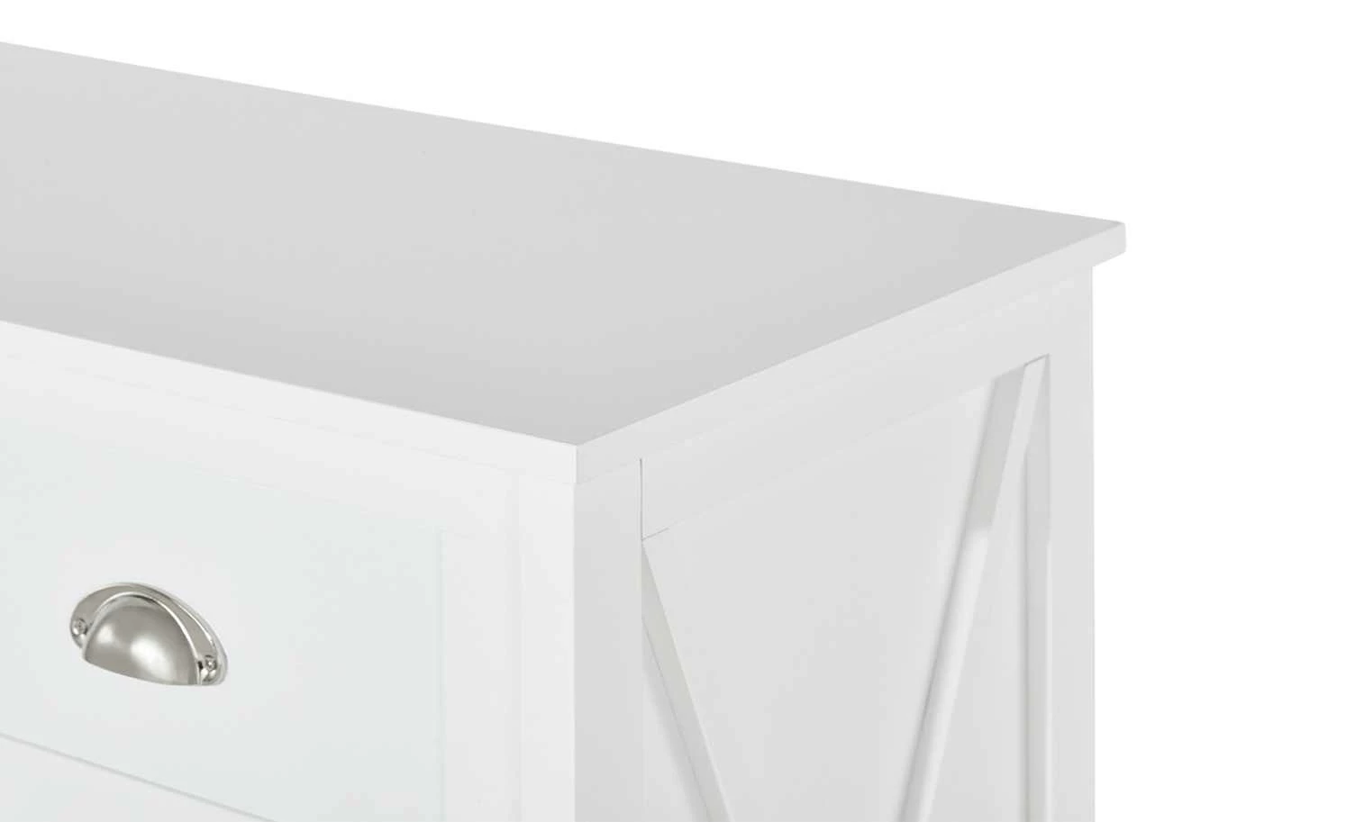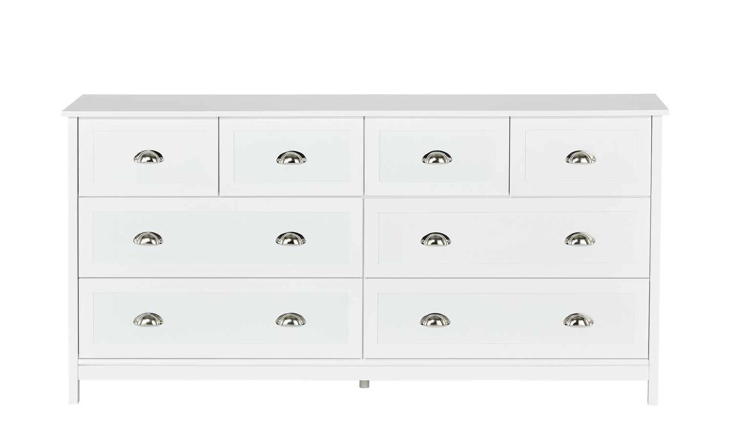 Das Sideboard Mosi zaubert Landhausflair in Wohnraum oder Schlafzimmer. Ein dekoratives Gestaltungsmerkmal sind die Streben in X-Form an den Seiten. Für Akzente sorgen die Apothekergriffe aus glänzendem Metall. Sie heben sich von der weißen Lackoberfläche ab. Mosi ist mit vier kleineren und vier größeren Schubfächern ausgestattet. Die kleinen Schubladen sind im oberen Teil der Kommode angeordnet; die großen darunter.