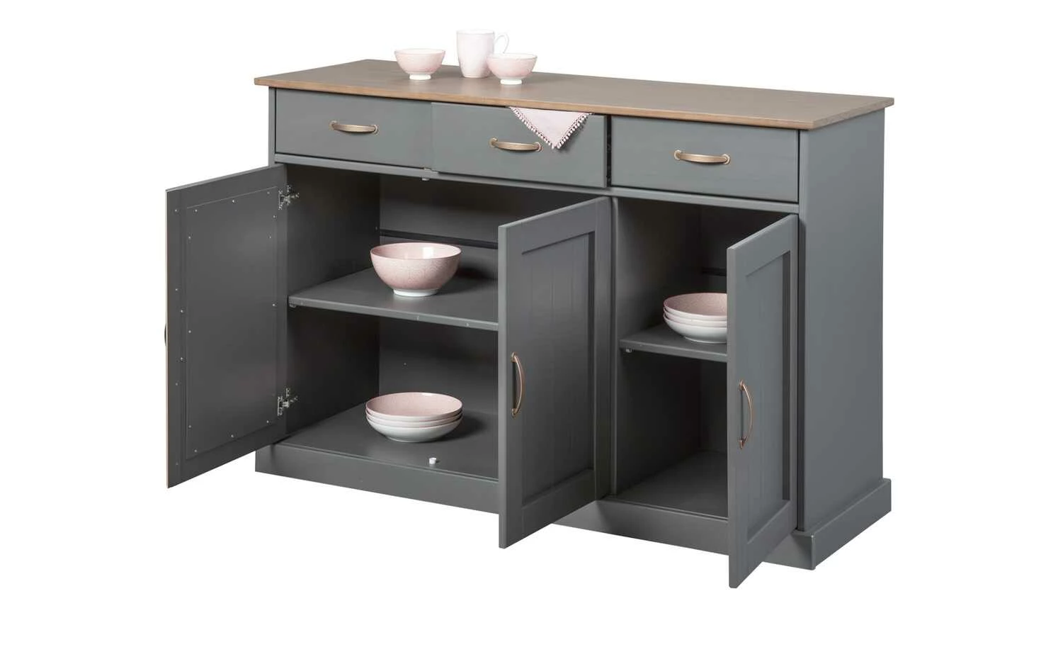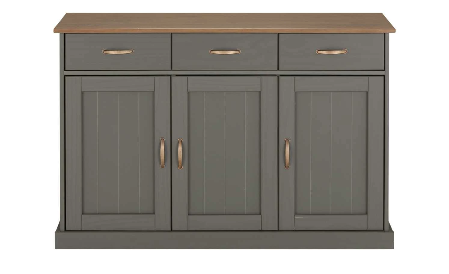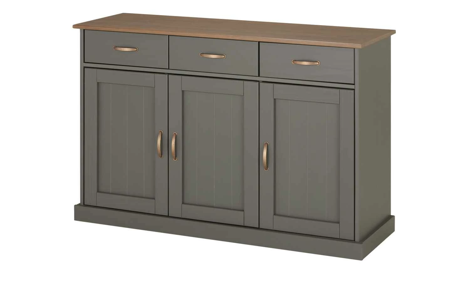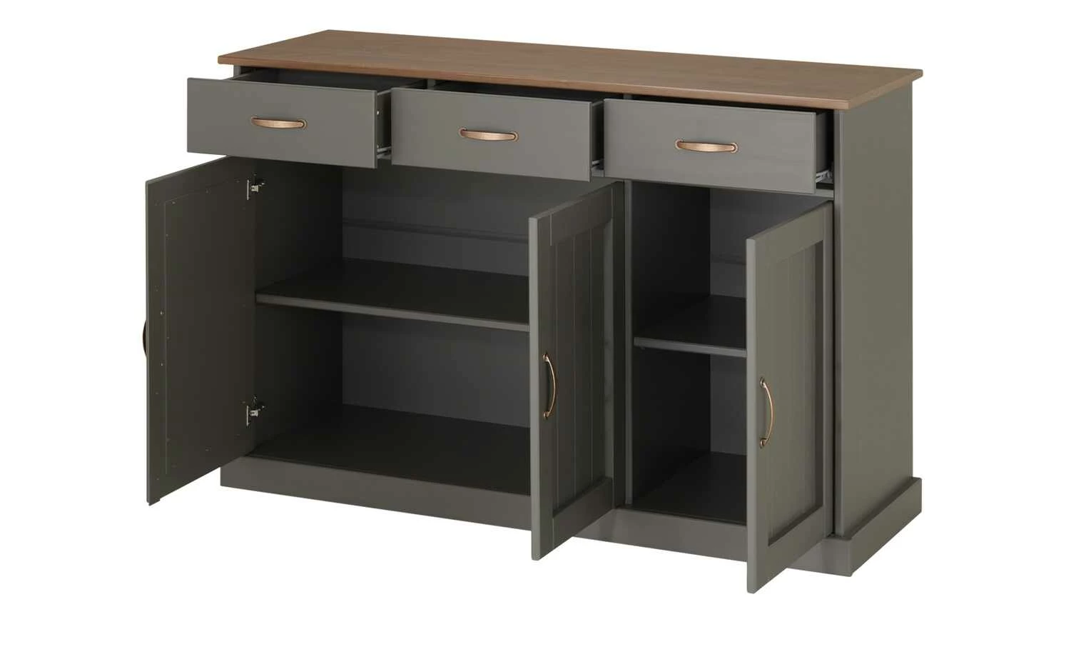 Mit dem Landhausstil können Sie Räume besonders wohnlich und nostalgisch einrichten. Zum Beispiel auch mit dem Sideboard Muslone, das im Landhausstil designt ist. Zu den Verzierungen gesellt sich ein schöner weißer oder grauer Farbton, der durch Akzente in Kiefer Braun abgesetzt wird. Korpus, Front und Böden sind aus massiver Kiefer gefertigt. Alle Oberflächen sind hochwertig lackiert. Muslone bietet Ihnen neben der Optik natürlich auch Stauraum. Und zwar in drei Schubladen und hinter drei Türen.