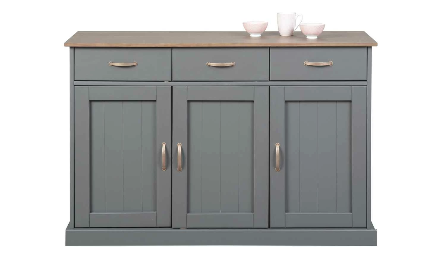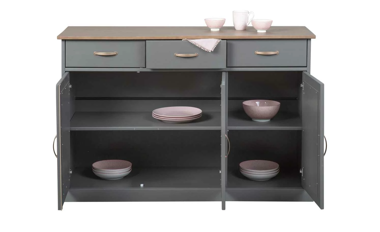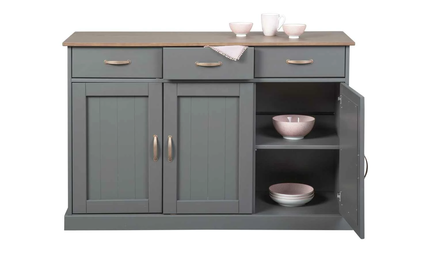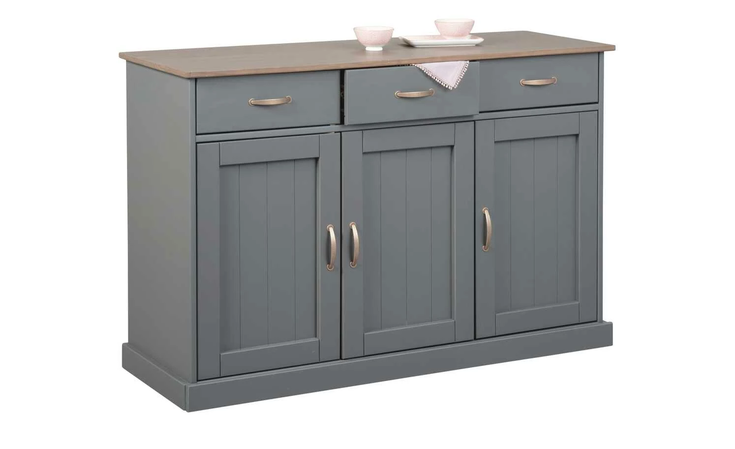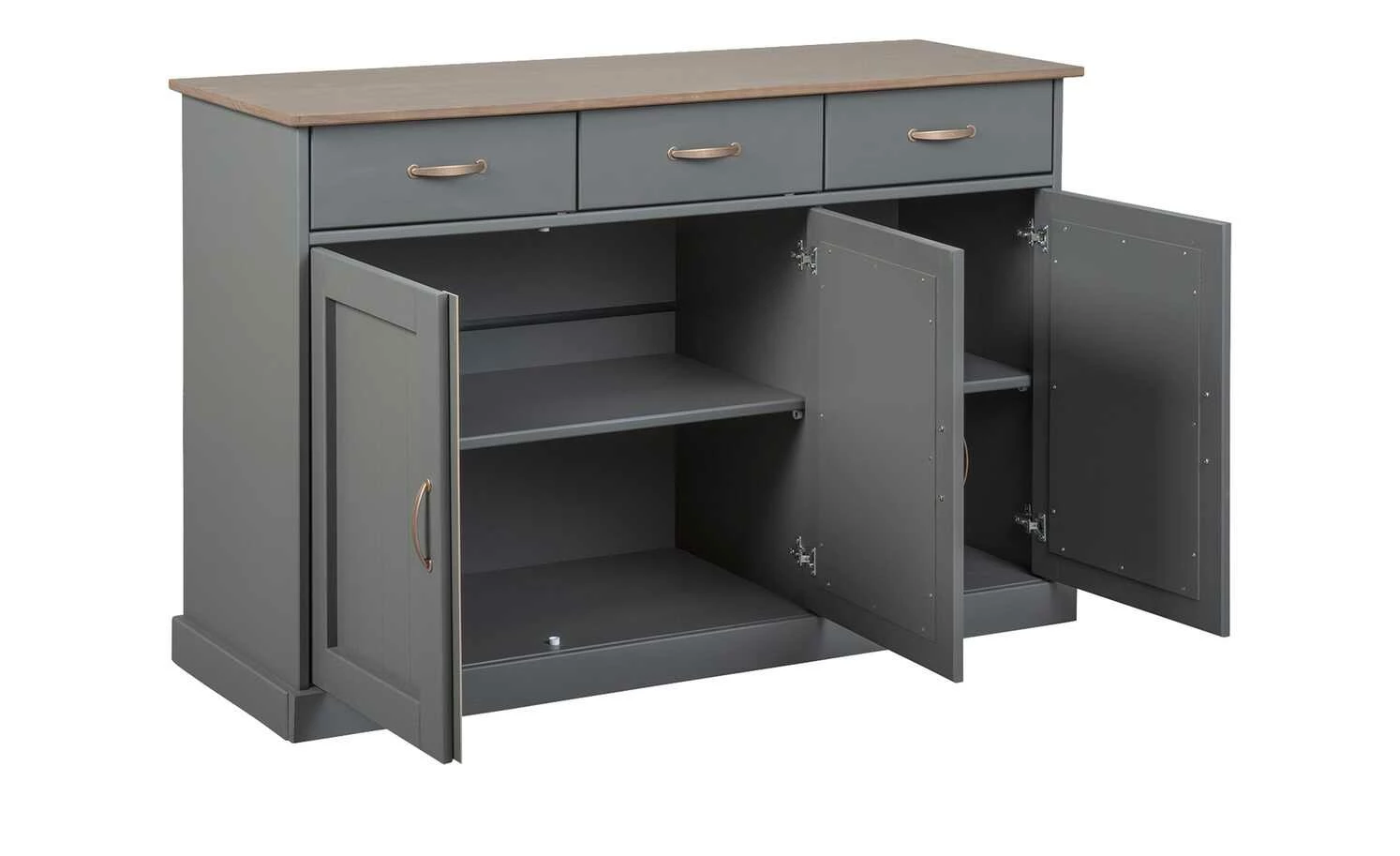 Mit dem Landhausstil können Sie Räume besonders wohnlich und nostalgisch einrichten. Zum Beispiel auch mit dem Sideboard Muslone, das im Landhausstil designt ist. Zu den Verzierungen gesellt sich ein schöner weißer oder grauer Farbton, der durch Akzente in Kiefer Braun abgesetzt wird. Korpus, Front und Böden sind aus massiver Kiefer gefertigt. Alle Oberflächen sind hochwertig lackiert. Muslone bietet Ihnen neben der Optik natürlich auch Stauraum. Und zwar in drei Schubladen und hinter drei Türen.