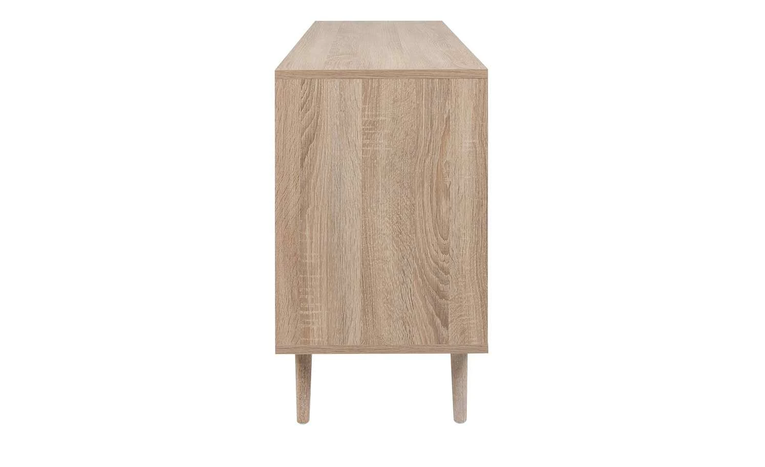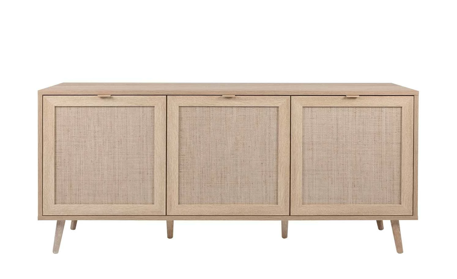 Das Sideboard Rafia macht in allen Wohnräumen eine gute Figur. Highlight des hellen Möbelstücks sind die drei Türen, die mit einer attraktiven 3D-Bastgeflecht-Optik sofort ins Auge stechen. Hinter den Türen liegen je zwei Fächer, die durch drei verstellbare Einlegeböden an Ihre Bedürfnisse angepasst werden können. Sechs schräg zulaufende Kegelfüße aus massivem Eichenholz geben dem Sideboard einen stabilen Stand. Die Serie Rafia erinnert an den beliebten Boho-Stil und fügt sich in nahezu alle Einrichtungskonzepte problemlos ein.