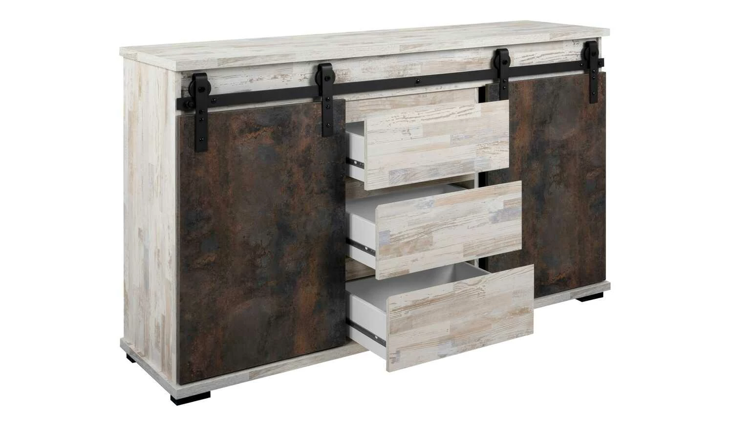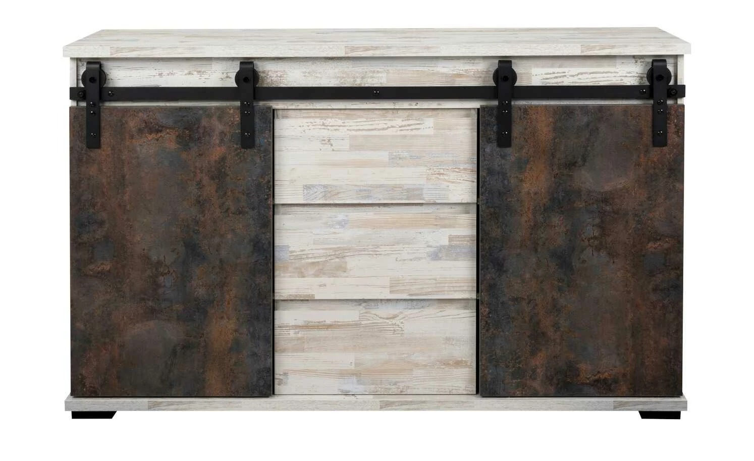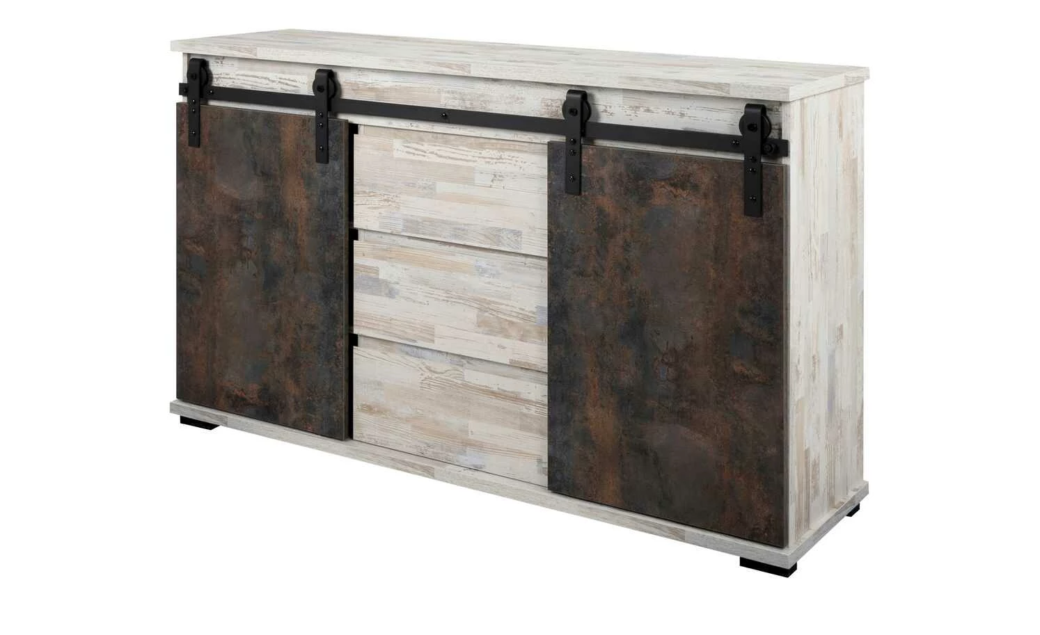Mit dem Sideboard Seviso entdecken Sie den Industrial-Style von einer ganz neuen Seite. Die hellen, pflegeleichten Oberflächen in weißer Kiefer (Nachbildung) dominieren das 140 Zentimeter lange Sideboard. Eine schwarze Metallschiene ist Kontrast und Türhalterung zugleich. Hier sind die beiden beweglichen Türfronten in Rost-Optik befestigt. Der großzügige Stauraum ist je nach Türposition blickdicht oder offen. Nutzen Sie die insgesamt sechs Fächer und drei Schubfächer für alle Ihre Sachen. Übrigens: Besonders stilsicher können Sie das Sideboard mit weiteren Möbeln der Serie Seviso kombinieren.
