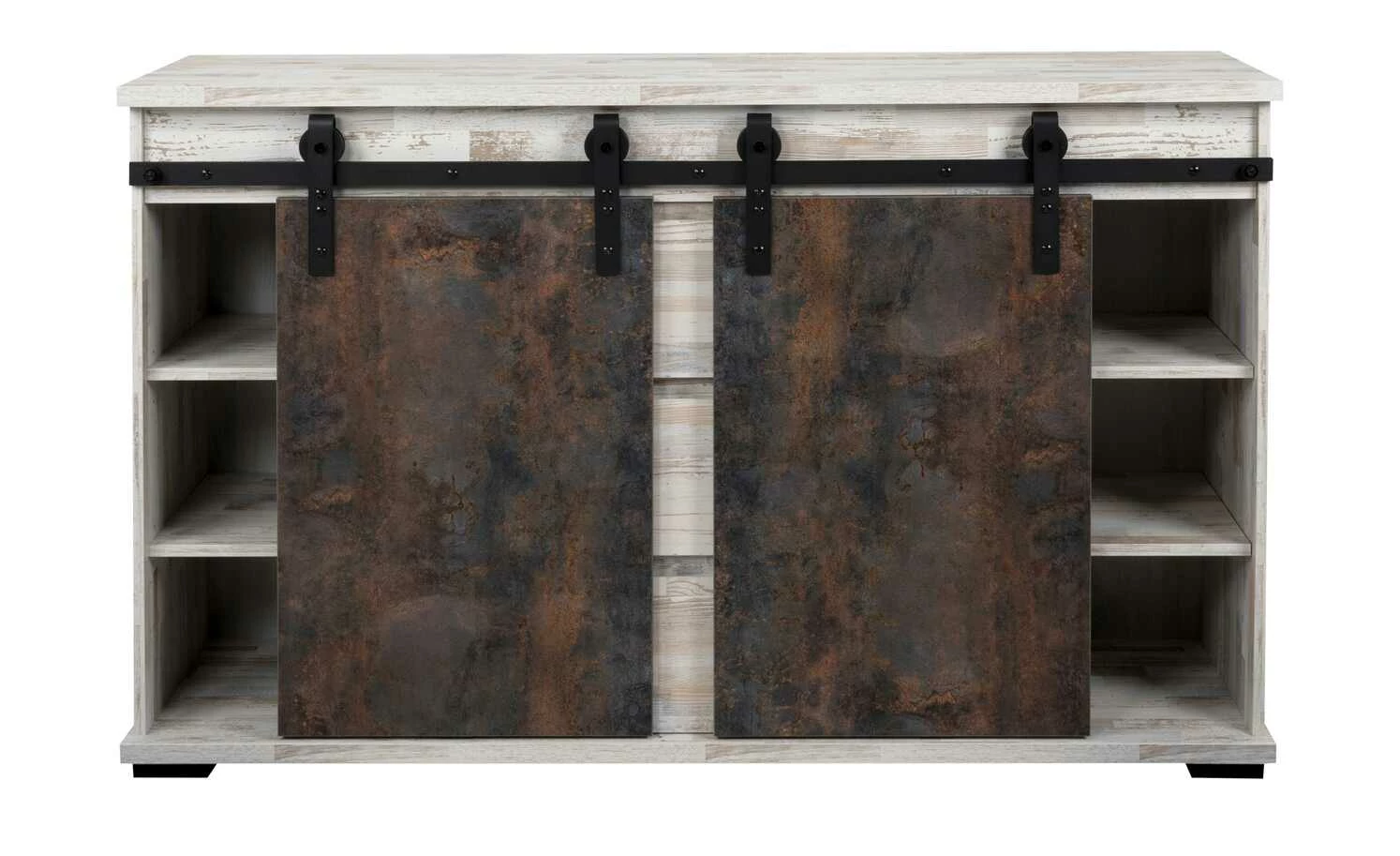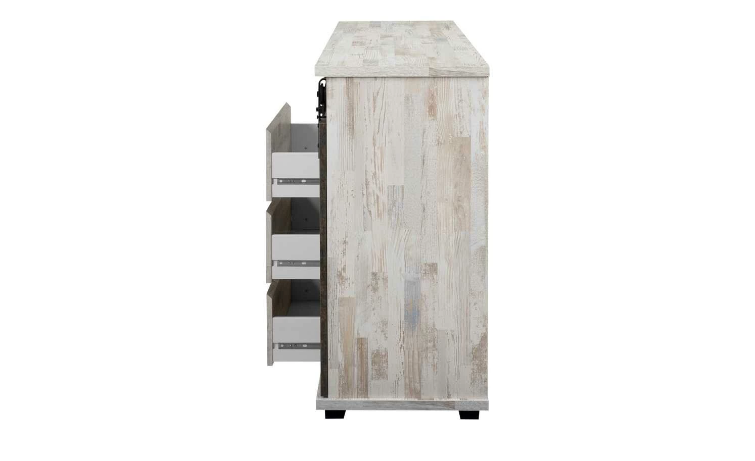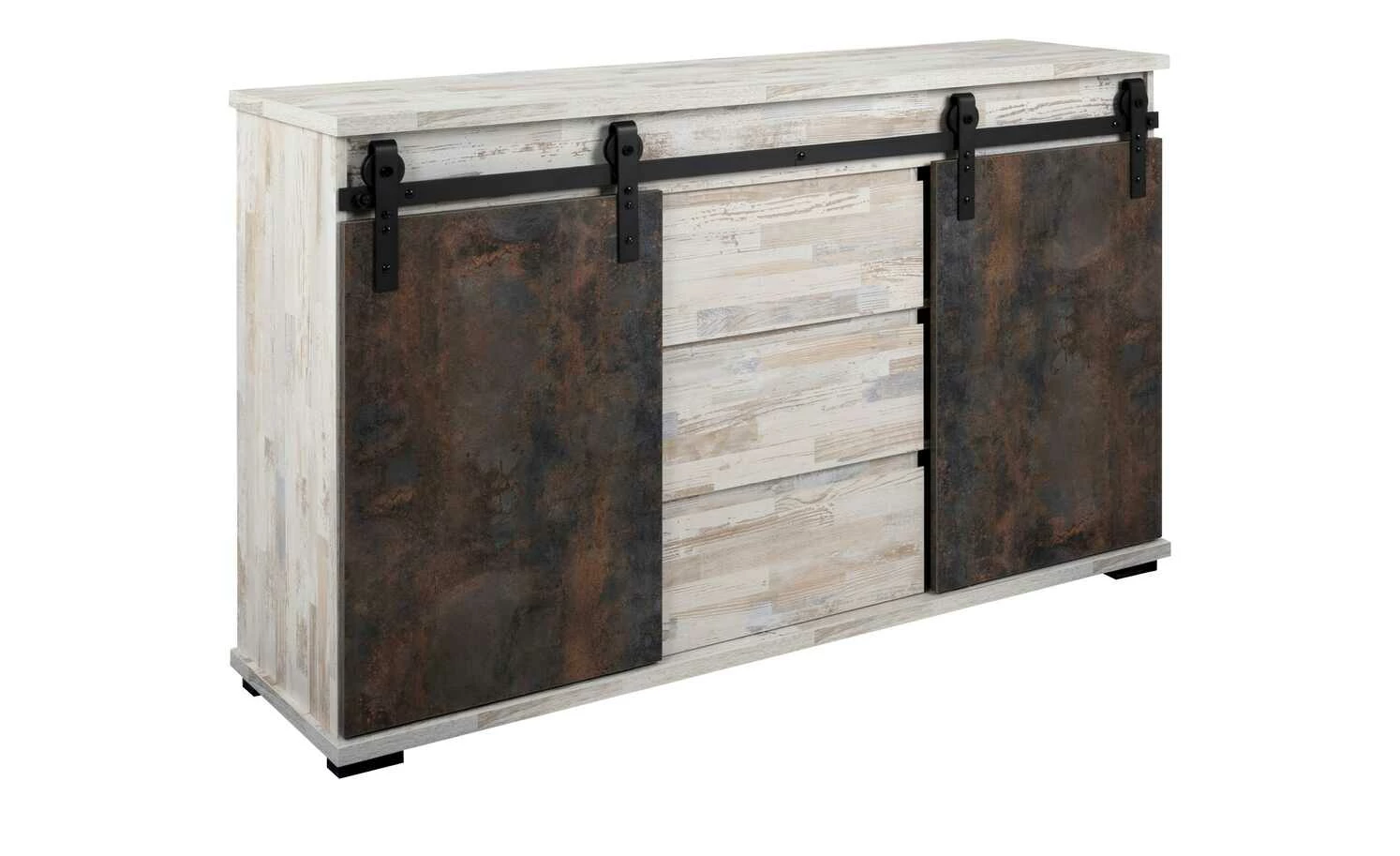 Mit dem Sideboard Seviso entdecken Sie den Industrial-Style von einer ganz neuen Seite. Die hellen, pflegeleichten Oberflächen in weißer Kiefer (Nachbildung) dominieren das 140 Zentimeter lange Sideboard. Eine schwarze Metallschiene ist Kontrast und Türhalterung zugleich. Hier sind die beiden beweglichen Türfronten in Rost-Optik befestigt. Der großzügige Stauraum ist je nach Türposition blickdicht oder offen. Nutzen Sie die insgesamt sechs Fächer und drei Schubfächer für alle Ihre Sachen. Übrigens: Besonders stilsicher können Sie das Sideboard mit weiteren Möbeln der Serie Seviso kombinieren.