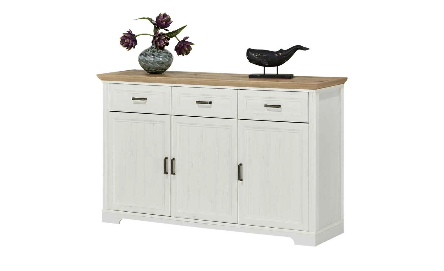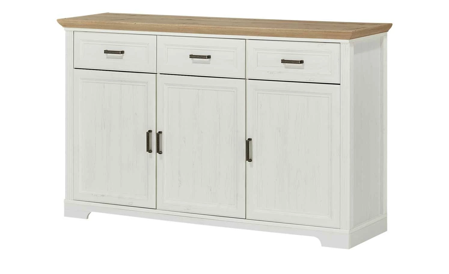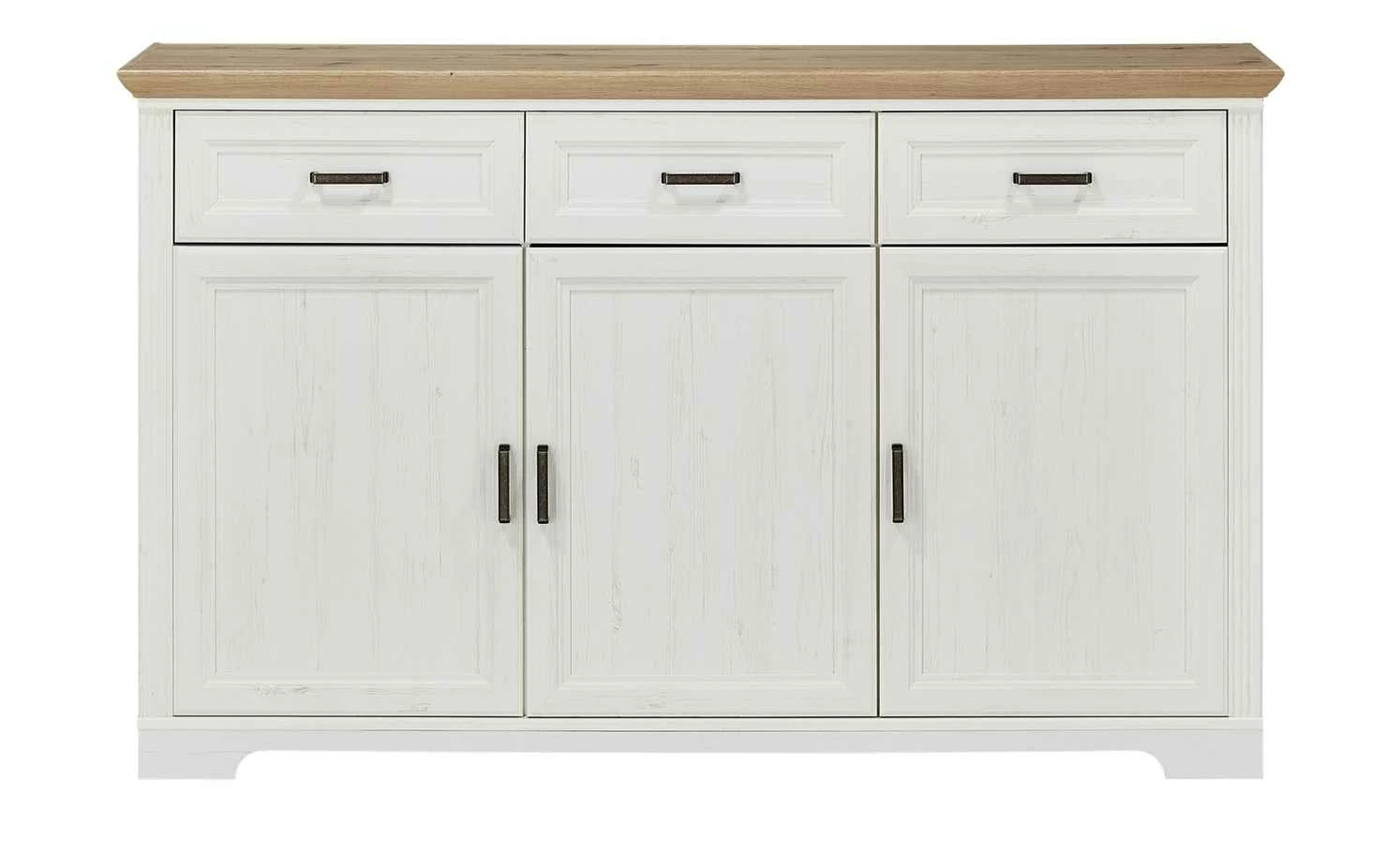 Das Sideboard Varese kann mit dem gleichnamigen Buffetaufsatz ergänzt werden. Optional können Sie es natürlich auch alleinstehen nutzen. Varese ist mit drei Schubladen und drei Türen ausgestattet. Sie verfügen über eine Soft-Close-Ausstattung, die für ein leises Schließen sorgt. Im Sideboard ist genügend Platz für Geschirr, Besteck und viele andere Dinge. Front und Korpus sind hochwertig gearbeitet und im Landhausstil in Pinie hell (Nachbildung) designt. Die Abdeckplatte setzt sich in Asteiche (Nachbildung) ab.
