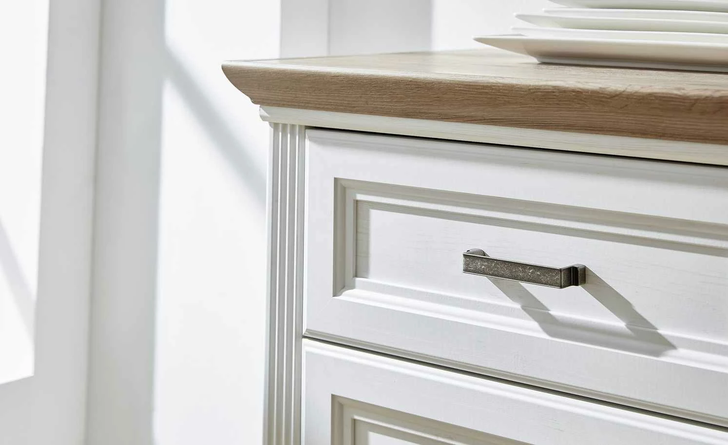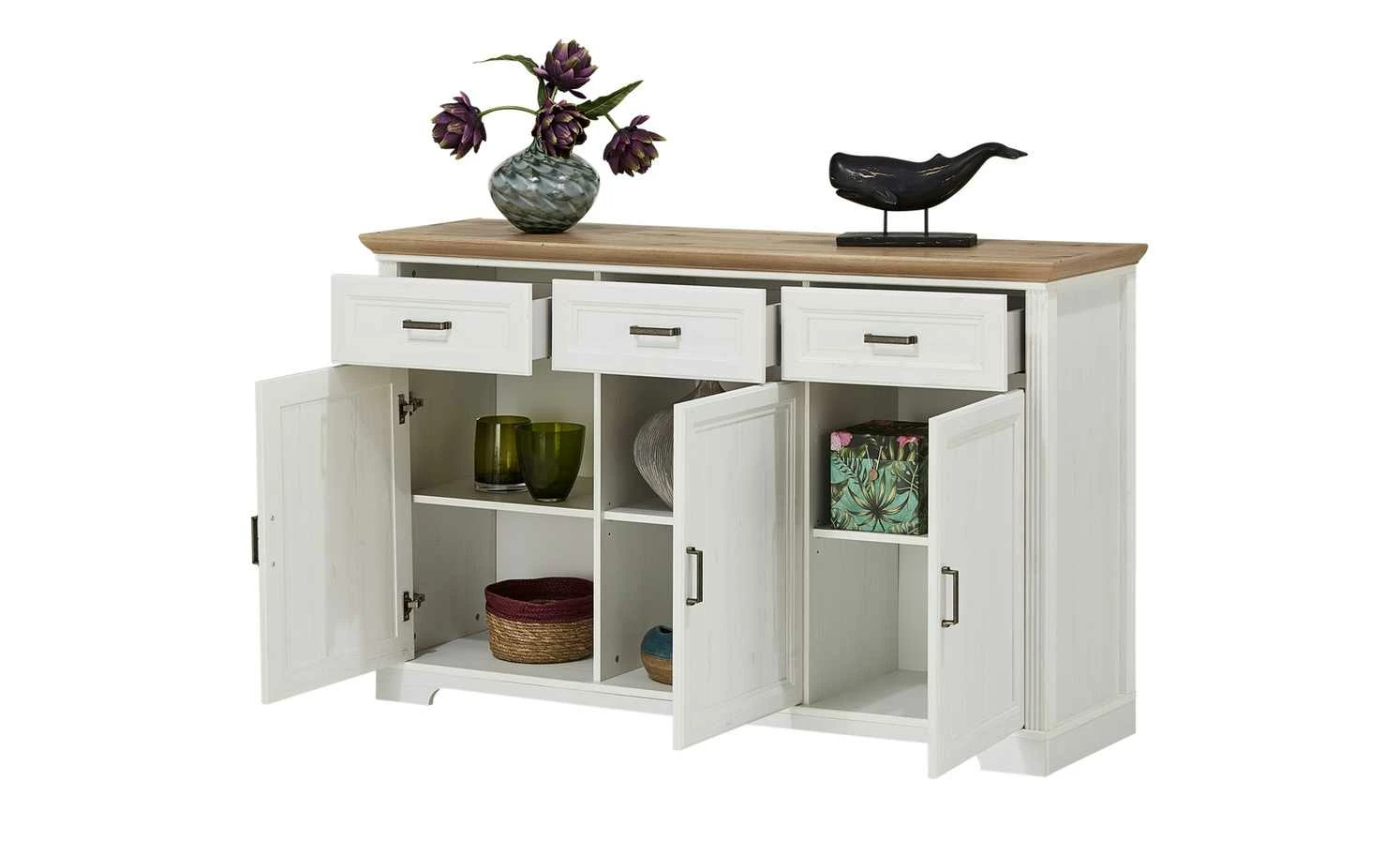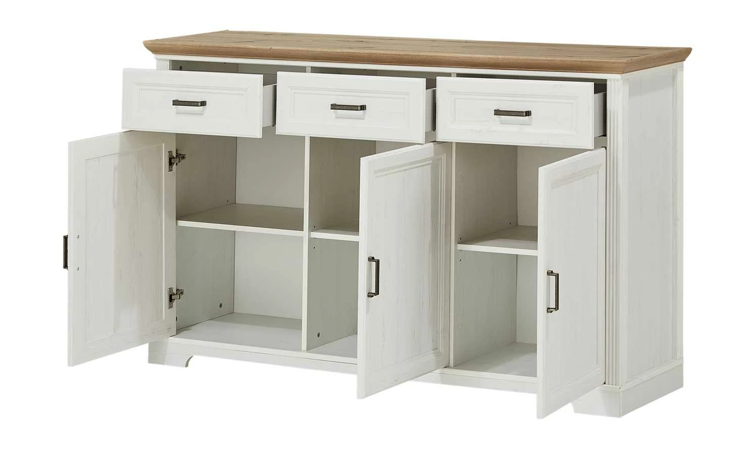 Das Sideboard Varese kann mit dem gleichnamigen Buffetaufsatz ergänzt werden. Optional können Sie es natürlich auch alleinstehen nutzen. Varese ist mit drei Schubladen und drei Türen ausgestattet. Sie verfügen über eine Soft-Close-Ausstattung, die für ein leises Schließen sorgt. Im Sideboard ist genügend Platz für Geschirr, Besteck und viele andere Dinge. Front und Korpus sind hochwertig gearbeitet und im Landhausstil in Pinie hell (Nachbildung) designt. Die Abdeckplatte setzt sich in Asteiche (Nachbildung) ab.
