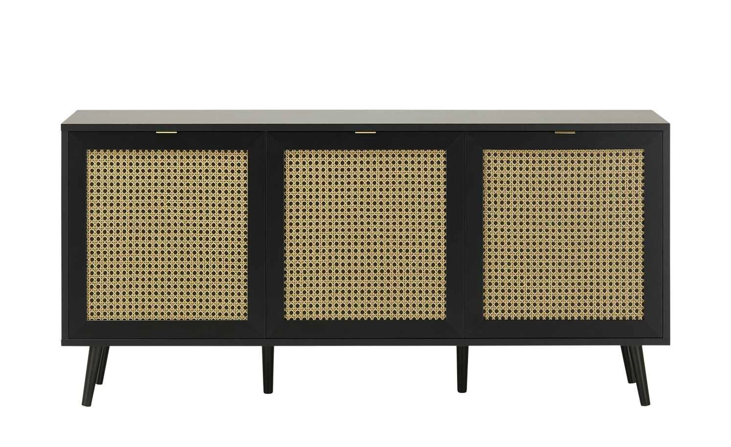 Zeitloses Schwarz in Kombination mit hellen Fronten in Wiener-Geflecht-Optik: Das ist das Sideboard Vienna. Zusammen mit den schräg zulaufenden Buchenfüßen in schwarz erzeugt sie ein edles Kaffeehaus-Flair. Hinter den drei Türen befinden sich sechs Fächer, in denen Sie allerlei Dinge unterbringen können. Auch die 150 x 40 Zentimeter große Oberfläche bietet viel Platz für Dekoobjekte oder Tischlampen.