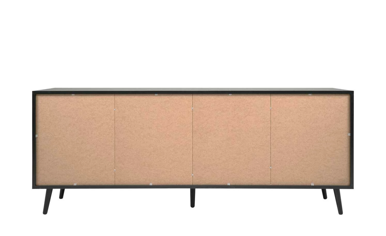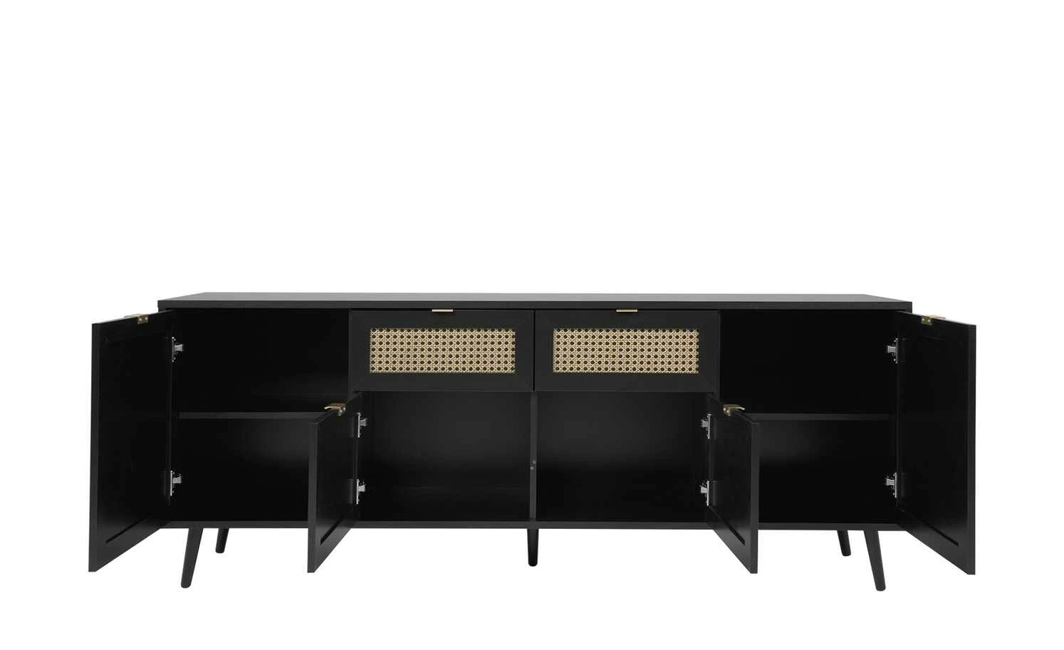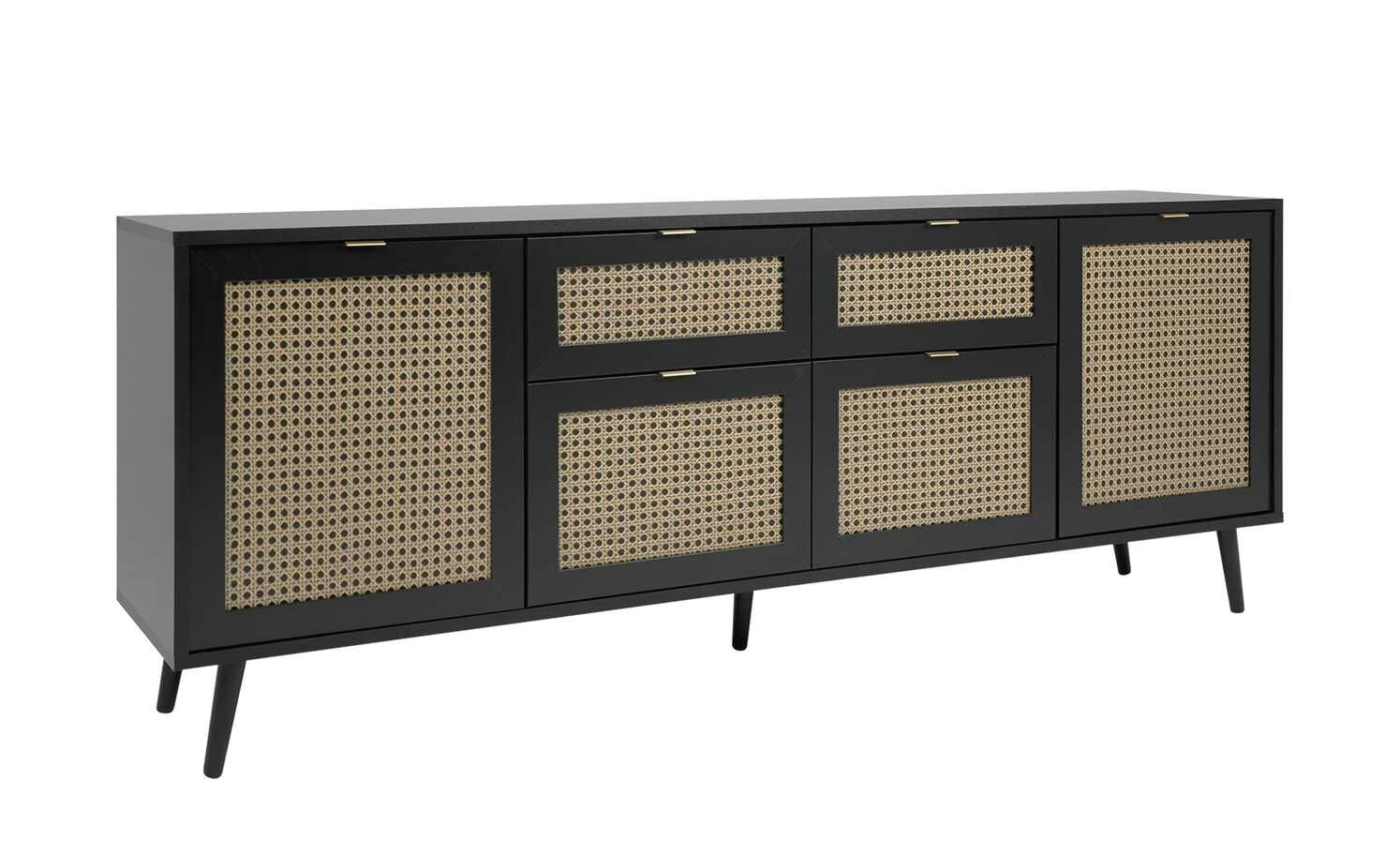 Zeitloses Schwarz in Kombination mit hellen Fronten in Wiener-Geflecht-Optik: Das ist das Sideboard Vienna. Zusammen mit den schräg zulaufenden Buchenfüßen in schwarz erzeugt sie ein edles Kaffeehaus-Flair. Hinter den vier Türen und in den zwei mittigen Schubfächern befindet sich großzügiger Stauraum. Auch die 180 x 40 Zentimeter große Oberfläche bietet viel Platz für Dekoobjekte oder Tischlampen.