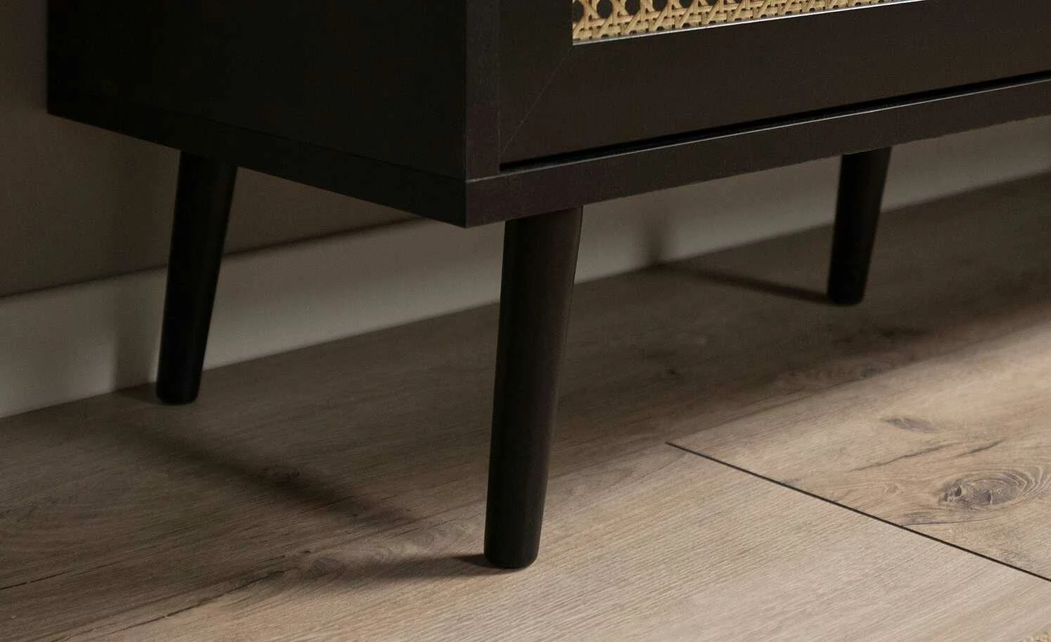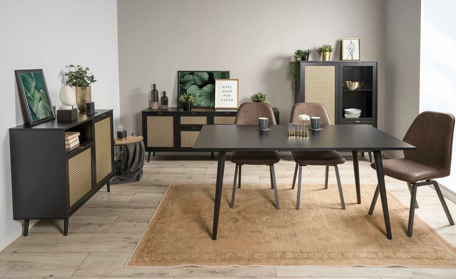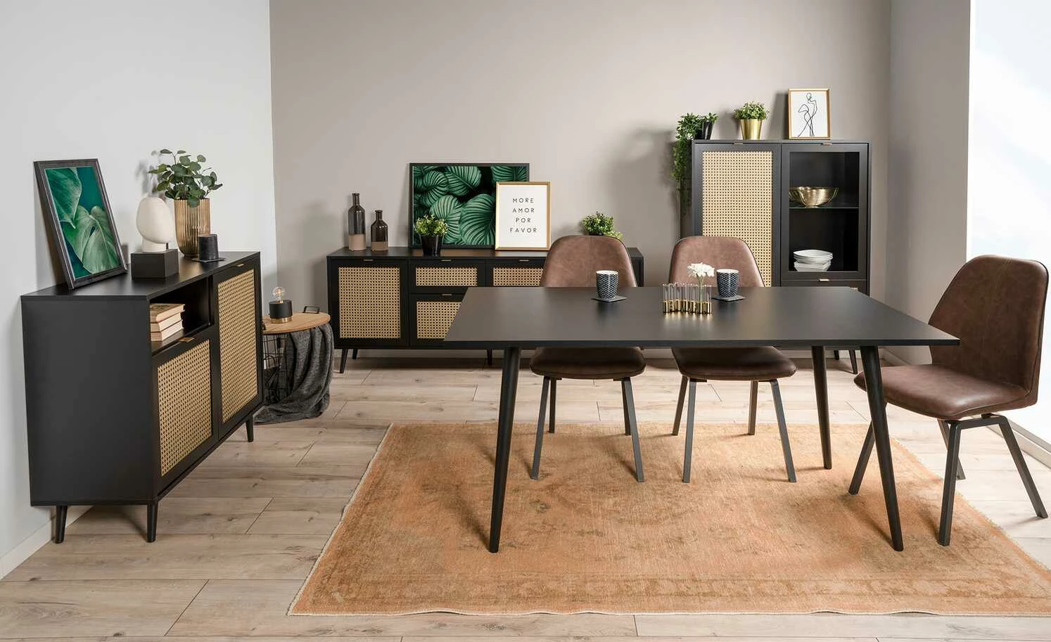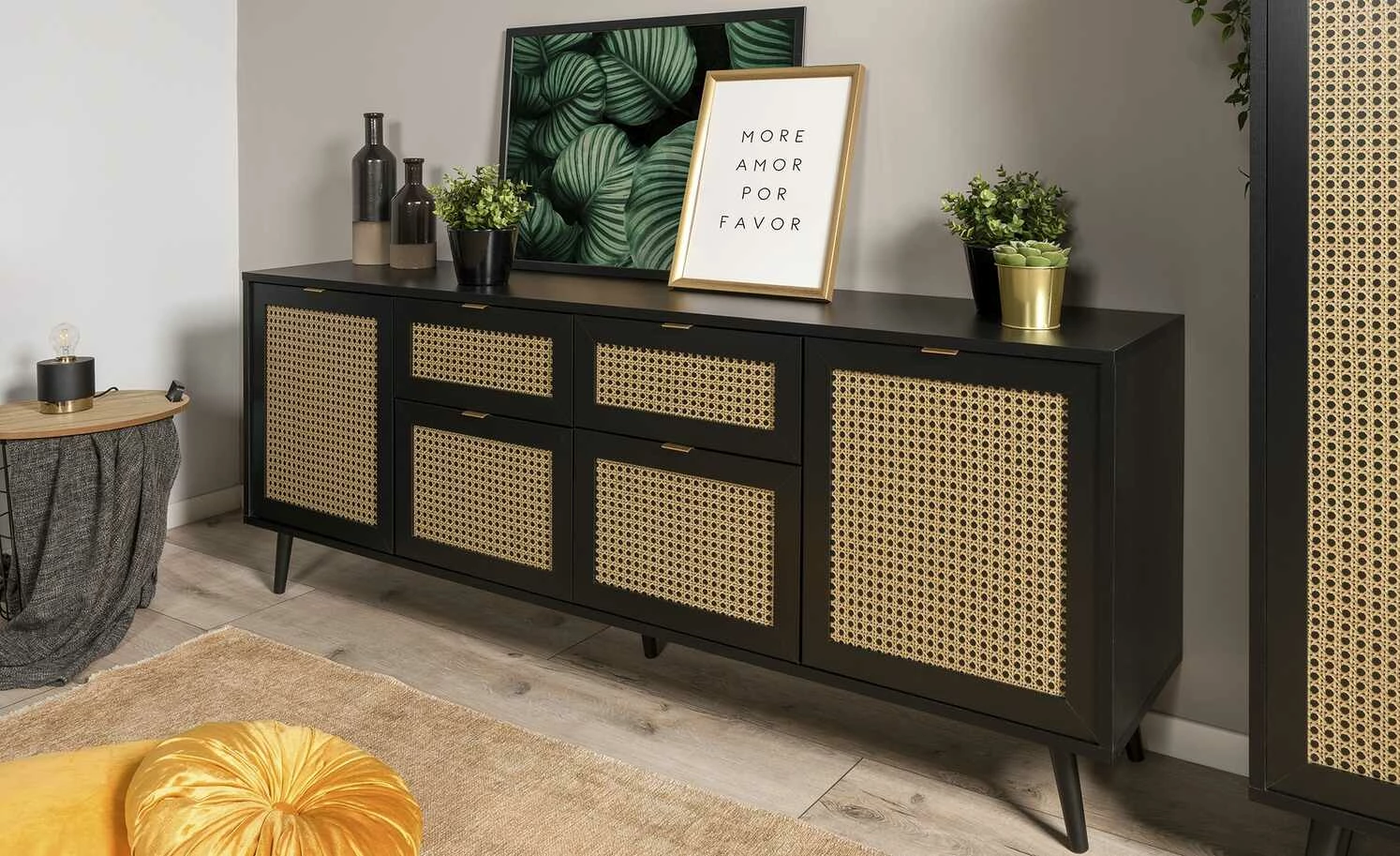 Zeitloses Schwarz in Kombination mit hellen Fronten in Wiener-Geflecht-Optik: Das ist das Sideboard Vienna. Zusammen mit den schräg zulaufenden Buchenfüßen in schwarz erzeugt sie ein edles Kaffeehaus-Flair. Hinter den vier Türen und in den zwei mittigen Schubfächern befindet sich großzügiger Stauraum. Auch die 180 x 40 Zentimeter große Oberfläche bietet viel Platz für Dekoobjekte oder Tischlampen.