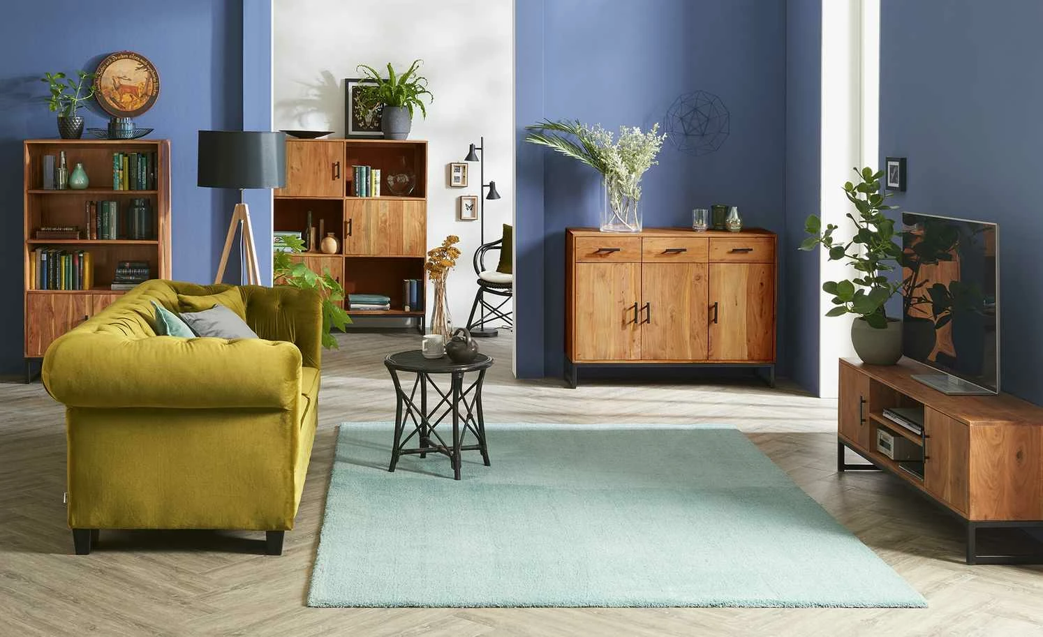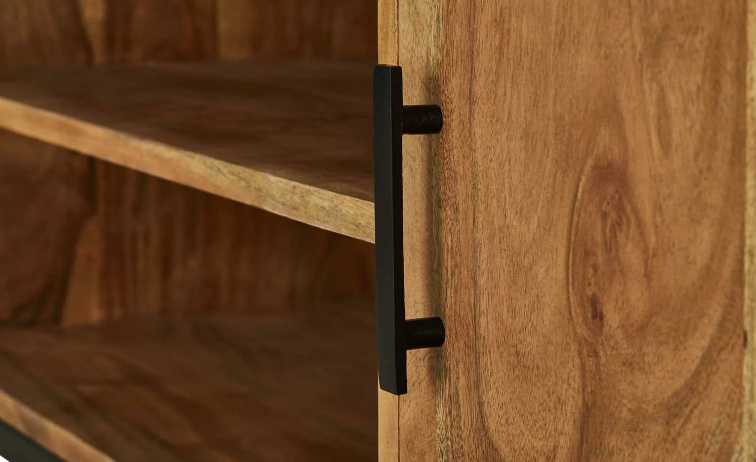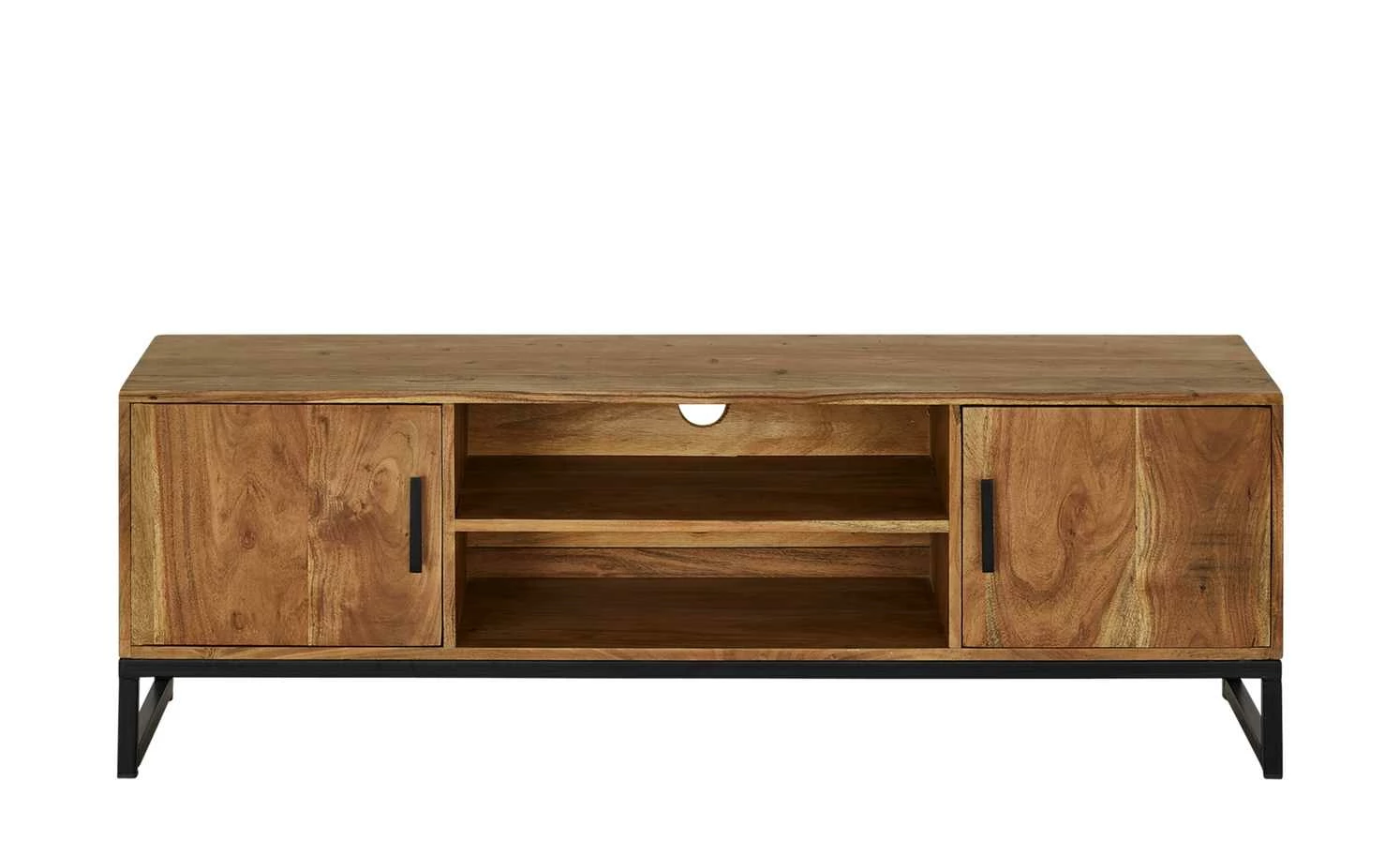Bringen Sie eine natürliche Note in Ihr Wohnzimmer – und zwar mit der Serie Candela. Dazu gehört auch dieses TV-Board. Korpus und Front sind aus massiver Akazie gefertigt. Sie zeichnet sich durch ihre Qualität und die ausgeprägte Maserung aus. Farbverläufe und Strukturunterschiede machen den besonderen Look des Holzes aus. Durch die lackierte Oberfläche kommt das Holz noch besser zur Geltung. Gestell und Griffe setzten Kontrastakzente, sie sind aus anthrazitfarbenem Metall. Candela verfügt über eine große Stellfläche für Ihren Fernseher und zwei mittige Gerätefächer. In der Rückwand befindet sich ein Kabeldurchlass. Stauraum ist hinter den beiden Türen vorhanden.