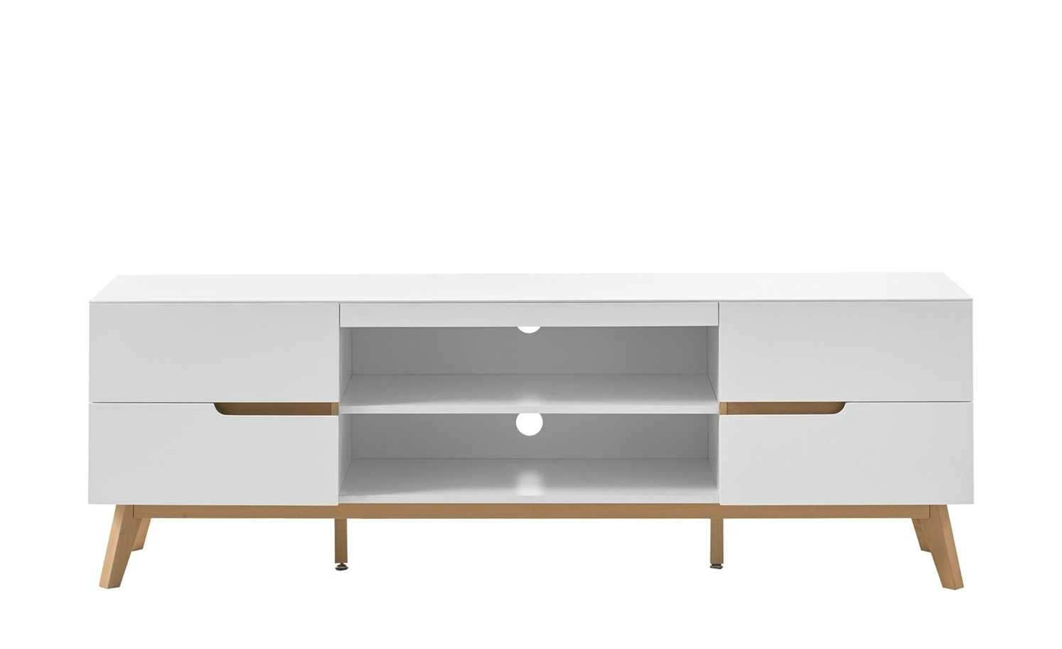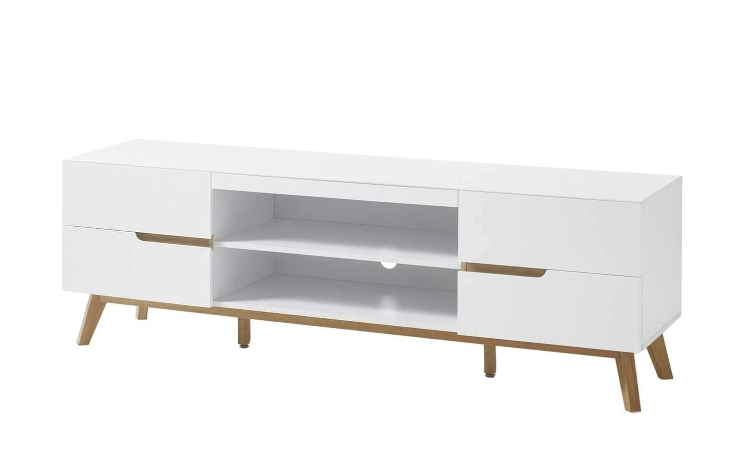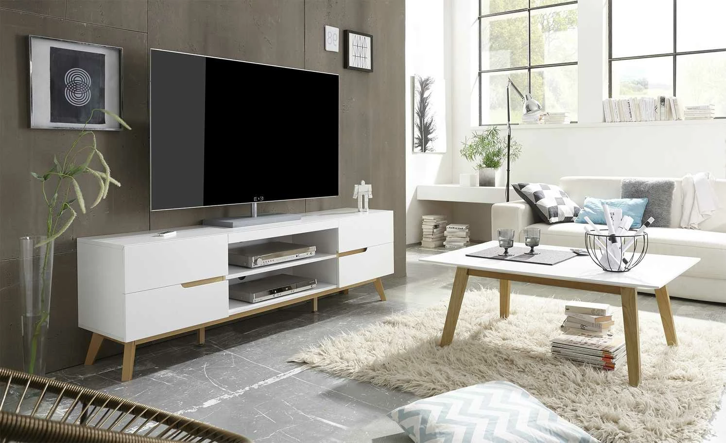 Die Serie Casoria sorgt für skandinavischen Charme in Ihrem Wohnzimmer. Dazu gehört auch dieses TV-Lowboard. Korpus und Front sind weiß lackiert. Das Gestell aus massiver Eiche und die Frontabsetzungen aus Asteichen-Furnier setzen natürliche Akzente. Die Stellfläche für Ihren Fernseher ist so breit, dass darauf TV-Geräte bis zu einer Größe von 70 Zoll stehen können. Mittig sind zwei Gerätefächer angeordnet. Durch den Kabeldurchlass in der Fach-Rückwand wird lästiger Kabelsalat verhindert. Stauraum ist in vier Schubkästen vorhanden.