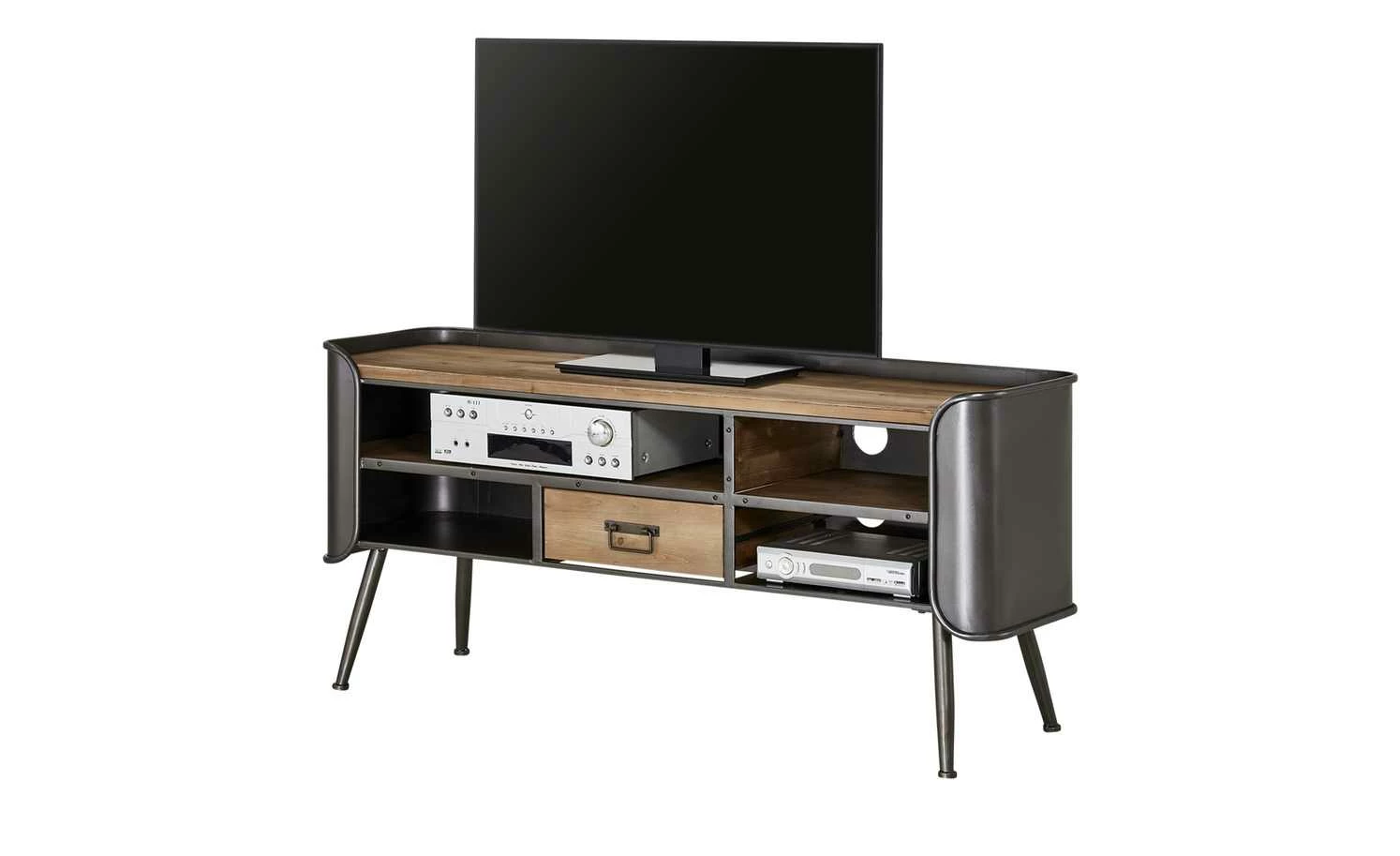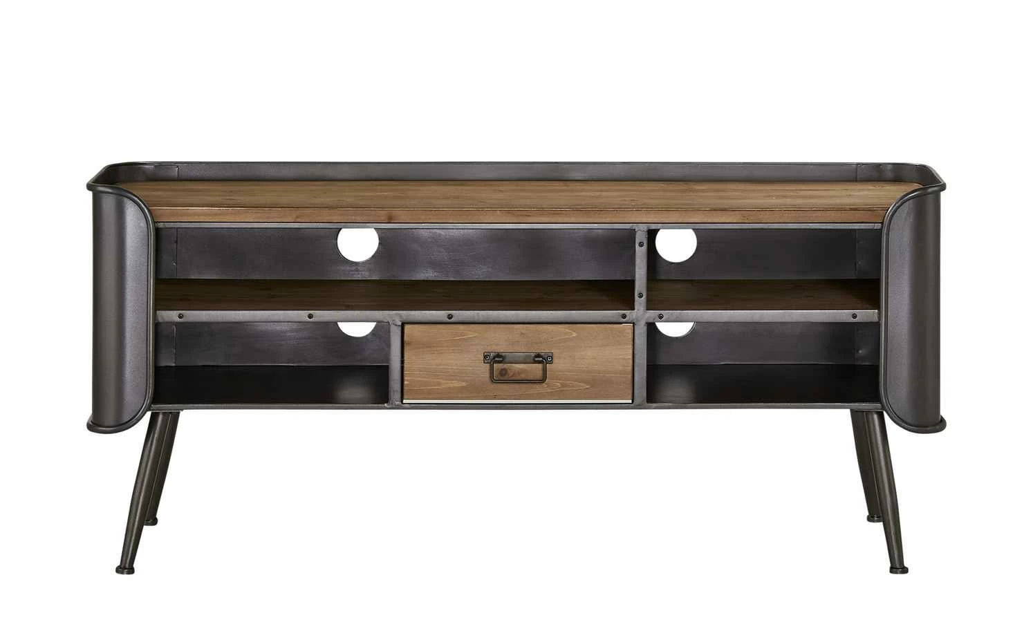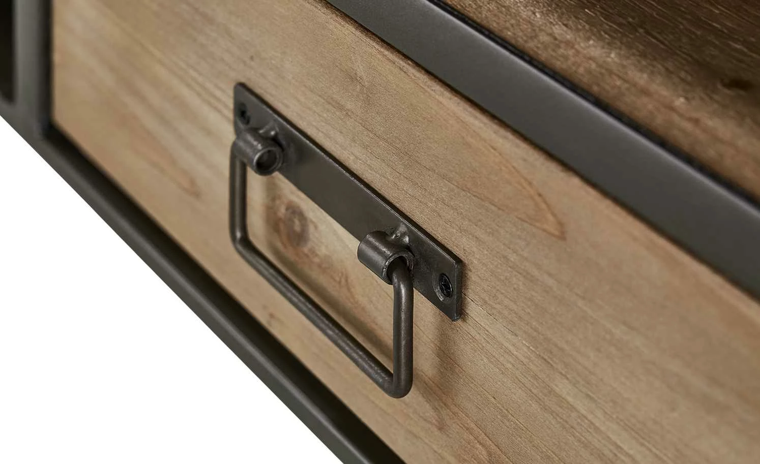 Beim TV-Lowboard Imola harmonieren rostfarbenes Metall und gemasertes Kiefernholz gekonnt miteinander. Die beiden Materialien werden durch bewusst gesetzte Used-Effekte akzentuiert, sodass ein ganz besonderer Industrial-Charme entsteht. Unter der 140 Zentimeter langen Holzfläche für Ihren Fernsehbildschirm befinden sich vier offene Fächer und ein Schubfach mit Massivholz-Front. Jedes der offenen Fächer ist mit einem Kabeldurchlass versehen, damit Sie Receiver und Co. ganz nach Ihren Wünschen platzieren können.