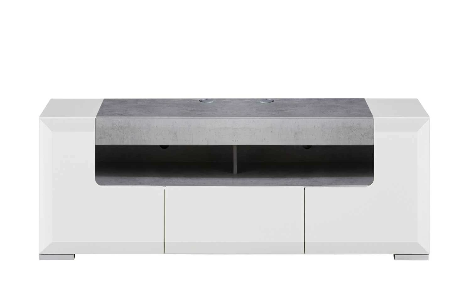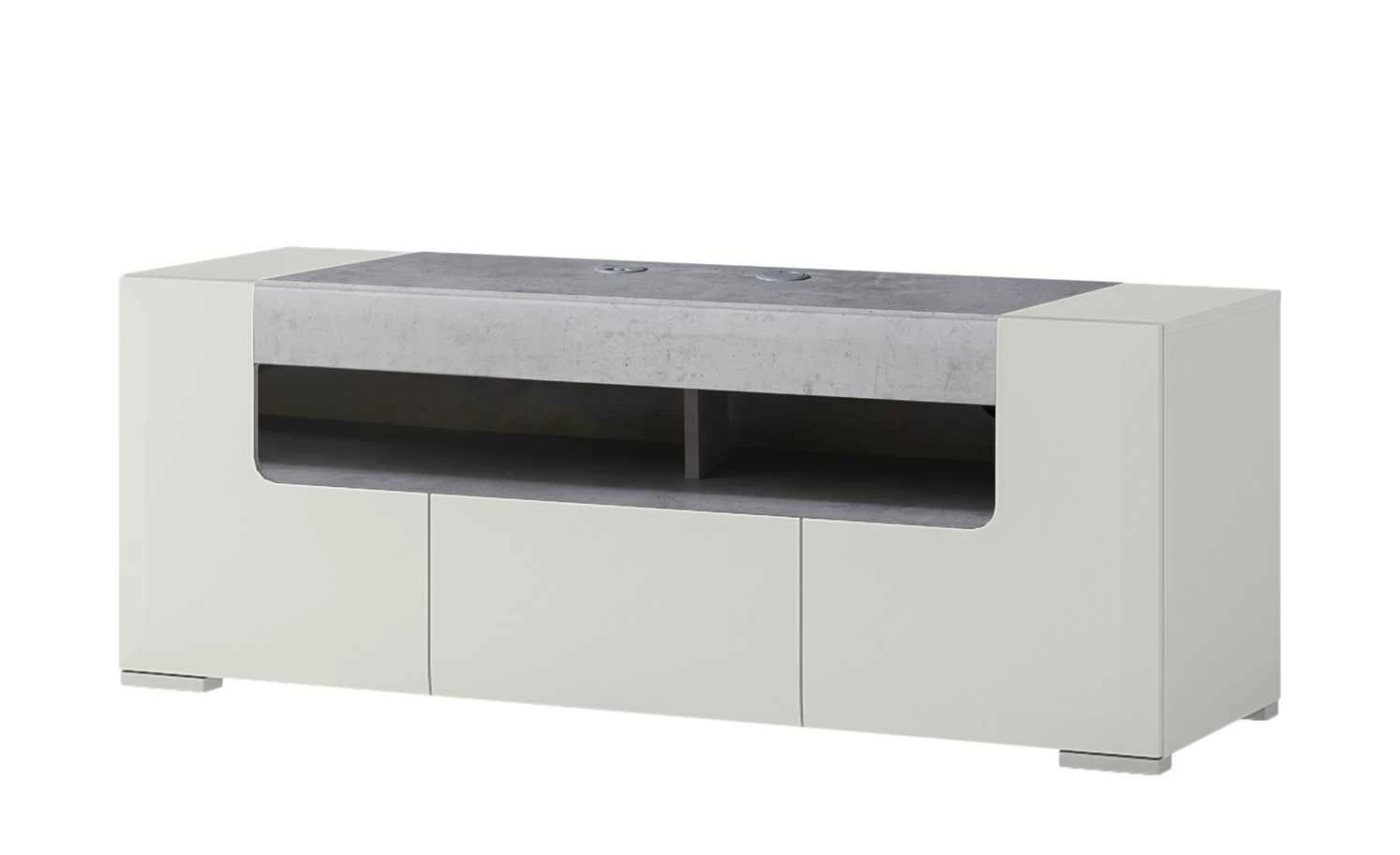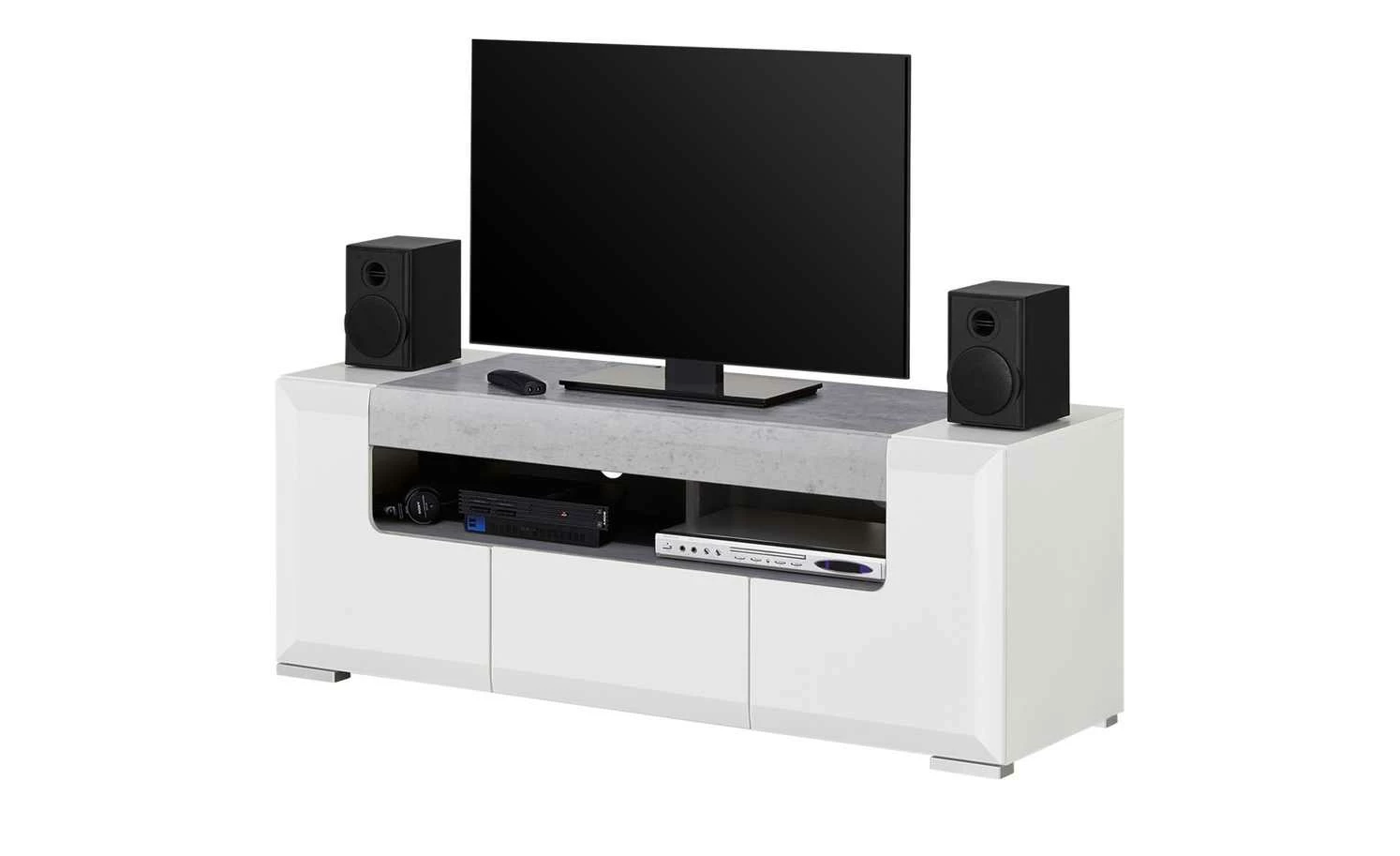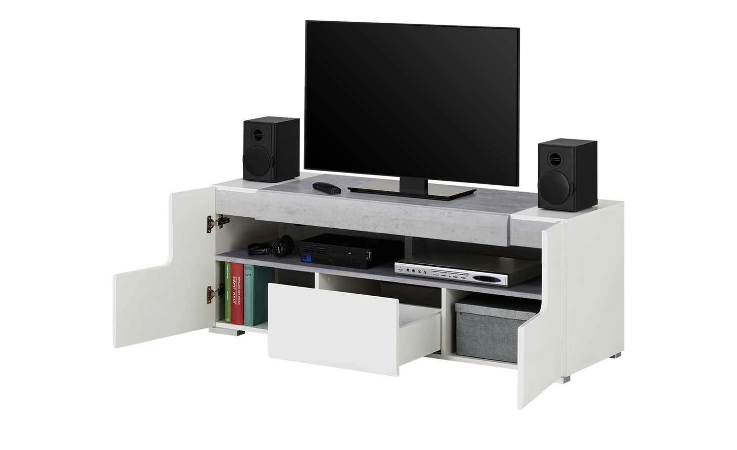 Das TV-Unterteil Puro hat ein modernes Design. Vor allem die Absetzung in Beton-Optik fällt sofort ins Auge. Der Rest des Lowboards ist in zeitlosem Alpinweiß gehalten. Die Front ist hochglänzend und setzt den Farbton so noch besser in Szene. Puro ist für Fernseher bis zu einer Diagonale von 70 Zoll geeignet. In den beiden offenen Fächern können Spielekonsole oder Festplattenrecorder verstaut werden. Hinter den beiden Türen finden Sie je ein Fach. Weiterer Stauraum ist in der breiten Schublade zu finden.