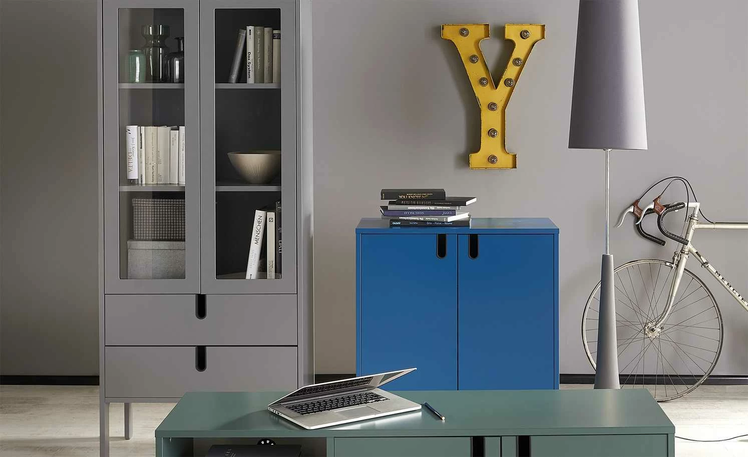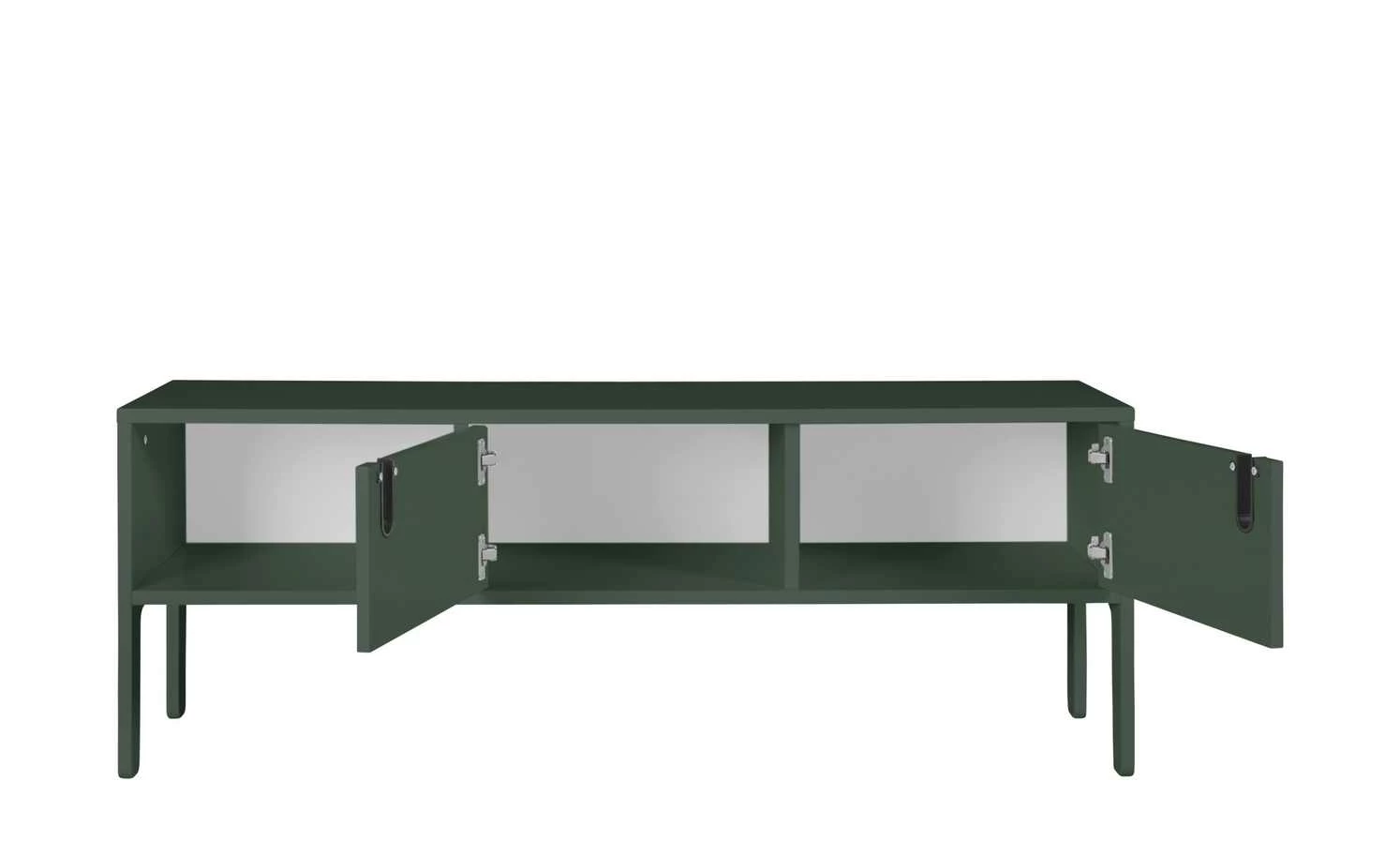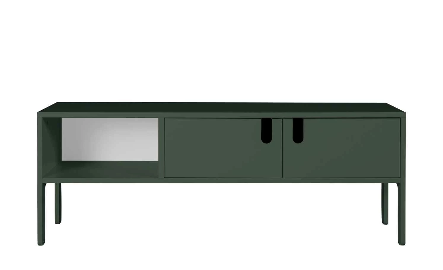 Auf dem TV-Lowboard Uno kommt Ihr Fernseher wunderbar zur Geltung. Das stylische Lowboard ist als Teil der Serie Uno mit dem German Design Award Special 2019 ausgezeichnet worden. Der Mix aus einer zurückhaltenden Linienführung und der modernen Farbe spricht für sich. Der Lack in Forest (Grün) hat einen matten Look, was die Farbe edel akzentuiert. Die sichtbare Rückwand setzt sich in Weiß davon ab. Neben der breiten Stellfläche bietet Uno ein offenes Fach und Stauraum hinter zwei Türen. Die Rückwand ist mit einem Kabeldurchlass ausgestattet.