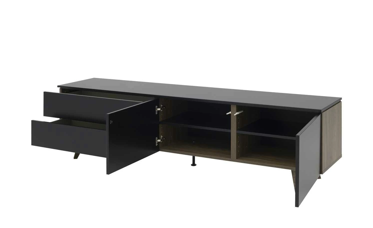 Eine klare Linienführung, dramatisches Schwarz und eine schöne Wallnussoptik vereinen sich beim TV-Lowboard Uuna. Korpus und Front haben ein mattes Finish, das Uuna noch edler wirken lässt. Auf Griffe ist verzichtet worden; stattdessen öffnet sie durch eine Push-to-Open-Funktion. Uuna ist mit zwei Schubladen und zwei Türen ausgestattet. Hinter den beiden Türen sind vier Fächer zu finden; die beiden Böden dazwischen sind höhenverstellbar.