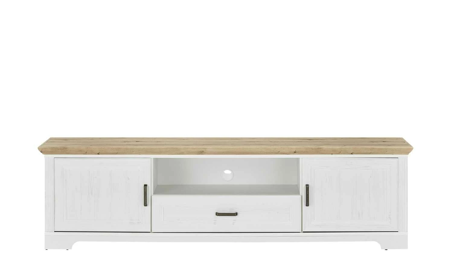 Im Wohnzimmer zaubert der Landhausstil der Serie Varese eine angenehme Behaglichkeit. Teil der Serie ist dieses TV-Lowboard. Es hat eine Stellfläche von 193 Zentimetern Breite und ist mit bis zu 40 Kilogramm belastbar. Dadurch können Sie auch TV-Geräte bis 75 Zoll auf dem Lowboard platzieren. Mittig ist ein Gerätefach zu finden. Dank des Kabeldurchlasses in der Rückwand wird Kabelsalat verhindert. Damit Sie Blurays oder anderes Zubehör unterbringen können, ist Varese mit innen mit vier Fächern und einer Schublade ausgestattet. Türen und Schublade schließen dank Soft-Close leise.