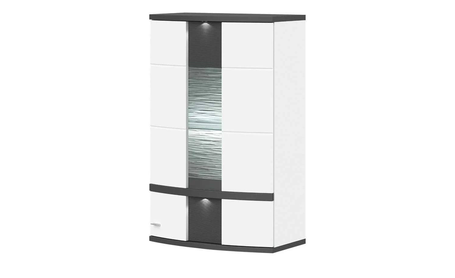 Wie der Name schon vermuten lässt, steht die Hängevitrine Gabbro nicht auf dem Boden, sondern hängt an der Wand. Gabbro bietet Ihnen Stauraum. Gleichzeitig ist die Vitrine eine schöne Möglichkeit, um Lieblings-Deko oder stilvolles Geschirr zu präsentieren. Die große Tür ist nämlich mit Einsätzen aus Klarglas versehen. Darüber und darunter finden Sie Absetzungen mit einer geriffelten 3D-Optik. Abgesehen von den Absetzungen ist die Vitrine in einem strahlenden Weiß gehalten. An der Front ist dieses hochglänzend. Die Front-Beleuchtung ist im Lieferumfang enthalten.