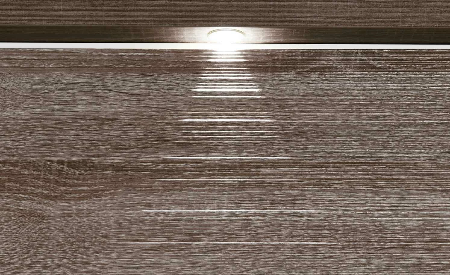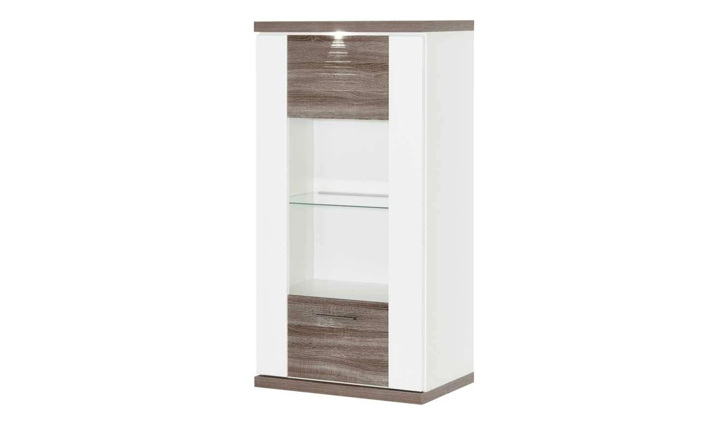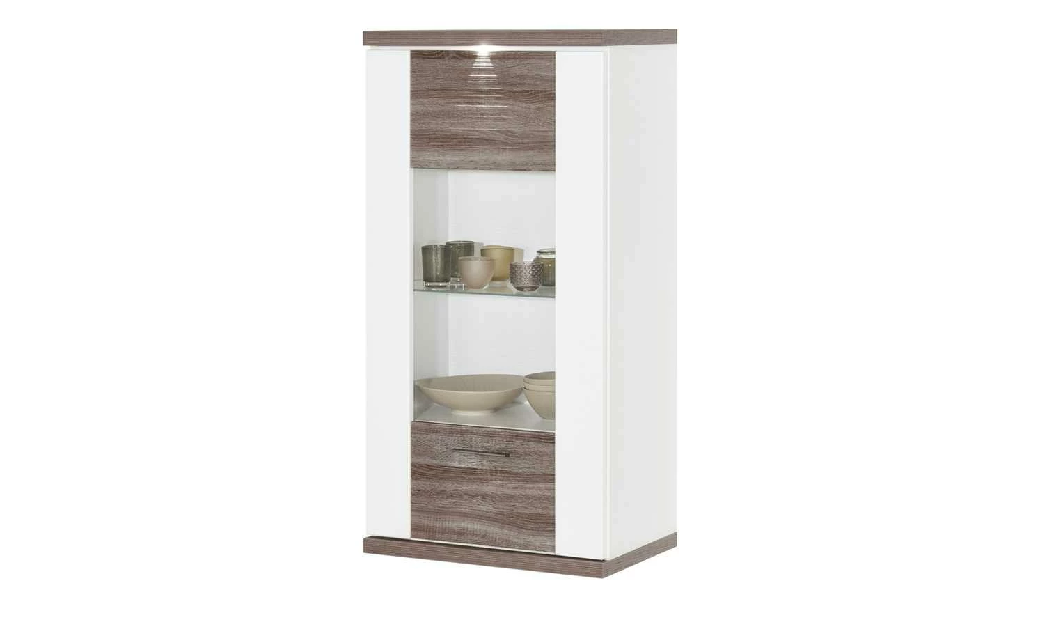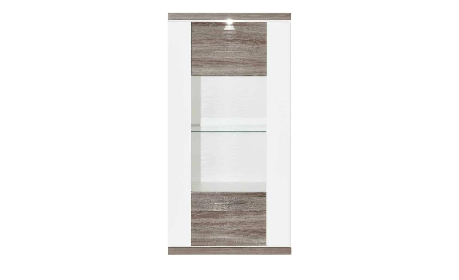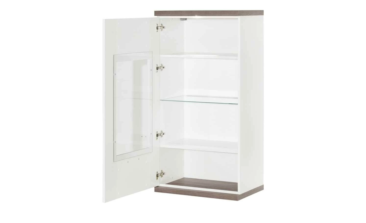 Wie durch den Namen bereits erkennbar ist, wird die Hängevitrine Titan direkt an die Wand angebracht. Dort bietet sie Stauraum und zwei Vitrinenfächer hinter einer Tür. Die Tür ist mittig mit Klarglas abgesetzt, um freien Blick in die Vitrinenelemente zu bieten. Titan ist zweifarbig gestaltet. Korpus und Teile der Front sind weiß. Die weißen Frontelemente sind außerdem mit einem modernen Hochglanz versehen. Die Front ist mittig in einem dunklen Ton abgesetzt. Dieser wird durch die gehobelte Oberfläche abgesetzt. Auch Abdeck- und Bodenplatte sind dunkel gestaltet.