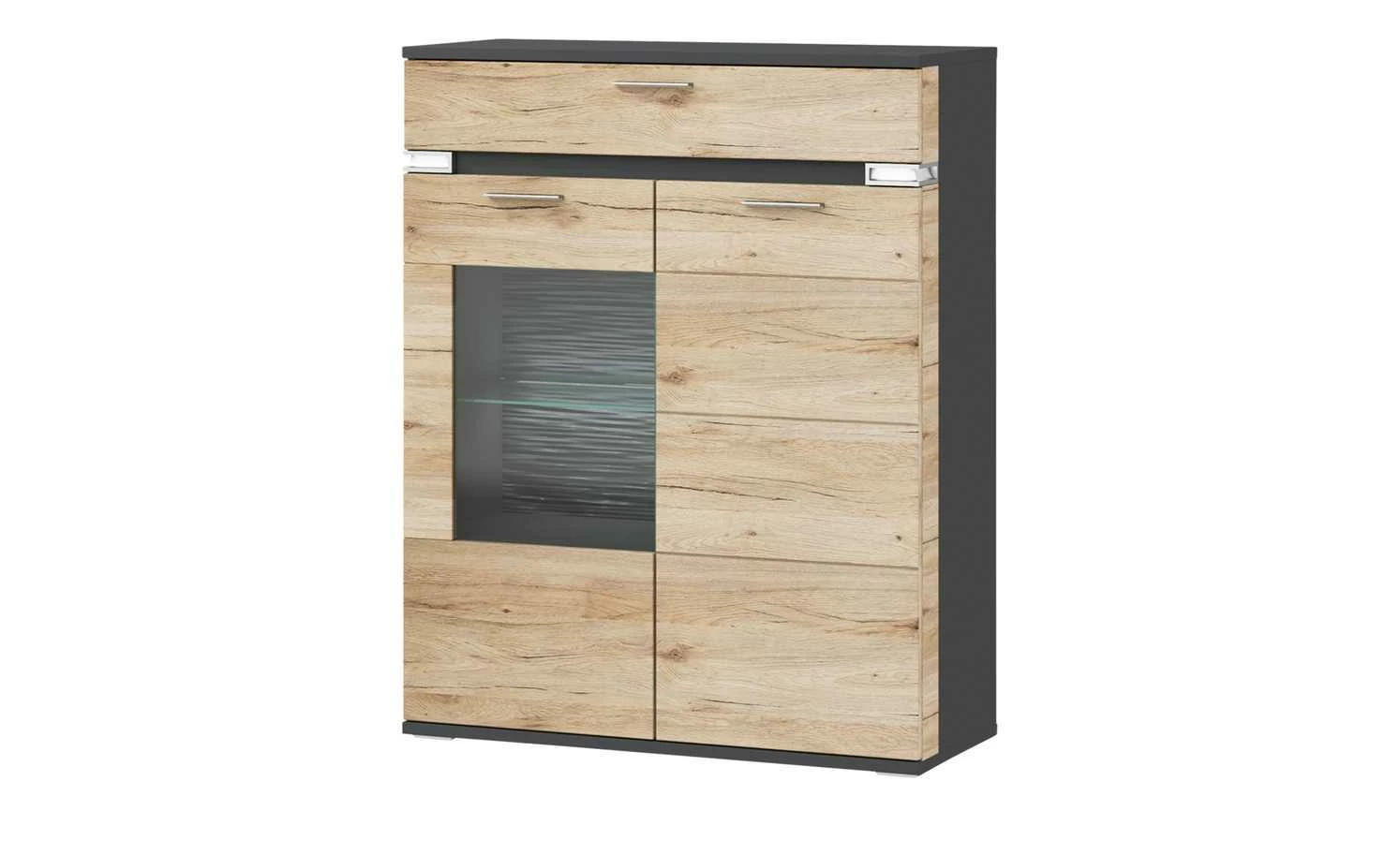 Innen praktisch und außen attraktiv – das ist das Highboard Katt von uno. Die große Schublade und der Platz hinter den beiden Türen bieten viel Fläche zum Unterbringen von Dingen des täglichen Lebens. In den beiden Vitrinenfächern können Sie Geschirr und Lieblingsstücke präsentieren. Sie sind durch das Klarglas gut zu sehen, gleichzeitig aber vor Staub geschützt. Katt setzt auf Farbkontraste. Um die Front in Eiche San Remo (Nachbildung) schön zur Geltung zu bringen, ist eine seitliche LED-Beleuchtung im Lieferumfang enthalten.