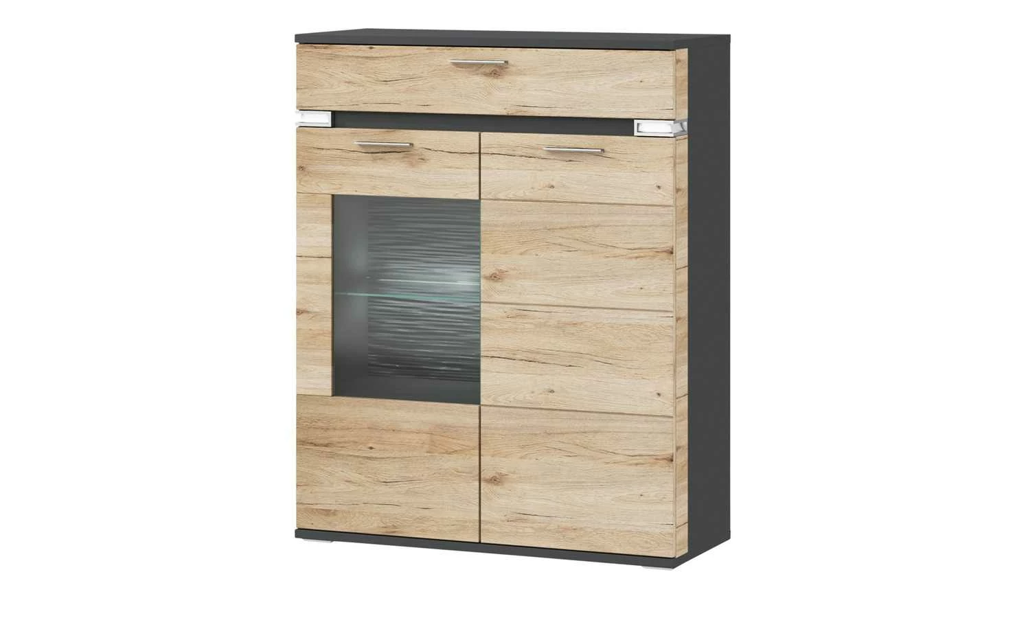 Innen praktisch und außen attraktiv – das ist das Highboard Katt von uno. Die große Schublade und der Platz hinter den beiden Türen bieten viel Fläche zum Unterbringen von Dingen des täglichen Lebens. In den beiden Vitrinenfächern können Sie Geschirr und Lieblingsstücke präsentieren. Sie sind durch das Klarglas gut zu sehen, gleichzeitig aber vor Staub geschützt. Eine Beleuchtung für den Glasboden ist im Lieferumfang enthalten. Katt setzt auf Farbkontraste. Um die Front in Eiche San Remo (Nachbildung) schön zur Geltung zu bringen, ist eine seitliche LED-Beleuchtung im Lieferumfang enthalten.