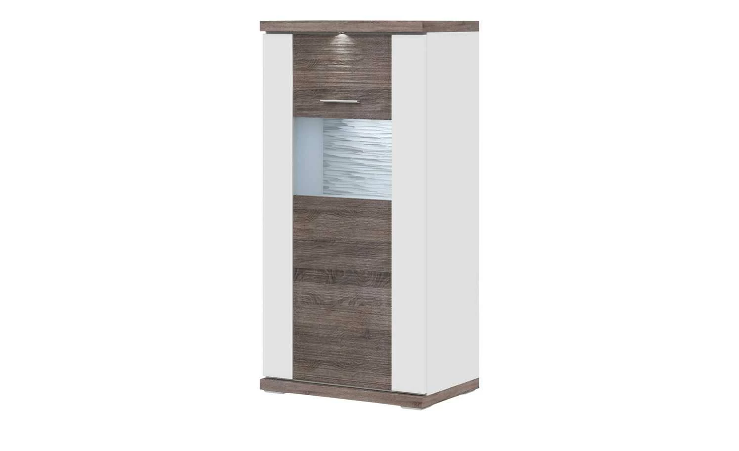 Drei Fächer mit viel Stauraum bietet Ihnen das Highboard Titan. Darüber hinaus hat es ein Vitrinenfach. Dieses können Sie zur Präsentation von besonders hübschem Geschirr nutzen. Titan hat einen strahlenden Weißton und wird dunkel abgesetzt – an der Front und an Oberplatte und Boden. Die mittigen Frontakzente haben eine Schropphobelung. Diese stellt einen tollen Kontrast zum Hochglanz der weißen Front dar. Eine LED-Beleuchtung ist im Lieferumfang enthalten.