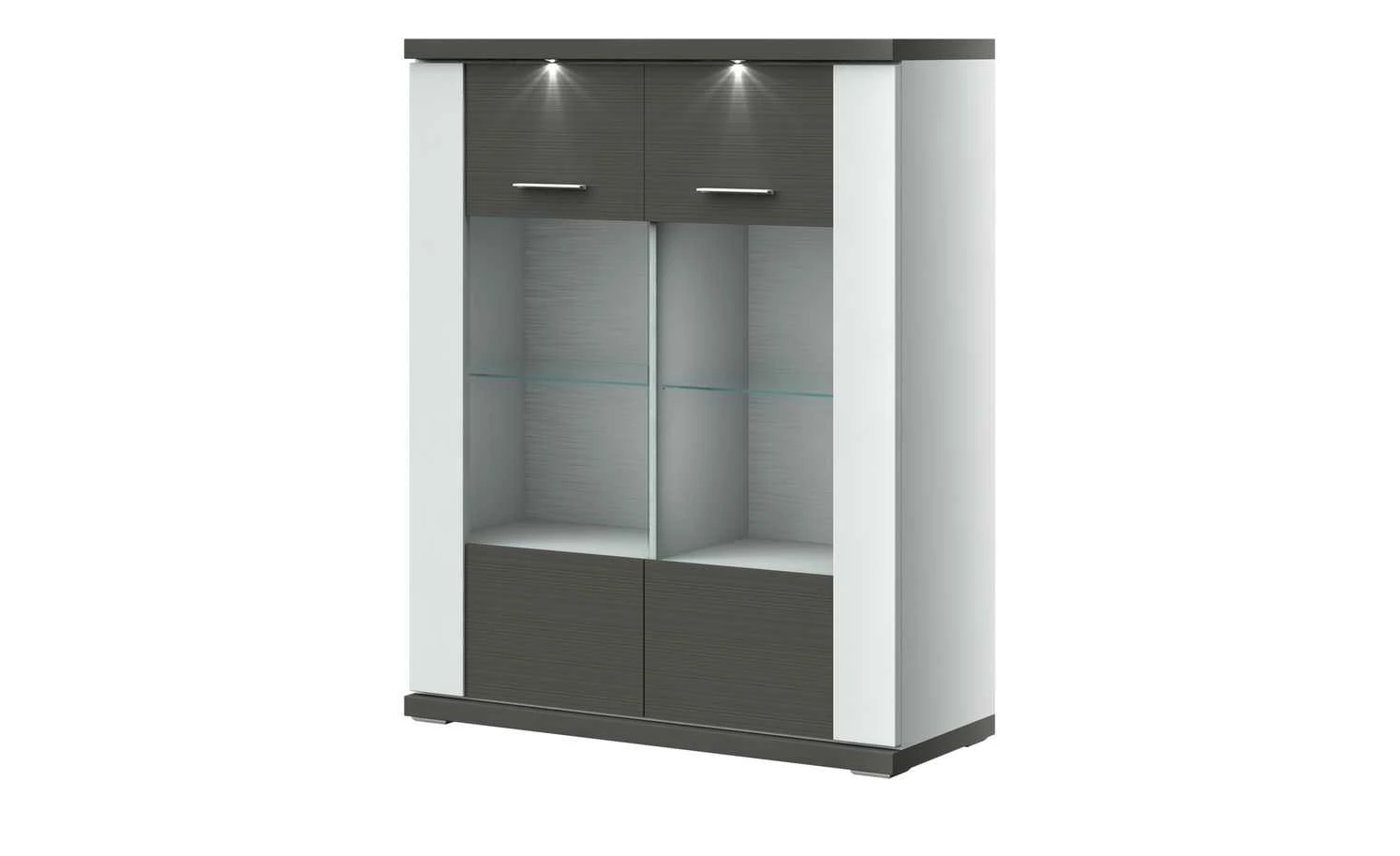 Hinter den beiden Türen bietet Titan viel Platz. Das Highboard hat vier Fächer, in die Sie durch die Glasabsetzungen der Türen schauen können. Darüber hinaus bietet Titan ihnen vier weitere Fächer, die nicht einsehbar sind. Die dunkel abgesetzten Fronten und die sichtbaren Rückwände sind mit einer Schropphobelung versehen worden. Titan wird mit einer Beleuchtung geliefert.