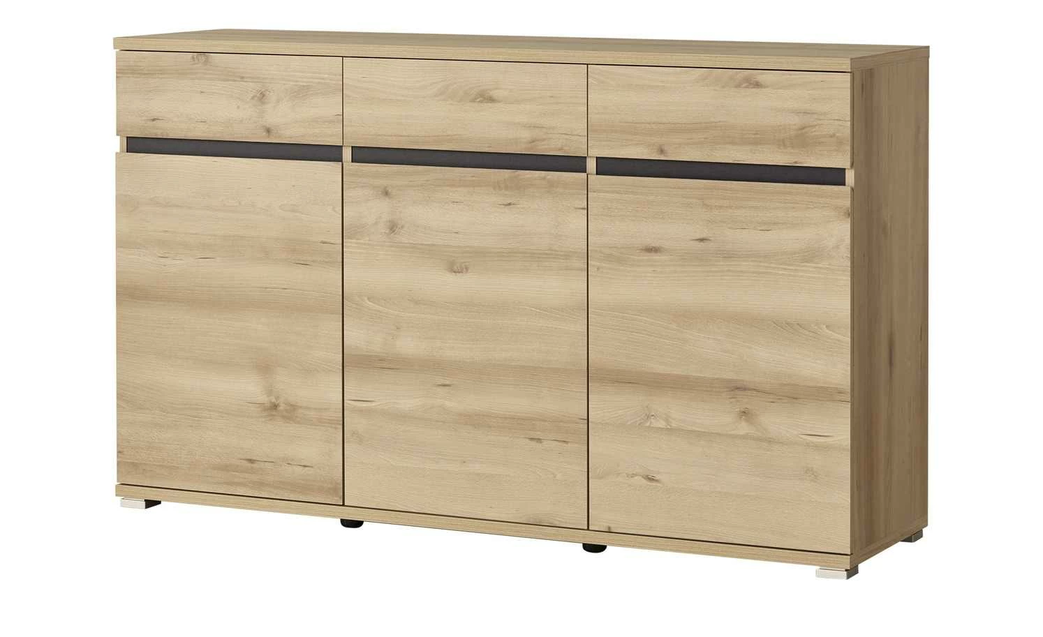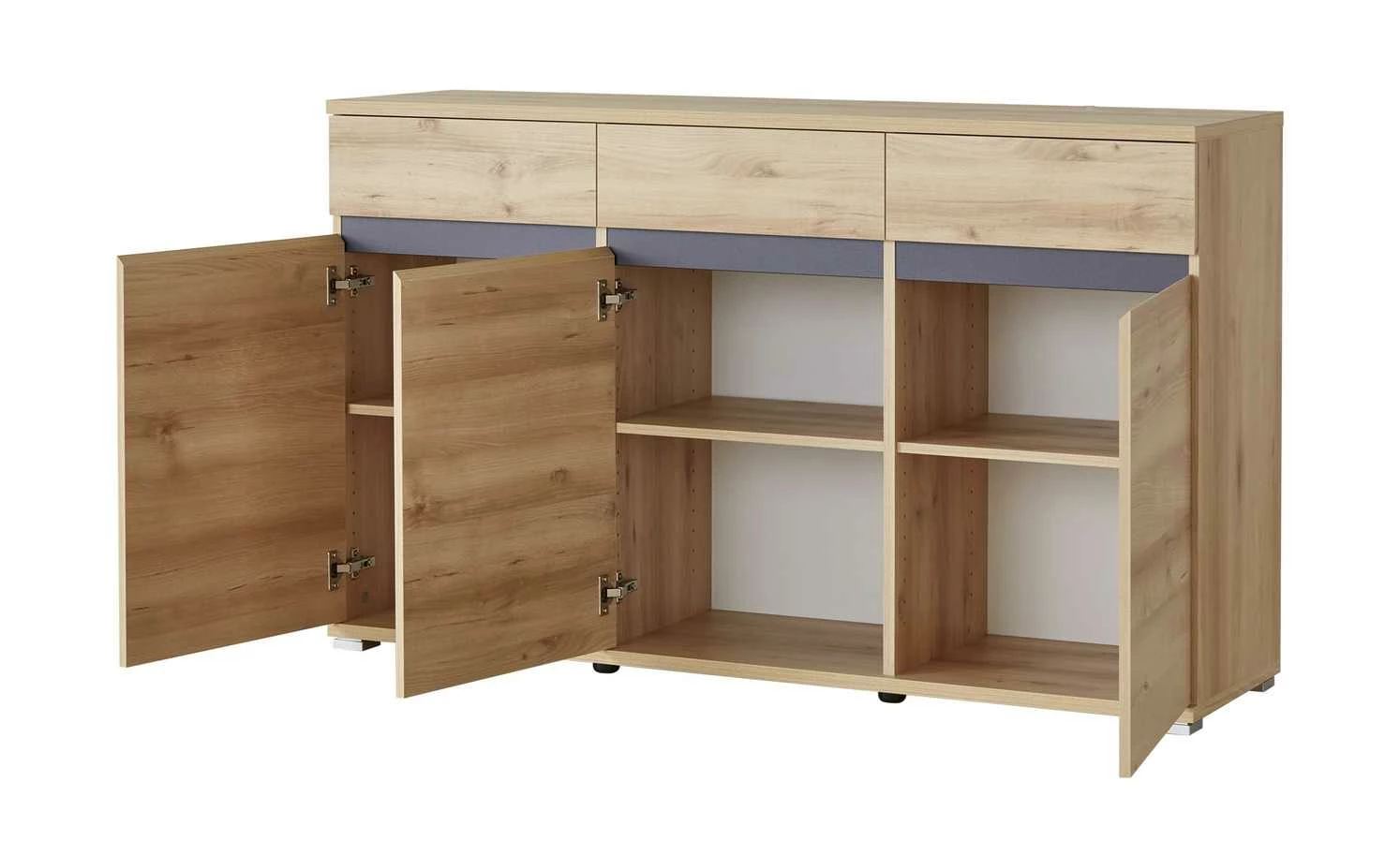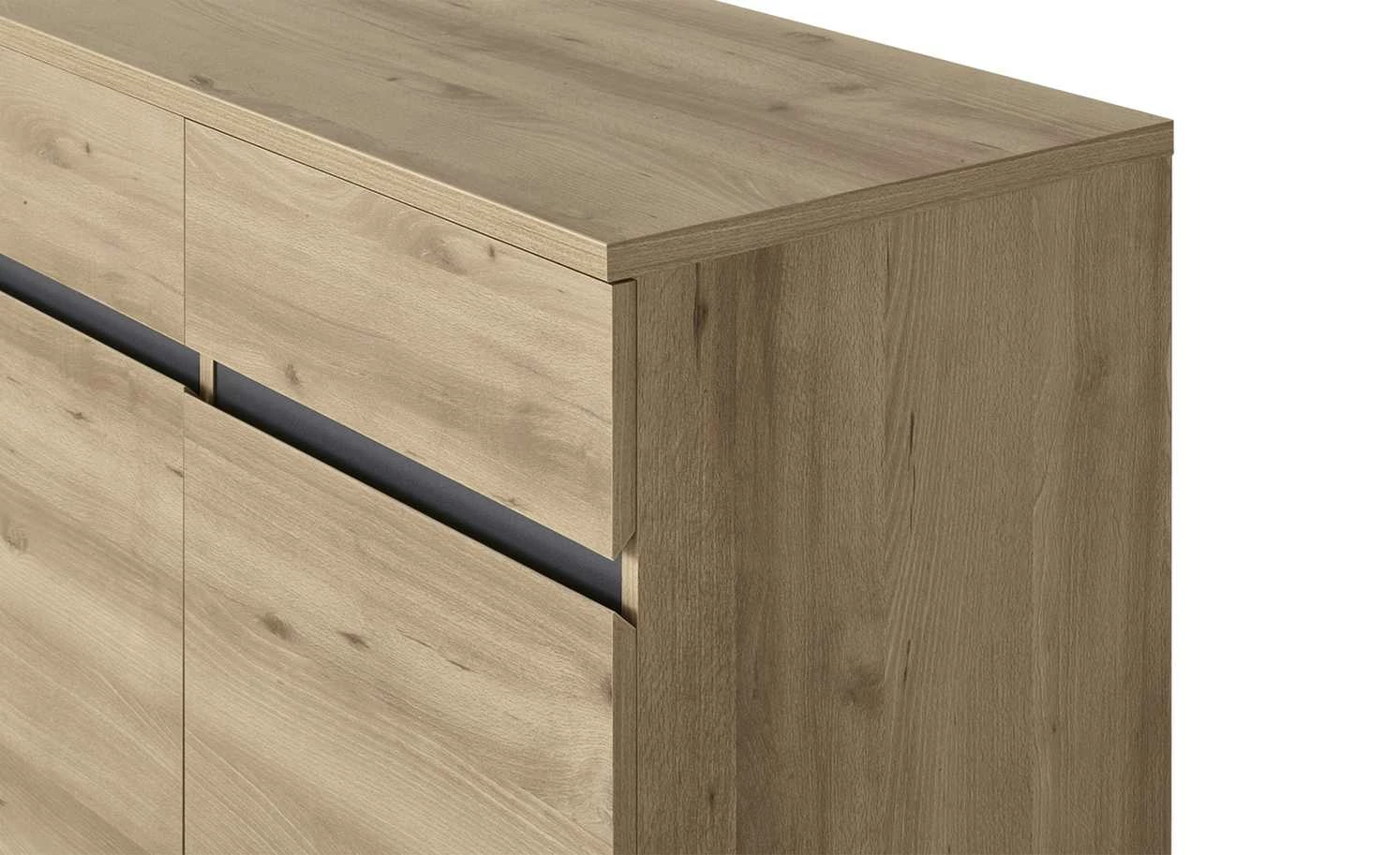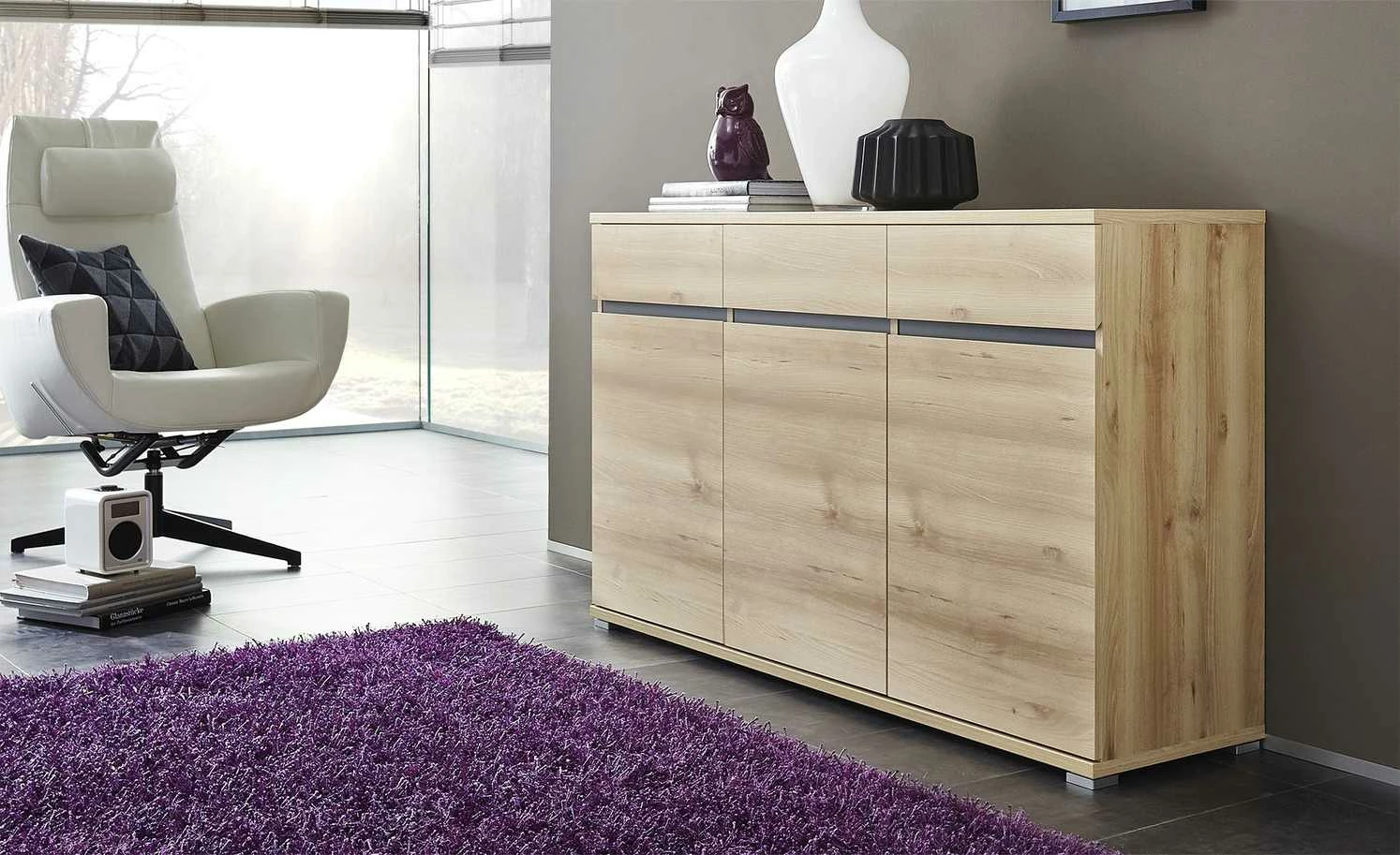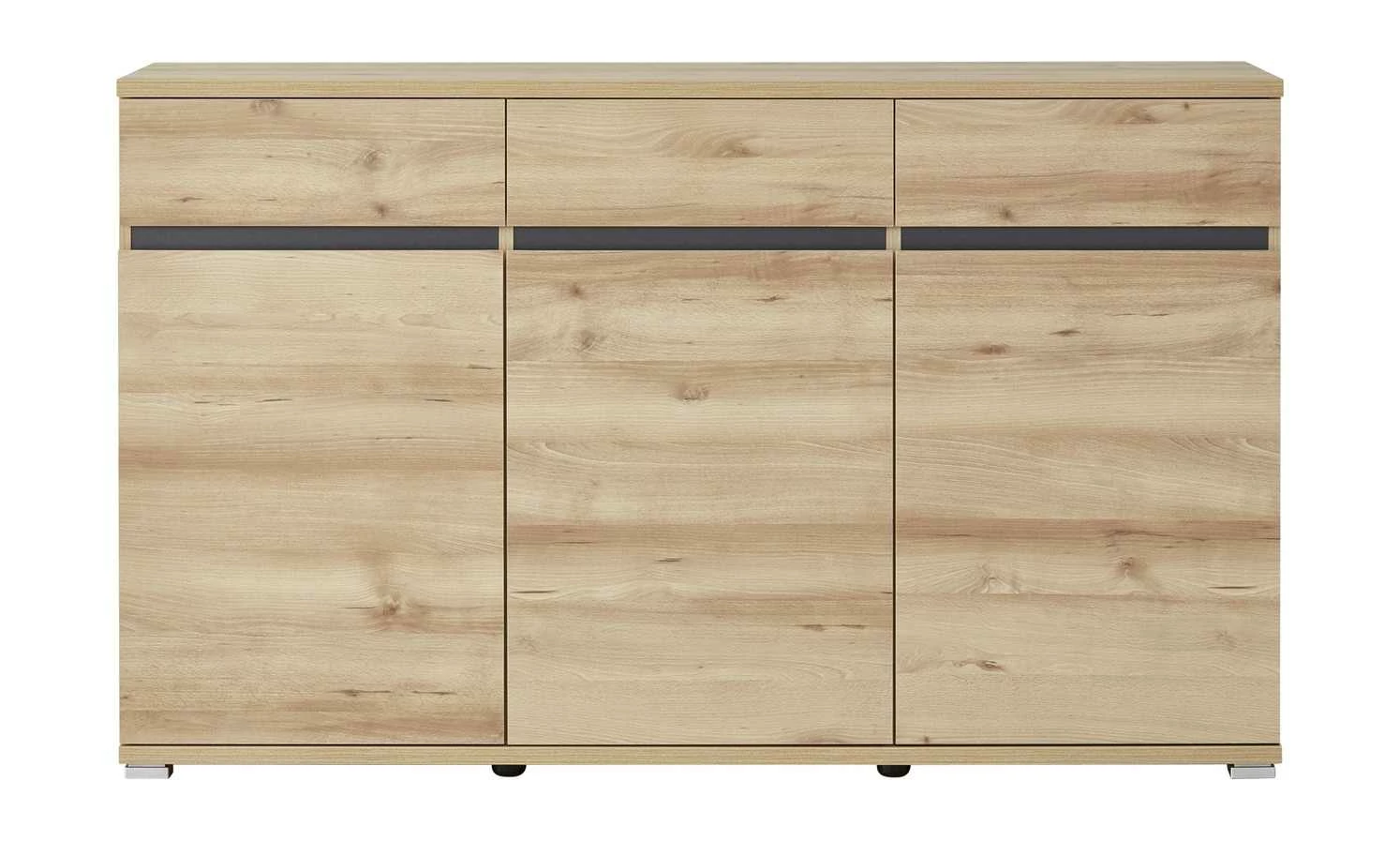 Diese Kommode in Edelbuche-Optik bietet hinter seinen 3 Türen und mit seinen 3 Schubladen jede Menge Stauraum. Durch sein schlichtes Design passt es sich gut an andere Einrichtungsgegenstände an. Daher kann man es in fast jedem Raum aufstellen, z.B. im Schlaf-, Jugend- und Wohnzimmer oder auch im Flur. Die hochwertigen ABS-Kanten sorgen dafür, dass das Möbelstück länger in seinem guten Zustand erhalten bleibt.
