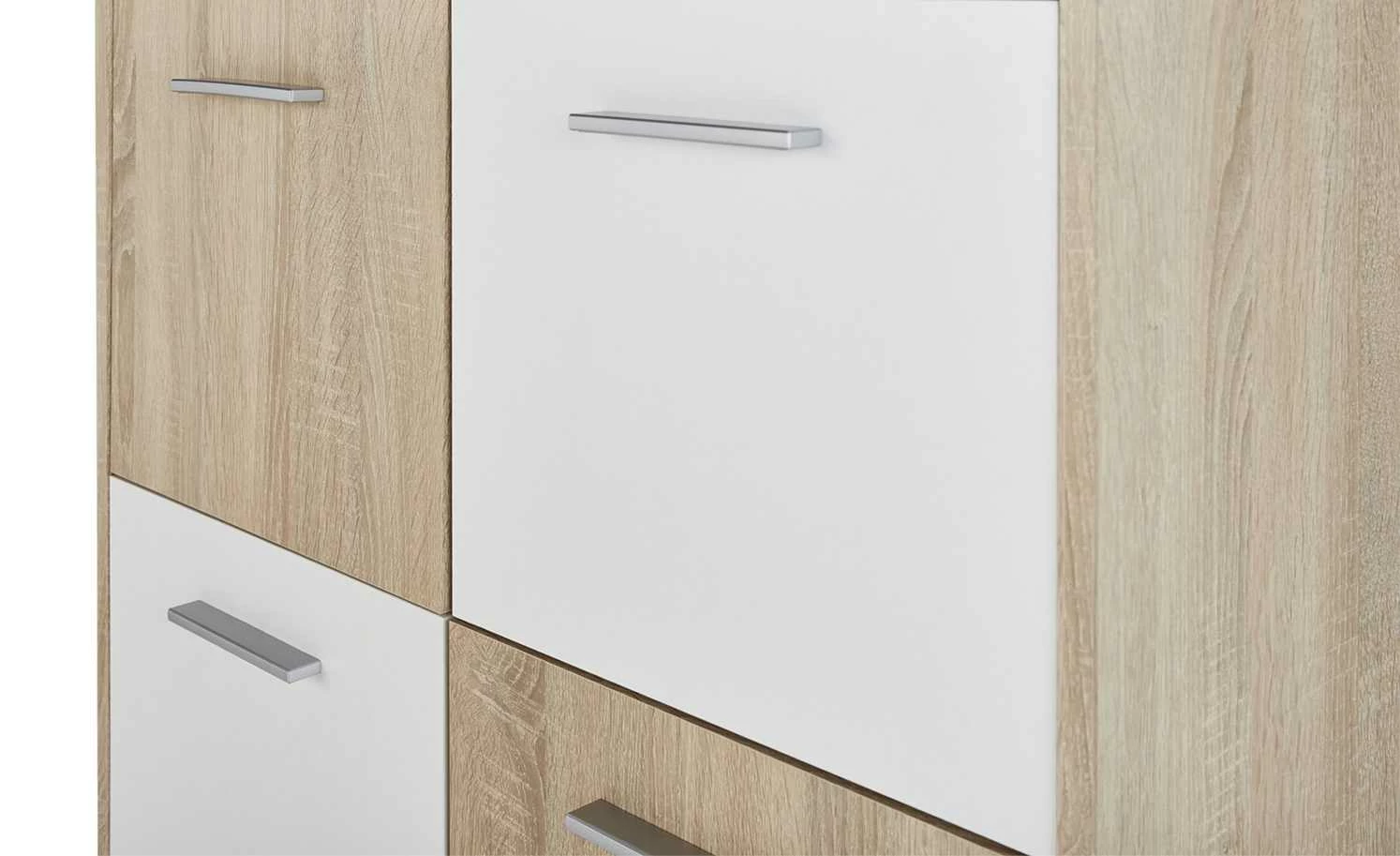 Stauraum ist gut, er sollte aber auch praktisch unterteilt sein. So wie bei der Kommode Quadro. Der Platz im Inneren unterteilt sich in sechs große Fächer mit Türen davor. Dadurch können Sie nicht nur viel verstauen, sondern finden es auch schnell wieder. Quadro hat ein Dekor in Eiche Sonoma (Nachbildung), Teile der Front setzen sich in Weiß ab. Dadurch ergibt sich ein Look, der an ein Schachbrett erinnert.