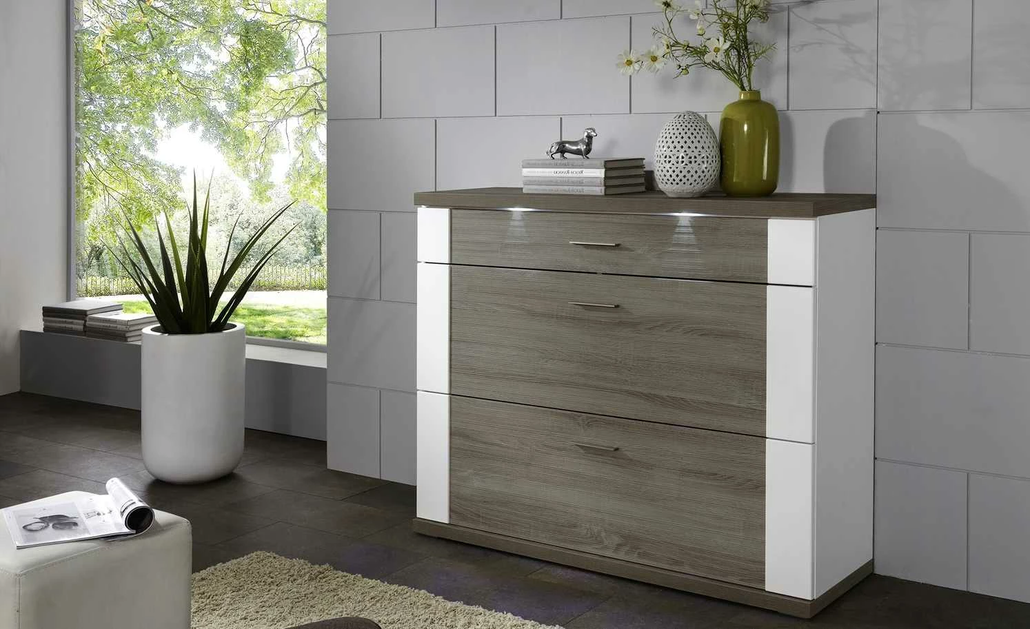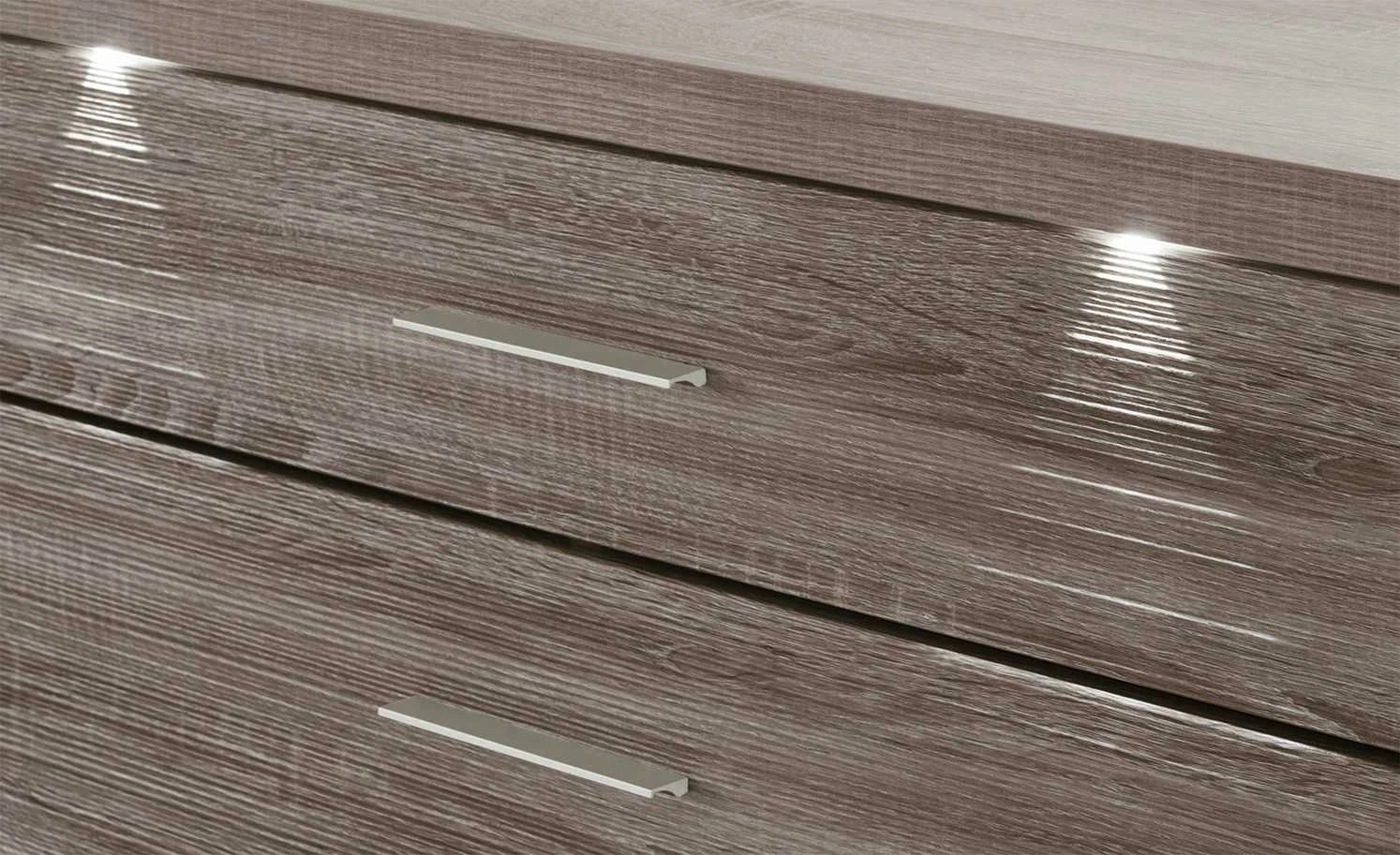 Die Kommode Titan von uno lässt sich wunderbar als Stauraum für Wohn- und Esszimmer nutzen. Sie ist mit drei Schubladen ausgestattet – zwei großen und einer etwas schmaleren. All drei erstrecken sich über die gesamte Breite der Kommode. Das Besondere: Alle drei sind mittig unterteilt, wodurch der Stauraum gleich besser sortiert wirkt. Titan ist in Eiche Trüffel (Nachbildung) und Weiß designt. Die Front hat eine geschroppte Optik, die an den Seiten vom Hochglanz abgesetzt wird. Zwei LED-Spots an der Front setzen Titan in Szene.