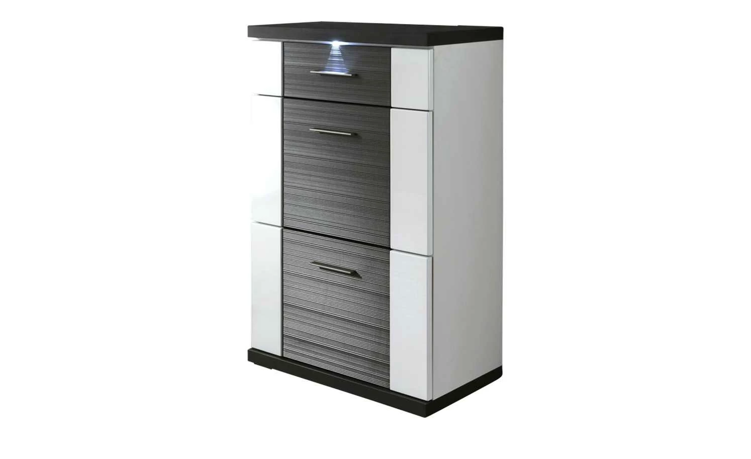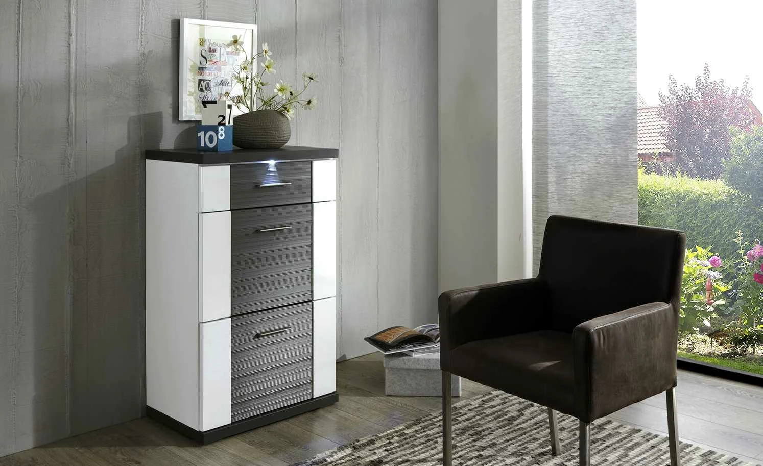 Die Kommode Titan von uno ist mit drei Schubladen ausgestattet. Während die obere etwas schmaler designt ist, sind die beiden unteren deutlich größer. Titan wird mit einer Beleuchtung für die Front geliefert, die diese schon inszeniert. Die geschroppten Oberflächen kommen dadurch gut zur Geltung und auch der Hochglanz seitlich davon. Bei der Kommode und auch den anderen Artikeln der Serie wird auf Kontraste gesetzt. Die weißen Flächen und das Dekor in Graphit (Nachbildung) ergeben ein stimmiges Bild.