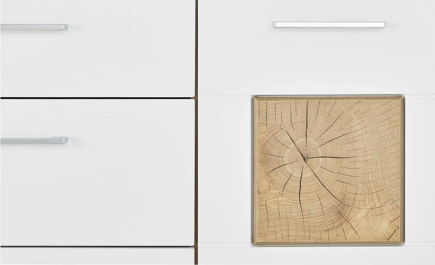 Modernes Design lässt sich wunderbar mit natürlichen Akzenten kombinieren. So wie bei der Kommode Yambio von uno. Die geradlinige Linienführung und weiße Front wirken modern, während sich der Korpus in rustikaler Eiche Altholz (Nachbildung) absetzt. Ein besonders interessanter Eyecatcher ist die Frontabsetzung in Hirnholz (Nachbildung). Sie greift die Optik eines aufgeschnittenen Baumstammes auf, bei der Sie die Jahresringe erkennen können. Yambio ist mit vier Schubladen und einer Tür ausgestattet. Alle vier Schübe verfügen über einen sanft schließenden Selbsteinzug, die Tür ist mit einer Soft-Close-Ausstattung versehen.