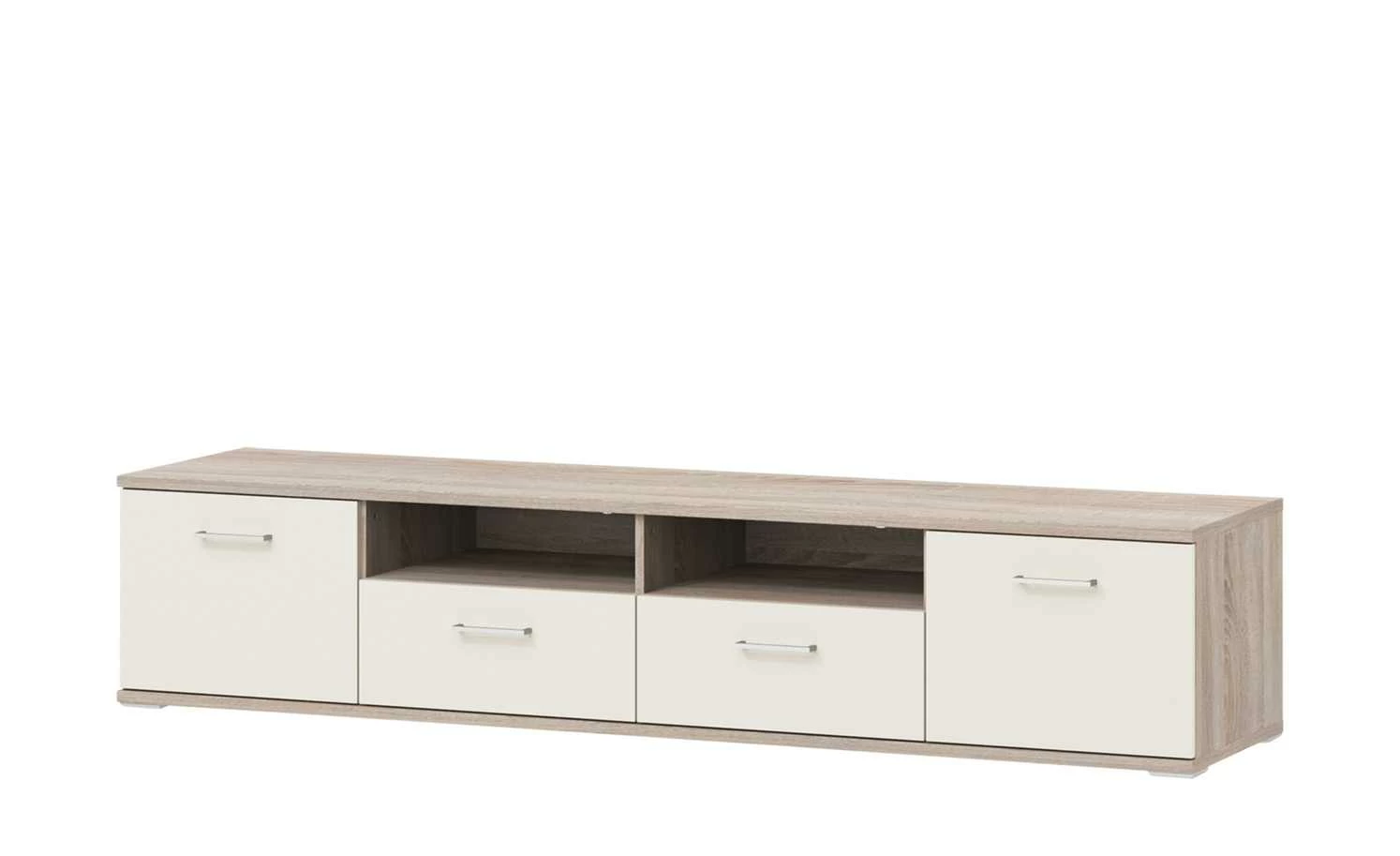 Das Lowboard Onyx von uno setzt auf ein flaches Design mit gleichzeitig viel Stauraum. Sie können es zum Beispiel als Stellfläche für Ihren Fernseher nutzen. Die zwei offenen Gerätefächer bieten sich für DVD-Player und Co. an. Die Rückwände der Fächer sind extra mit Kabelöffnung versehen worden, um Kabelsalat zu verhindern. In den beiden Schubfächern und hinter den beiden Türen können Sie zum Beispiel DVDs verstauen. Onyx ist auch optisch ansprechend: Der Korpus in Holzoptik wird durch die Hochglanzfront akzentuiert.