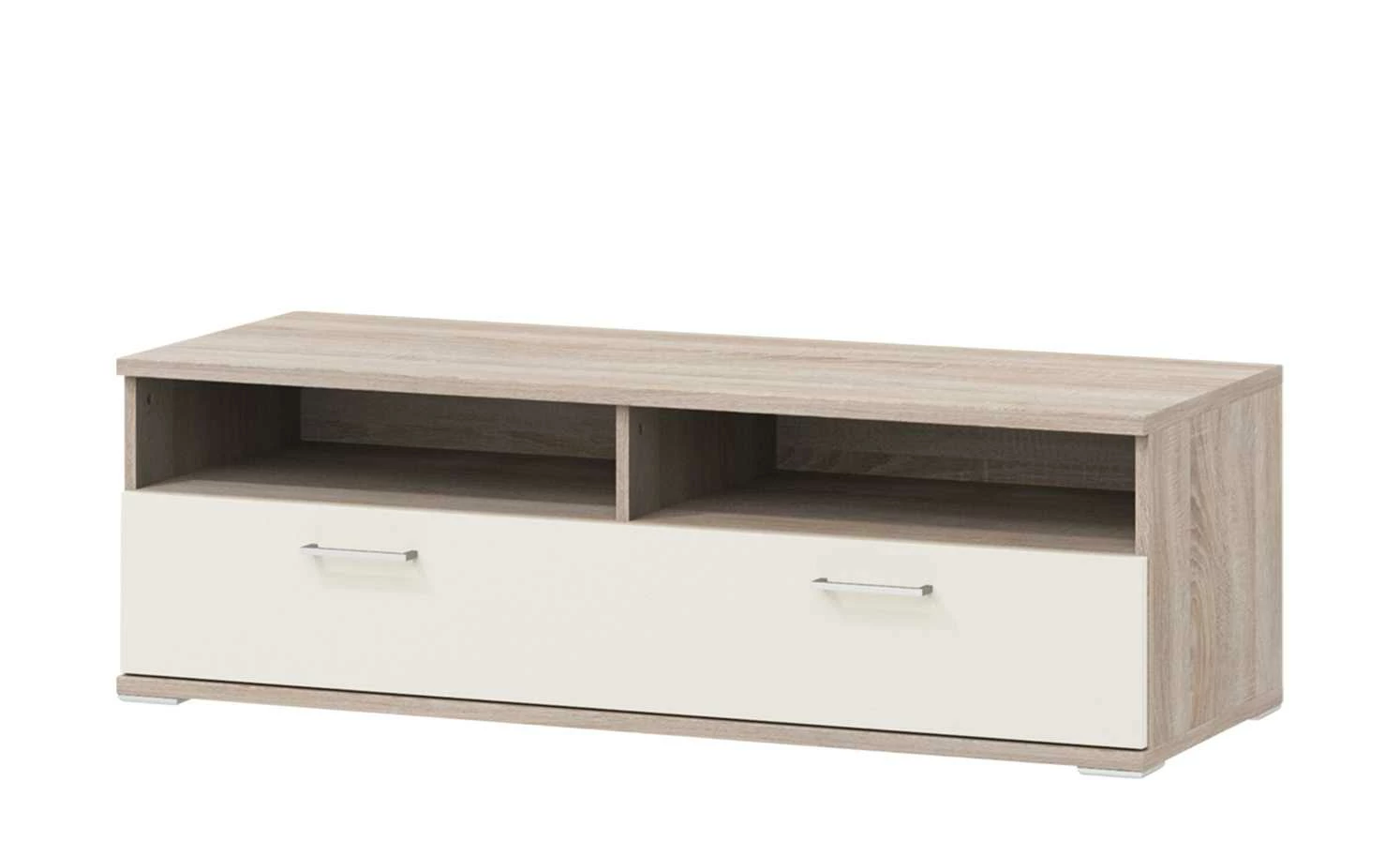Das Lowboard Onyx von uno bietet Stauraum und Stellfläche im Wohnraum. Sie können darauf zum Beispiel Ihren Fernseher platzieren. In den beiden offenen Fächern direkt darunter finden zum Beispiel Festplattenrecorder und Co. einen Platz. Onyx ist mit zwei Schubkästen ausgestattet. Das Besondere daran: Beide teilen sich eine Front, so dass ein ebenmäßiges Designt entsteht. Die Schubkästen sind mit einem Selbsteinzug und Soft-Close ausgestattet, wodurch sie sanft und leise schließen. Das Lowboard verfügt über einen melaminbeschichteten Korpus in Holzoptik. Die hochglänzende Front in Vanille setzt sich davon ab.