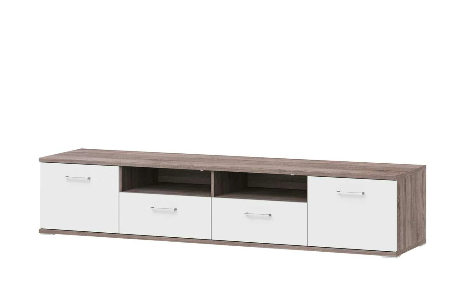 Das Lowboard Onyx von uno setzt auf ein flaches Design mit gleichzeitig viel Stauraum. Sie können es zum Beispiel als Stellfläche für Ihren Fernseher nutzen. Die zwei offenen Gerätefächer bieten sich für DVD-Player und Co. an. Die Rückwände der Fächer sind extra mit Kabelöffnung versehen worden, um Kabelsalat zu verhindern. In den beiden Schubfächern und hinter den beiden Türen können Sie zum Beispiel DVDs verstauen. Onyx ist auch optisch ansprechend: Der Korpus in Holzoptik wird durch die Hochglanzfront akzentuiert.