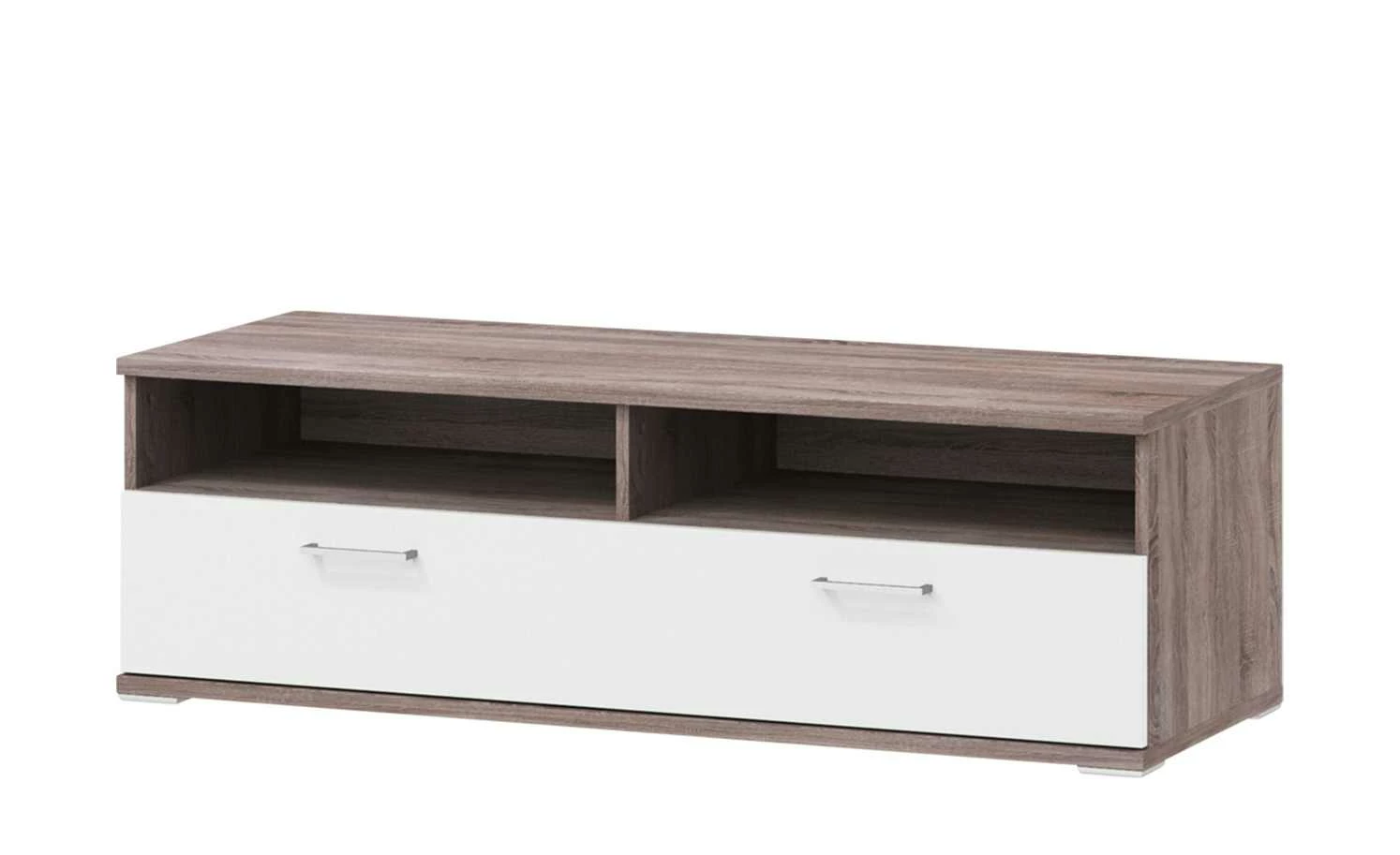Das Lowboard Onyx von uno bietet Stauraum und Stellfläche im Wohnraum. Sie können darauf zum Beispiel Ihren Fernseher platzieren. In den beiden offenen Fächern direkt darunter finden zum Beispiel Festplattenrecorder und Co. einen Platz. Onyx ist mit zwei Schubkästen ausgestattet. Das Besondere daran: Beide teilen sich eine Front, so dass ein ebenmäßiges Designt entsteht. Die Schubkästen sind mit einem Selbsteinzug und Soft-Close ausgestattet, wodurch sie sanft und leise schließen. Das Lowboard verfügt über einen melaminbeschichteten Korpus in Holzoptik. Die hochglänzende Front in Weiß setzt sich davon ab.