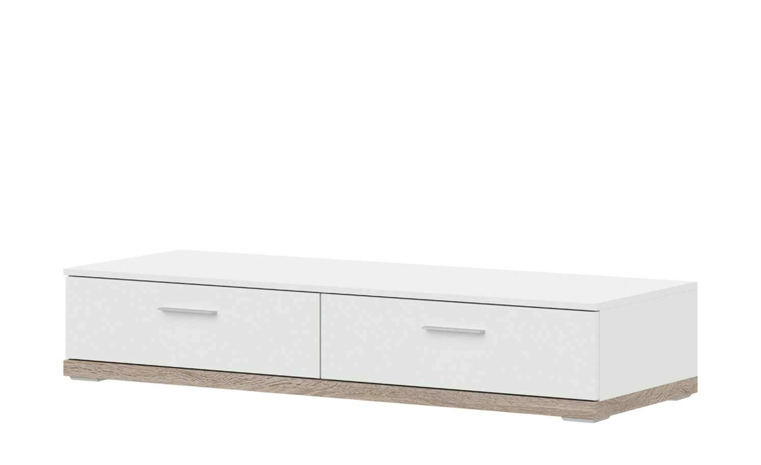 Das Lowboard Titan von uno kann als Stellfläche für Ihren Fernseher genutzt werden. Oder Sie platzieren darauf andere Dinge, wie beispielsweise Bücher, Deko oder auch eine Lampe. Titan ist mit zwei großen Schubladen ausgestattet, die nebeneinander angeordnet sind. Das Lowboard ist weiß und hat eine Front mit einem schönen Hochglanzfinish. Eine breite Absetzung im unteren Bereich von Front und Korpus setzt Akzente: Sie hat ein Dekor in Eiche sägerau (Nachbildung).