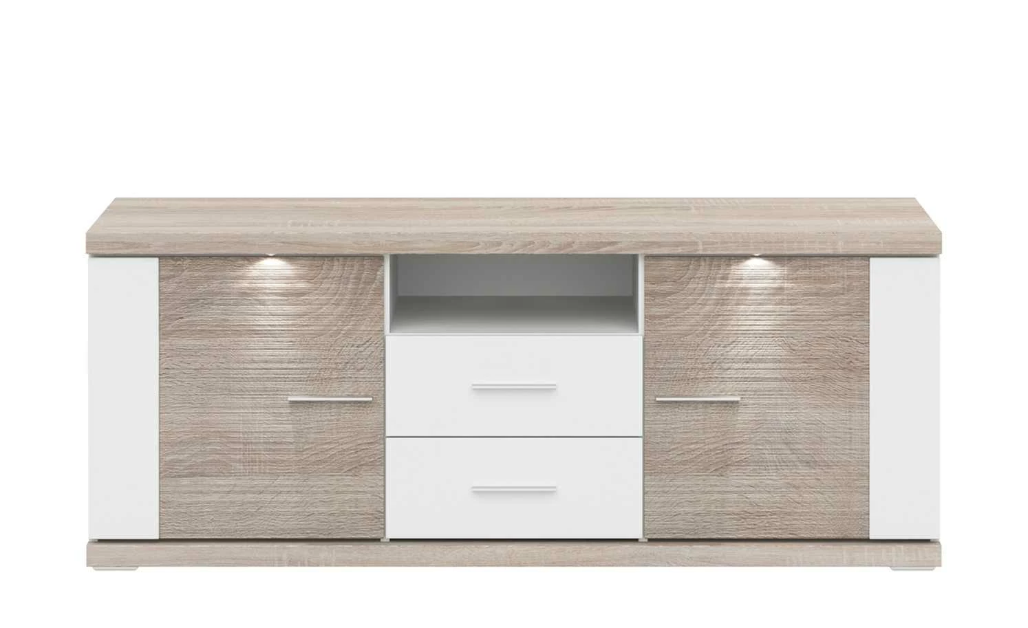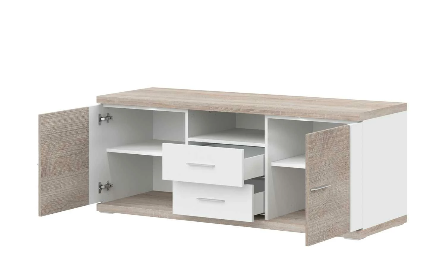Bringen Sie noch mehr Stauraum in Ihr Wohnzimmer – und zwar mit dem Lowboard Titan von uno. Links und rechts ist jeweils eine Tür mit je zwei Fächern zu finden. Mittig können Sie ein offenes Fach und zwei Schubladen nutzen. Titan ist zweifarbig gestaltet: Ein schönes Weiß wird mit Eiche sägerau (Nachbildung) kombiniert. An den Türfronten wird das dunkle Dekor durch eine geriffelte Optik akzentuiert. Die weißen Frontflächen haben ein edles Hochglanzfinish. Durch die LED-Spots an der Front wird Titan perfekt ausgeleuchtet.