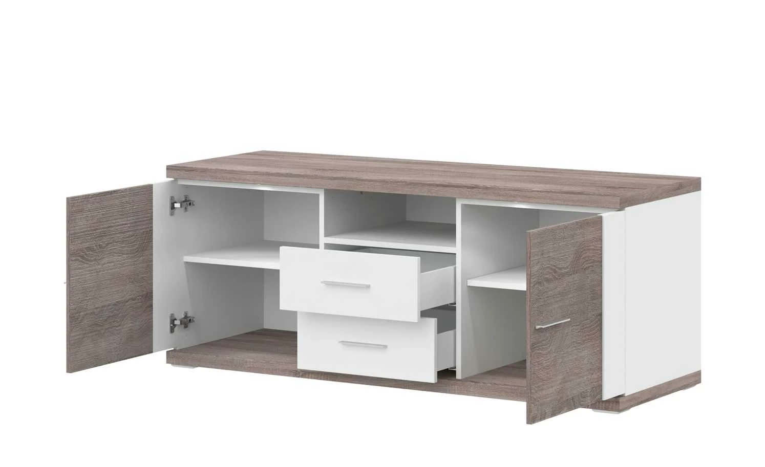 Bringen Sie noch mehr Stauraum in Ihr Wohnzimmer – und zwar mit dem Lowboard Titan von uno. Links und rechts ist jeweils eine Tür mit je zwei Fächern zu finden. Mittig können Sie ein offenes Fach und zwei Schubladen nutzen. Titan ist zweifarbig gestaltet: Ein schönes Weiß wird mit Eiche Trüffel (Nachbildung) kombiniert. An den Türfronten wird das dunkle Dekor durch eine geriffelte Optik akzentuiert. Die weißen Frontflächen haben ein edles Hochglanzfinish. Durch die LED-Spots an der Front wird Titan perfekt ausgeleuchtet.
