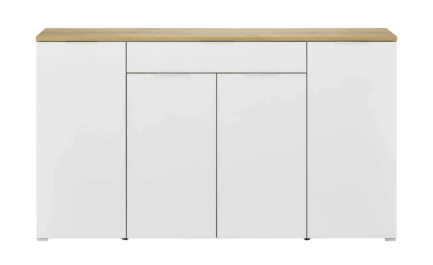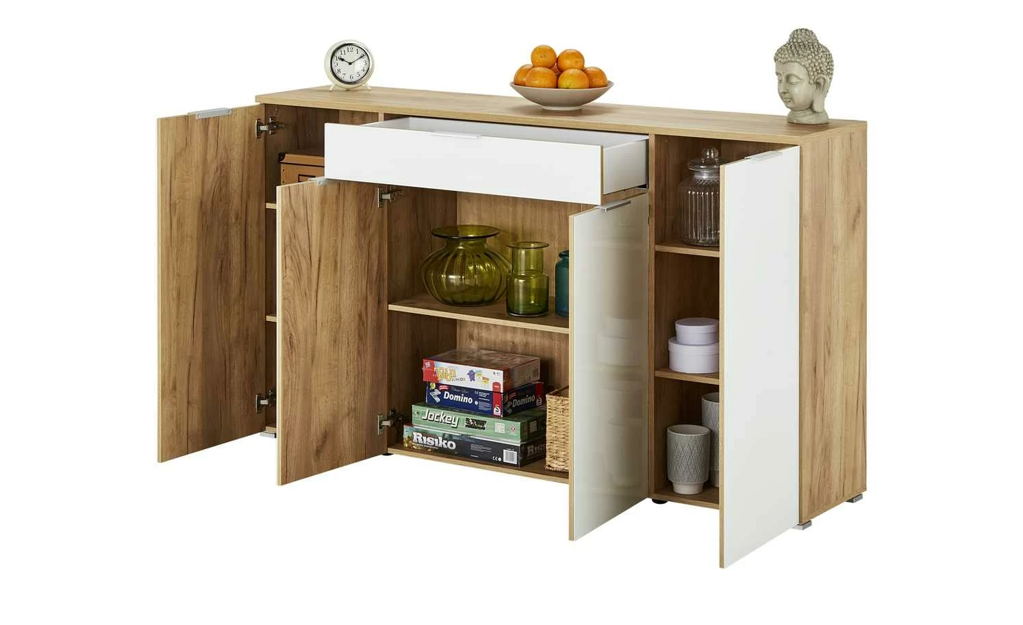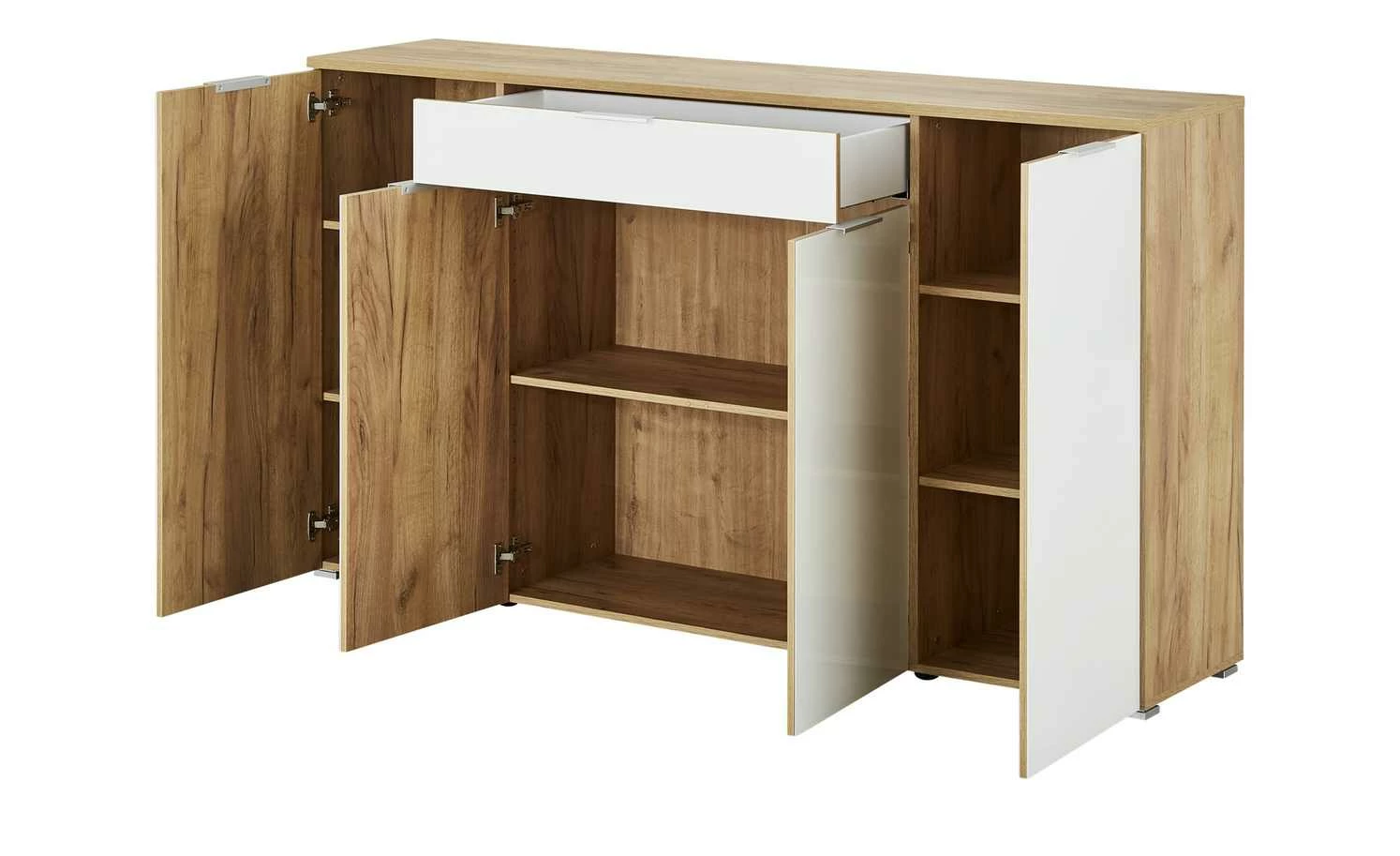 Stylisches Design und Funktionalität vereinen sich in der Kommode Bent von uno. Der Korpus ist in rustikaler Navarra Eiche (Nachbildung) gehalten. Die weiße Front setzt sich davon dekorativ ab. Sie ist aus Glas und hat einen leichten Glanz. Er hebt das Weiß hervor. Das Sicherheitsglas ist robust und kratzerunempfindlich – so wie auch der Korpus. Er ist mit strapazierfähigem Melamin beschichtet. Bent verfügt über eine Schublade und vier Türen. Dahinter befinden sich acht Fächer mit jeder Menge Stauraum.