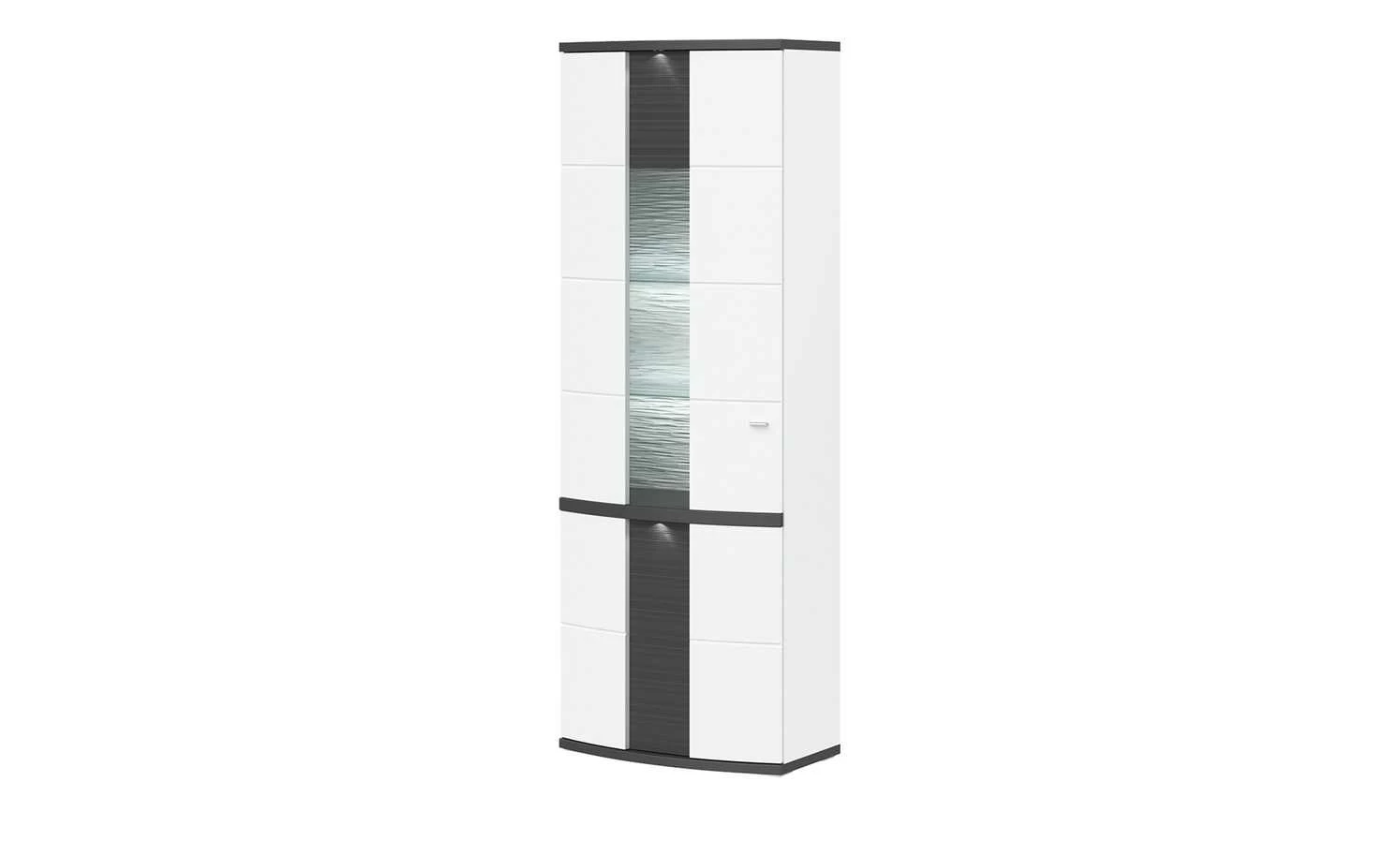 Die Vitrine Gabbro von uno bietet Stauraum – und Raum zum präsentieren Ihrer Lieblingsdeko. Dafür dienen die Vitrinenfächer. Die Tür ist in ihrer Höhe mit Klarglas abgesetzt, so dass Sie einen freien Blick in die Fächer haben. Aber auch Gabbro selbst ist dekorativ anzusehen. Der größte Teil ist in strahlendem Weiß gehalten. Die weiße Front ist zusätzlich mit einem Hochglanz versehen worden. Er bringt das Weiß zum Strahlen. Kontrastreich dazu: Die Absetzungen in geschroppter 3D-Optik. Der geriffelte Look findet sich übrigens auch bei der sichtbaren Rückwand wieder. Gabbro wird mit passender Front-Spotbeleuchtung geliefert. Sie setzt die Vitrine auch bei Dunkelheit in Szene.