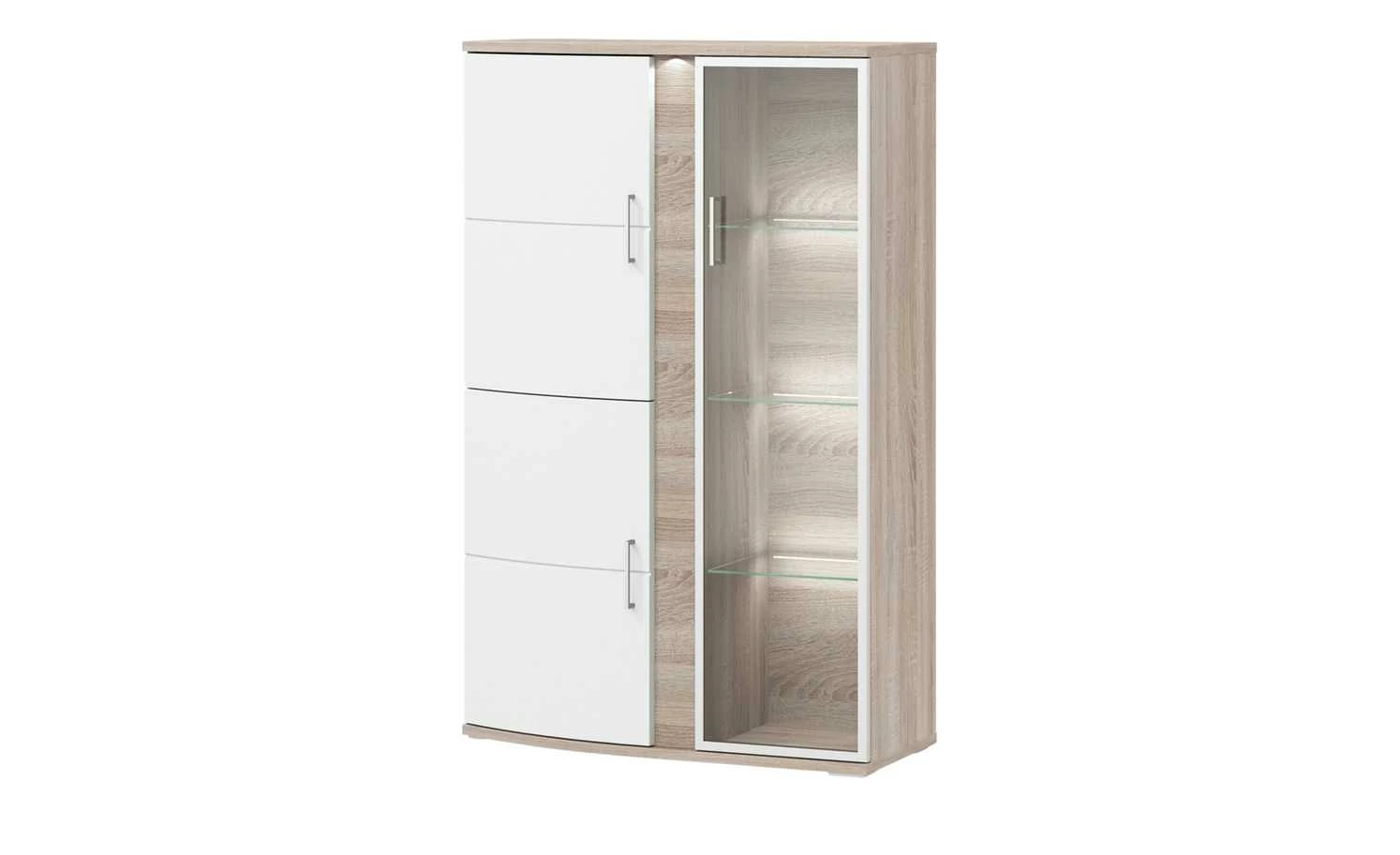 Die Vitrine Onyx von uno ist ein zweifaches Highlight. Sie bietet einsehbaren, aber auch nicht einsehbaren Stauraum. Eine der drei Türen aus Klarglas mit einem schmalen Alurahmen. Durch das Glas können Sie in die vier Vitrinenfächer sehen, die durch Glasböden voneinander getrennt sind. Hier ist genügend Platz, um Porzellan, dekorative Gläser und Urlaubssouvenirs zu präsentieren. Hinter den anderen beiden – nicht einsehbaren – Türen befindet sich weiterer Platz in vier Fächern. Onyx ist aber nicht nur praktisch, sondern auch dekorativ. Der Korpus in Holzoptik wird durch die Front in Weiß abgesetzt. Ein edles Hochglanzfinish sorgt für tolle Effekte. Mittig zwischen den Türen befindet sich eine Absetzung in Korpusoptik, die durch ihre geriffelte Oberfläche auffällt. Sie wird durch die Frontbeleuchtung toll in Szene gesetzt.