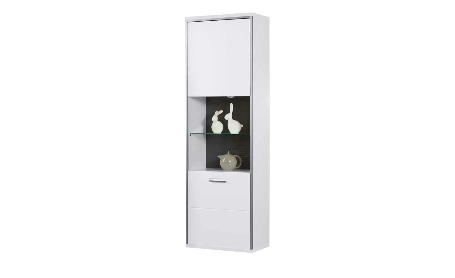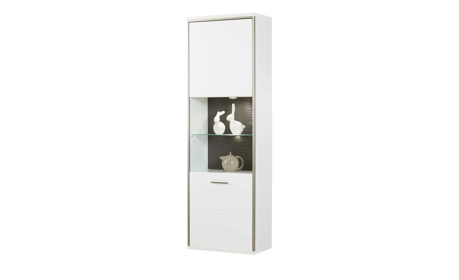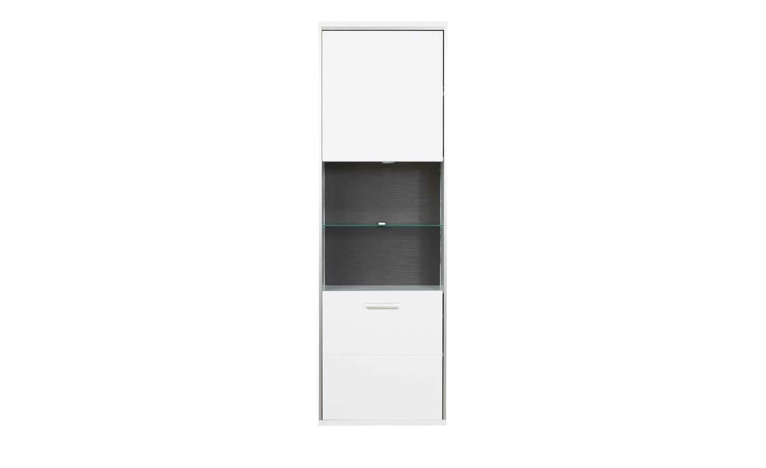 Die weiß-hochglänzende Vitrine Setto passt einfach in jede modern eingerichtete Wohnung. Veredelt wird die Vitrine durch einen edelstahlfarbenen Metallrahmen sowie eine graue Rückwand in 3D-Optik, welche durch den Glasteil der Türfront sichtbar ist. Die schicke Vitrine bietet so gleichzeitig Stauraum und Präsentationsfläche für Ihre Lieblingsstücke.