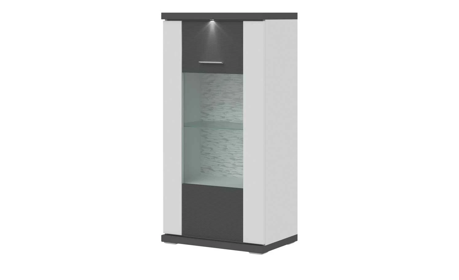 Zwei Vitrinenfächer für Deko und andere besondere Erinnerungsstücke bietet Ihnen die Vitrine Titan. Die beiden Fächer befinden sich mittig. Oben und unten sind weitere Fächer zu finden, die Stauraum bieten. Titan ist zweifarbig gestaltet. Das Weiß der Front hat ein modernes Hochglanzfinish. Die mittige, dunkle Absetzung der Front stellt nicht nur farblich einen Kontrast dar. Sie hat eine gehobelte 3D-Optik. Auch die Rückwand der Vitrinenfächer hat diese Schropphobelung – allerdings in Weiß. Eine Beleuchtung ist im Lieferumfang enthalten.