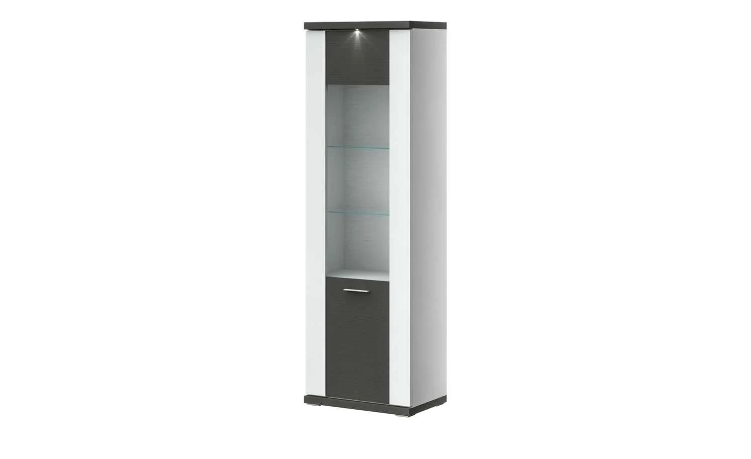 Mit ihrem modernen, zweifarbigen Design ist die Vitrine Titan ein Highlight für Wohnraum oder Esszimmer. Korpus und Front sind in Weiß gehalten. Die weiße Front fällt durch ihren Hochglanzlook auf. Einen schönen Kontrast dazu stellen Abdeck- und Bodenplatte und die Frontabsetzung dar. Sie sind dunkel gestaltet. Die dunkle Front hat eine auffällige Schropphobelung. Diese findet sich auch an den sichtbaren Rückwänden der Vitrine wieder. Hier ist die 3D-Optik allerdings in Weiß gehalten. Titan hat drei Vitrinenfächer. Nutzen Sie diese zum Beispiel für Ihr Lieblingsgeschirr oder besonders hübsche Dekorationen. Darüber hinaus stehen Ihnen drei weitere Fächer hinter der großen Tür zur Verfügung.