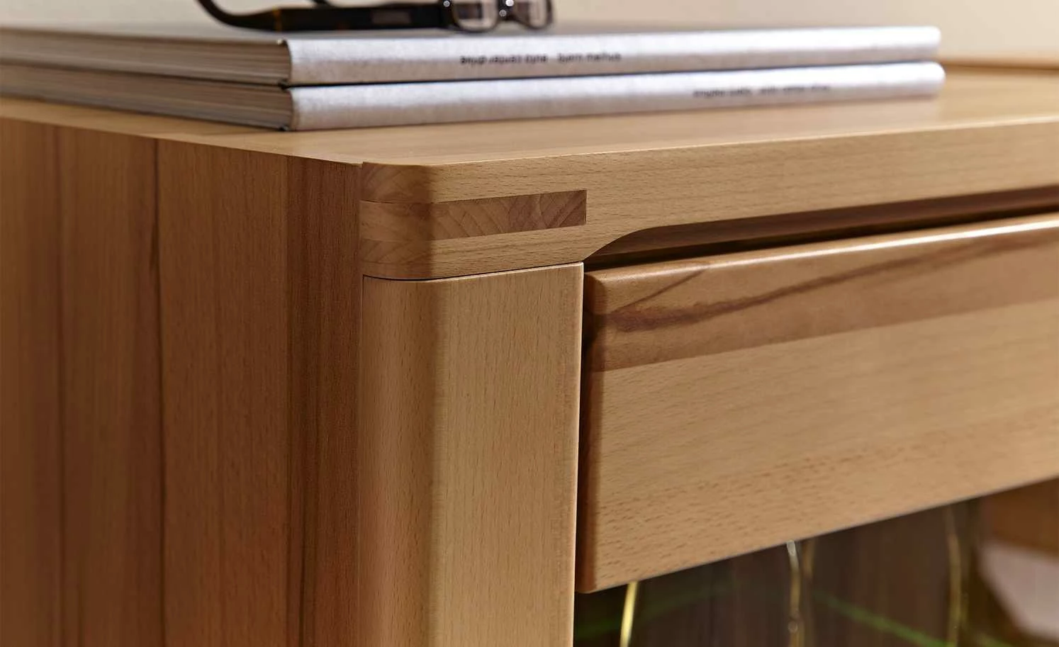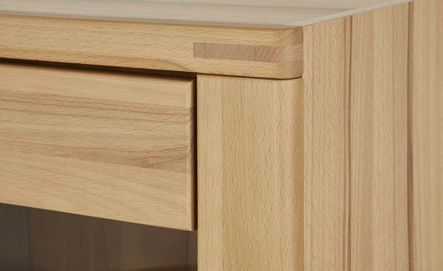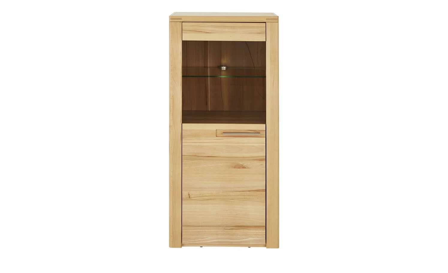 Kernbuche ist ein schön gemasertes Holz und macht sich wunderbar für Möbel. Das beweist die Vitrine Toscolano, für deren Front massive Kernbuche verwendet worden ist. Um es zu schützen, ist die Oberfläche mit einem Lack versiegelt worden. Der beschichtete Korpus der Vitrine ist passend zur Front in einem Kernbuchendekor (Nachbildung) designt. Die Beschichtung selbst ist besonders widerstandsfähig. Hinter der Drehtür verfügt Toscolano über vier Fächer. Die beiden oberen sind durch das Glas in der Tür einsehbar. Eine LED-Beleuchtung bringt die Fächer und deren Inhalt wunderbar zur Geltung.
