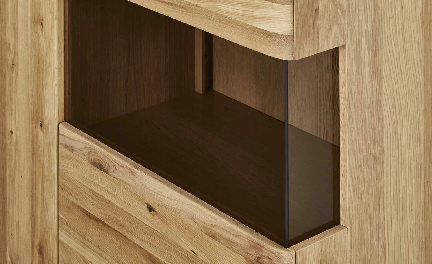 Asteiche zeichnet sich durch ihre prägnante Maserung aus. Sie verfügt über besonders viele Asteinschlüsse. Daher auch der Name. Das Highboard Astoria von Woodford besteht aus dem besonderen Material. Für die Front wurde massive Asteiche Bianco verwendet. Der Korpus ist furniert. Zum Schutz des Holzes ist die Oberfläche mit einem Öl behandelt worden. Die Front wird durch eine Absetzung aus Parsolglas aufgelockert. Hinter dem Glas befindet sich ein geräumiges Vitrinenfach. Darüber hinaus befinden sich hinter den beiden Türen insgesamt sieben Fächer.